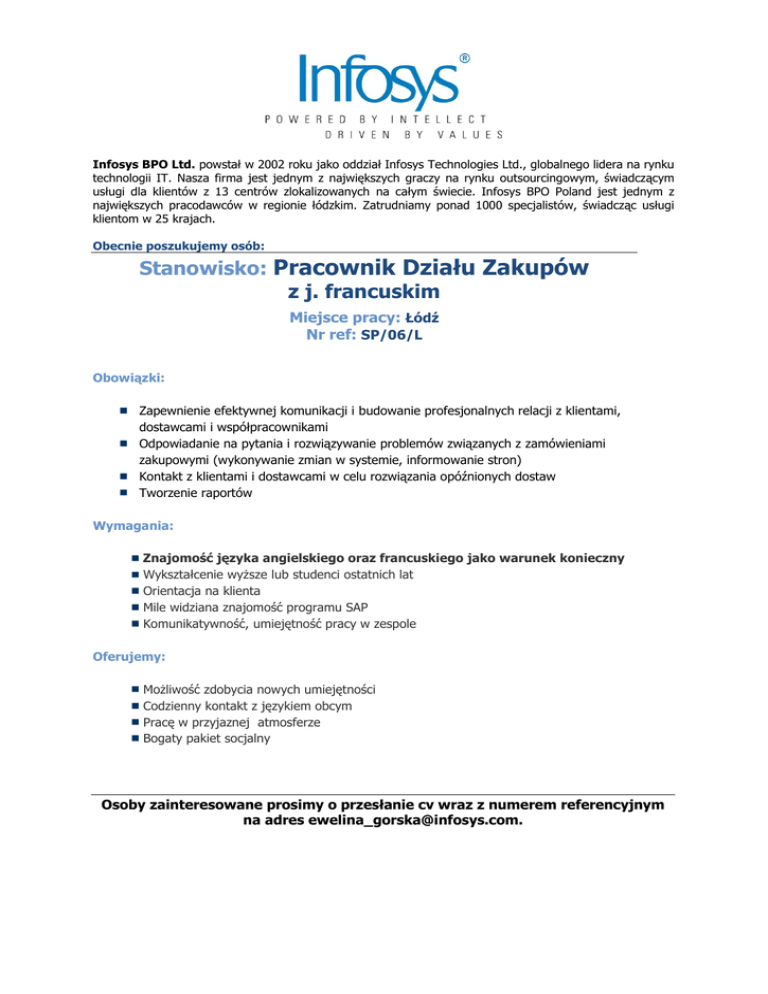 Infosys BPO Ltd. powstał w 2002 roku jako oddział Infosys Technologies Ltd., globalnego lidera na rynku technologii IT. Nasza firma jest jednym z największych graczy na rynku outsourcingowym, świadczącym usługi dla klientów z 13 centrów zlokalizowanych na całym świecie. Infosys BPO Poland jest jednym z największych pracodawców w regionie łódzkim. Zatrudniamy ponad 1000 specjalistów, świadcząc usługi klientom w 25 krajach. Obecnie poszukujemy osób: Stanowisko: Pracownik Działu Zakupów z j. francuskim Miejsce pracy: Łódź Nr ref: SP/06/L Obowiązki: Zapewnienie efektywnej komunikacji i budowanie profesjonalnych relacji z klientami, dostawcami i współpracownikami Odpowiadanie na pytania i rozwiązywanie problemów związanych z zamówieniami zakupowymi (wykonywanie zmian w systemie, informowanie stron) Kontakt z klientami i dostawcami w celu rozwiązania opóźnionych dostaw Tworzenie raportów Wymagania: Znajomość języka angielskiego oraz francuskiego jako warunek konieczny Wykształcenie wyższe lub studenci ostatnich lat Orientacja na klienta Mile widziana znajomość programu SAP Komunikatywność, umiejętność pracy w zespole Oferujemy: Możliwość zdobycia nowych umiejętności Codzienny kontakt z językiem obcym Pracę w przyjaznej atmosferze Bogaty pakiet socjalny Osoby zainteresowane prosimy o przesłanie cv wraz z numerem referencyjnym na adres [email protected].