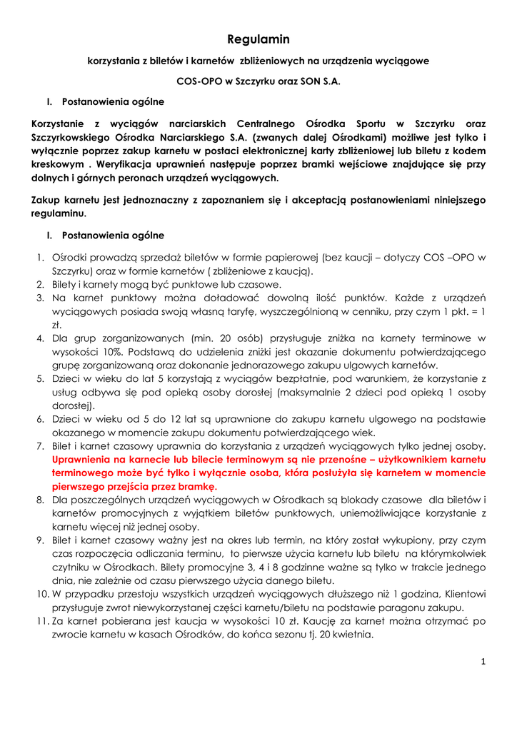 Regulamin korzystania z biletów i karnetów zbliżeniowych na urządzenia wyciągowe COS-OPO w Szczyrku oraz SON S.A. I. Postanowienia ogólne Korzystanie z wyciągów narciarskich Centralnego Ośrodka Sportu w Szczyrku oraz Szczyrkowskiego Ośrodka Narciarskiego S.A. (zwanych dalej Ośrodkami) możliwe jest tylko i wyłącznie poprzez zakup karnetu w postaci elektronicznej karty zbliżeniowej lub biletu z kodem kreskowym . Weryfikacja uprawnień następuje poprzez bramki wejściowe znajdujące się przy dolnych i górnych peronach urządzeń wyciągowych. Zakup karnetu jest jednoznaczny z zapoznaniem się i akceptacją postanowieniami niniejszego regulaminu. I. Postanowienia ogólne 1. Ośrodki prowadzą sprzedaż biletów w formie papierowej (bez kaucji – dotyczy COS –OPO w Szczyrku) oraz w formie karnetów ( zbliżeniowe z kaucją). 2. Bilety i karnety mogą być punktowe lub czasowe. 3. Na karnet punktowy można doładować dowolną ilość punktów. Każde z urządzeń wyciągowych posiada swoją własną taryfę, wyszczególnioną w cenniku, przy czym 1 pkt. = 1 zł. 4. Dla grup zorganizowanych (min. 20 osób) przysługuje zniżka na karnety terminowe w wysokości 10%. Podstawą do udzielenia zniżki jest okazanie dokumentu potwierdzającego grupę zorganizowaną oraz dokonanie jednorazowego zakupu ulgowych karnetów. 5. Dzieci w wieku do lat 5 korzystają z wyciągów bezpłatnie, pod warunkiem, że korzystanie z usług odbywa się pod opieką osoby dorosłej (maksymalnie 2 dzieci pod opieką 1 osoby dorosłej). 6. Dzieci w wieku od 5 do 12 lat są uprawnione do zakupu karnetu ulgowego na podstawie okazanego w momencie zakupu dokumentu potwierdzającego wiek. 7. Bilet i karnet czasowy uprawnia do korzystania z urządzeń wyciągowych tylko jednej osoby. Uprawnienia na karnecie lub bilecie terminowym są nie przenośne – użytkownikiem karnetu terminowego może być tylko i wyłącznie osoba, która posłużyła się karnetem w momencie pierwszego przejścia przez bramkę. 8. Dla poszczególnych urządzeń wyciągowych w Ośrodkach są blokady czasowe dla biletów i karnetów promocyjnych z wyjątkiem biletów punktowych, uniemożliwiające korzystanie z karnetu więcej niż jednej osoby. 9. Bilet i karnet czasowy ważny jest na okres lub termin, na który został wykupiony, przy czym czas rozpoczęcia odliczania terminu, to pierwsze użycia karnetu lub biletu na którymkolwiek czytniku w Ośrodkach. Bilety promocyjne 3, 4 i 8 godzinne ważne są tylko w trakcie jednego dnia, nie zależnie od czasu pierwszego użycia danego biletu. 10. W przypadku przestoju wszystkich urządzeń wyciągowych dłuższego niż 1 godzina, Klientowi przysługuje zwrot niewykorzystanej części karnetu/biletu na podstawie paragonu zakupu. 11. Za karnet pobierana jest kaucja w wysokości 10 zł. Kaucję za karnet można otrzymać po zwrocie karnetu w kasach Ośrodków, do końca sezonu tj. 20 kwietnia. 1 12. Wejście na teren Ośrodków, a także posługiwanie się biletem lub karnetem jest jednoznaczne z zapoznaniem się i akceptacją z niniejszego regulaminu oraz innymi regulaminami obowiązującymi na terenie Ośrodków. 13. W przypadku karnetu z zakupionymi punktami (karnetów punktowych), czytnik bramki przejścia na kolej lub wyciąg (zwanej w dalszej części regulaminu – bramką) rejestruje przejście i odejmuje wynikającą z cennika ilość punktów od punktów znajdujących się na karnecie punktowym. 14. Niewykorzystane punkty podlegają zwrotowi w kasach ośrodka do końca sezonu tj. do 20 kwietnia za wyjątkiem punktów promocyjnych. Po upływie w/w okresu punkty ulegają kasacji. 15. Za sezon uważa się okres od 01 grudnia do 20 kwietnia następnego roku. II. KORZYSTANIE Z BRAMEK 1. Karnet należy włożyć do kieszeni umiejscowionej po lewej stronie ubioru, w zasięgu anteny bramki. 2. Przedmioty mogące zakłócać odczyt karnetu, (np. telefony komórkowe, kluczyki samochodowe, karty płatnicze i kredytowe i.t.p.) należy umieścić po prawej stronie ubioru. 3. W czasie korzystania z bramek należy posiadać przy sobie tylko jeden karnet. Ośrodki nie ponoszą odpowiedzialności za konsekwencje wynikające z nieprzestrzegania tego nakazu. 4. W polu oddziaływania anteny bramki należy pozostać, aż do momentu, kiedy czytnik odejmie odpowiednią ilość punktów lub potwierdzi termin obowiązywania uprawnień. 5. Potwierdzenie uprawnienia do przejścia przez bramkę i odczytania karnetu zostanie zasygnalizowane odpowiednim komunikatem na wyświetlaczu czytnika i zapaleniem się zielonego światła na obudowie bramki. 6. Zapalenie się czerwonego światła sygnalizacyjnego na obudowie bramki oznacza zakaz przejścia przez bramkę. 7. Po przejściu przez bramkę na podstawie karty terminowej, automatycznie uruchamia się czasowa blokada karty, uniemożliwiająca korzystanie z tej samej karty innym osobom. 8. Prosimy o zwracanie uwagi na sygnały dźwiękowe i komunikaty wyświetlane na ekranie czytnika bramki. 9. Kontrola video. Funkcjonujący w Ośrodkach elektroniczny system karnetów weryfikuje użytkowników posługujących się karnetami terminowymi. W trakcie przejść przez bramki rejestrowane są zdjęcia użytkownika powiązanego z danym karnetem. Zdjęcia przechowywane są do 7 dni od daty upłynięcia terminu ważności karnetu. Zakup i posługiwanie się kartą jest równoznaczne z wyrażeniem zgody na wykorzystanie i rejestrowanie wizerunku do celów kontrolnych. 10. W przypadku nieprzestrzegania postanowień niniejszego regulaminu oraz regulaminu Ośrodków, łamania zasad Kodeksu narciarskiego FIS, próby wyłudzenia przejścia, posługiwania się karnetem przez osobę nieuprawnioną karnet zostanie zablokowany, a posiadaczowi przysługuje prawo tylko i wyłącznie do zwrotu kaucji. 2 III. REKLAMACJE I ZWROTY 1. 2. 3. 4. 5. 6. 7. 8. 9. Złe warunki narciarskie i atmosferyczne oraz znaczna frekwencja na kolejach i wyciągach nie stanowią podstawy do całkowitego i 