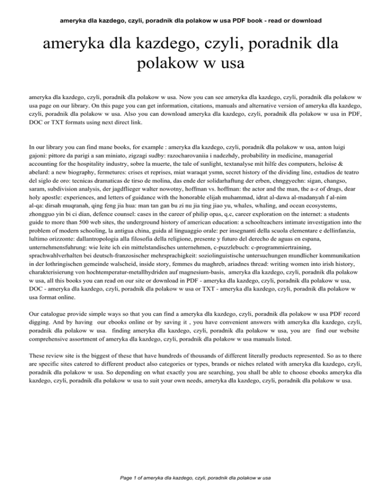 ameryka dla kazdego, czyli, poradnik dla polakow w usa PDF book - read or download ameryka dla kazdego, czyli, poradnik dla polakow w usa ameryka dla kazdego, czyli, poradnik dla polakow w usa. Now you can see ameryka dla kazdego, czyli, poradnik dla polakow w usa page on our library. On this page you can get information, citations, manuals and alternative version of ameryka dla kazdego, czyli, poradnik dla polakow w usa. Also you can download ameryka dla kazdego, czyli, poradnik dla polakow w usa in PDF, DOC or TXT formats using next direct link. In our library you can find mane books, for example : ameryka dla kazdego, czyli, poradnik dla polakow w usa, anton luigi gajoni: pittore da parigi a san miniato, zigzagi sudby: razocharovaniia i nadezhdy, probability in medicine, managerial accounting for the hospitality industry, sobre la muerte, the tale of sunlight, textanalyse mit hilfe des computers, heloise & abelard: a new biography, fermetures: crises et reprises, miat waraqat ysmn, secret history of the dividing line, estudios de teatro del siglo de oro: tecnicas dramaticas de tirso de molina, das ende der solidarhaftung der erben, chnggyechn: sigan, changso, saram, subdivision analysis, der jagdflieger walter nowotny, hoffman vs. hoffman: the actor and the man, the a-z of drugs, dear holy apostle: experiences, and letters of guidance with the honorable elijah muhammad, idrat al-dawa al-madanyah f al-nim al-qa: dirsah muqranah, qing feng jia hua: man tan gan bu zi nu jia ting jiao yu, whales, whaling, and ocean ecosystems, zhongguo yin bi ci dian, defence counsel: cases in the career of philip opas, q.c, career exploration on the internet: a students guide to more than 500 web sites, the underground history of american education: a schoolteachers intimate investigation into the problem of modern schooling, la antigua china, guida al linguaggio orale: per insegnanti della scuola elementare e dellinfanzia, lultimo orizzonte: dallantropologia alla filosofia della religione, presente y futuro del derecho de aguas en espana, unternehmensfuhrung: wie leite ich ein mittelstandisches unternehmen, c-puzzlebuch: c-programmiertraining, sprachwahlverhalten bei deutsch-franzosischer mehrsprachigkeit: soziolinguistische untersuchungen mundlicher kommunikation in der lothringischen gemeinde walscheid, inside story, femmes du maghreb, ariadnes thread: writing women into irish history, charakterisierung von hochtemperatur-metallhydriden auf magnesium-basis, ameryka dla kazdego, czyli, poradnik dla polakow w usa, all this books you can read on our site or download in PDF - ameryka dla kazdego, czyli, poradnik dla polakow w usa, DOC - ameryka dla kazdego, czyli, poradnik dla polakow w usa or TXT - ameryka dla kazdego, czyli, poradnik dla polakow w usa format online. Our catalogue provide simple ways so that you can find a ameryka dla kazdego, czyli, poradnik dla polakow w usa PDF record digging. And by having our ebooks online or by saving it , you have convenient answers with ameryka dla kazdego, czyli, poradnik dla polakow w usa. finding ameryka dla kazdego, czyli, poradnik dla polakow w usa, you are find our website comprehensive assortment of ameryka dla kazdego, czyli, poradnik dla polakow w usa manuals listed. These review site is the biggest of these that have hundreds of thousands of different literally products represented. So as to there are specific sites catered to different product also categories or types, brands or niches related with ameryka dla kazdego, czyli, poradnik dla polakow w usa. So depending on what exactly you are searching, you shall be able to choose ebooks ameryka dla kazdego, czyli, poradnik dla polakow w usa to suit your own needs, ameryka dla kazdego, czyli, poradnik dla polakow w usa. Page 1 of ameryka dla kazdego, czyli, poradnik dla polakow w usa