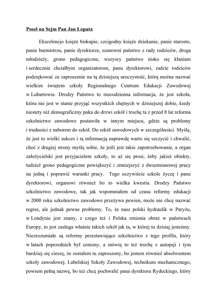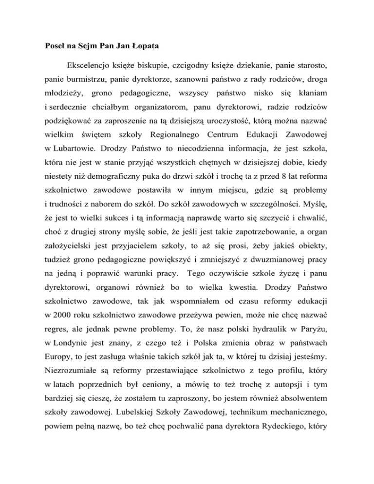 Poseł na Sejm Pan Jan Łopata Ekscelencjo księże biskupie, czcigodny księże dziekanie, panie starosto, panie burmistrzu, panie dyrektorze, szanowni państwo z rady rodziców, droga młodzieży, grono pedagogiczne, wszyscy państwo nisko się kłaniam i serdecznie chciałbym organizatorom, panu dyrektorowi, radzie rodziców podziękować za zaproszenie na tą dzisiejszą uroczystość, którą można nazwać wielkim świętem szkoły Regionalnego Centrum Edukacji Zawodowej w Lubartowie. Drodzy Państwo to niecodzienna informacja, że jest szkoła, która nie jest w stanie przyjąć wszystkich chętnych w dzisiejszej dobie, kiedy niestety niż demograficzny puka do drzwi szkół i trochę ta z przed 8 lat reforma szkolnictwo zawodowe postawiła w innym miejscu, gdzie są problemy i trudności z naborem do szkół. Do szkół zawodowych w szczególności. Myślę, że jest to wielki sukces i tą informacją naprawdę warto się szczycić i chwalić, choć z drugiej strony myślę sobie, że jeśli jest takie zapotrzebowanie, a organ założycielski jest przyjacielem szkoły, to aż się prosi, żeby jakieś obiekty, tudzież grono pedagogiczne powiększyć i zmniejszyć z dwuzmianowej pracy na jedną i poprawić warunki pracy. Tego oczywiście szkole życzę i panu dyrektorowi, organowi również bo to wielka kwestia. Drodzy Państwo szkolnictwo zawodowe, tak jak wspomniałem od czasu reformy edukacji w 2000 roku szkolnictwo zawodowe przeżywa pewien, może nie chcę nazwać regres, ale jednak pewne problemy. To, że nasz polski hydraulik w Paryżu, w Londynie jest znany, z czego też i Polska zmienia obraz w państwach Europy, to jest zasługa właśnie takich szkół jak ta, w której tu dzisiaj jesteśmy. Niezrozumiałe są reformy przestawiające szkolnictwo z tego profilu, który w latach poprzednich był ceniony, a mówię to też trochę z autopsji i tym bardziej się cieszę, że zostałem tu zaproszony, bo jestem również absolwentem szkoły zawodowej. Lubelskiej Szkoły Zawodowej, technikum mechanicznego, powiem pełną nazwę, bo też chcę pochwalić pana dyrektora Rydeckiego, który był wówczas moim dyrektorem i całe grono pedagogiczne, bo wydaje mi się, że wychowało i wykształciło młodzież mojego pokolenia dobrze. Tak nawiązując do tej ilości młodzieży, która w tej szkole chce się uczyć, ja myślę, że nie tylko warunki, oczywiście trochę żartobliwie, ale trochę i poważnie mówię o rozbudowie, ale przede wszystkim pewien klimat, który po kilku godzinach tu pobytu wyczuwa się, po prostu wyczuwa się klimat sympatii, przyjaźni między ludźmi, w stosunku do uczniów i to jest też pewne zjawisko, które powoduje, że jesteście państwo tak postrzegani jako oferta edukacyjna, jako placówka oświatowa mile odwiedzana. Szkolnictwo zawodowe, wcześniej rozpocząłem ten wątek, otóż w tej chwili toczy się dyskusja, jak ona ma wyglądać. Minister rolnictwa od 3 lat przejmuje czy przejął 45 szkół rolniczych jako organ prowadzący, ma to na celu dodatkowe finansowanie szkolnictwa rolniczego, ale jest przecież cały szereg innych zawodów, które jakby nie są reprezentowane w ministerstwach, albo myślę, że byłoby to odwrócenie pewnej tendencji, która jest w sumie dobrą - przekazania oświaty do samorządów, ale jest ten element finansowania i skomponowanie tego dodatkowego elementu finansowania właśnie zawodów, które stosunkowo drożej kosztują niż edukacja na poziomie ogólnym, to jest to zadanie, to wyzwanie, które jest przed nami, przed rządem, przed parlamentem. Ale myślę tu również przed panią kurator, która wiem, że w województwie lubelskim tym się zajmuje, bo to bardzo ważna sprawa. Drodzy państwo ja w swej karierze również przez moment, w cudzysłowie oczywiście, na pewnym etapie życiowym byłem starostą, wiem jakie są problemy, jakie organy prowadzące mają z prowadzeniem szkół, właśnie z tej przyczyny chociażby finansowej, tym bardziej mi miło i tym bardziej chciałem pokłonić się panu staroście, a to przypadek zrządził, że jest po raz kolejny, trzecią kadencję starostą, więc tutaj pieczę na tą szkołę i oświatę lubartowską na pewno ma duże. Zresztą tytuł w postaci tego dyplomu „Przyjaciela Szkoły” chyba jest zasłużony. Ale chciałem właśnie pogratulować i podziękować, że państwo zauważyliście i widzicie potrzeby oświaty, że ta placówka wygląda tak pięknie, że chce młodzież do niej uczęszczać, to naprawdę jest wielka sprawa. Wszystkie są ważne zadania powiatowe, i drogi, i służby, ale edukacja, oświata, która się potem przekłada na rozwój gospodarczy, na stan świadomości naszego społeczeństwa, to jest to zadanie, które jest najważniejsze. Drodzy Państwo, Dzień Edukacji Narodowej 14 października był kilka dni temu, pozwólcie więc państwo, grono pedagogiczne, że ja również się nisko ukłonię i wszystkim państwu zgromadzonym tutaj nauczycielom, ale rodzicom i uczniom złożę życzenia wszelkiej pomyślności, byście państwo doświadczali samych dobrych, ciepłych dni, by kłopotów było jak najmniej, a wysiłek państwa przynosił te dobre owoce, te piękne efekty, czego przykładem dzisiaj również jest ta uroczystość. Wszystkiego najlepszego państwu życzę, samego dobra, samego zdrowia. Szczęść Boże. Dziękuję bardzo.