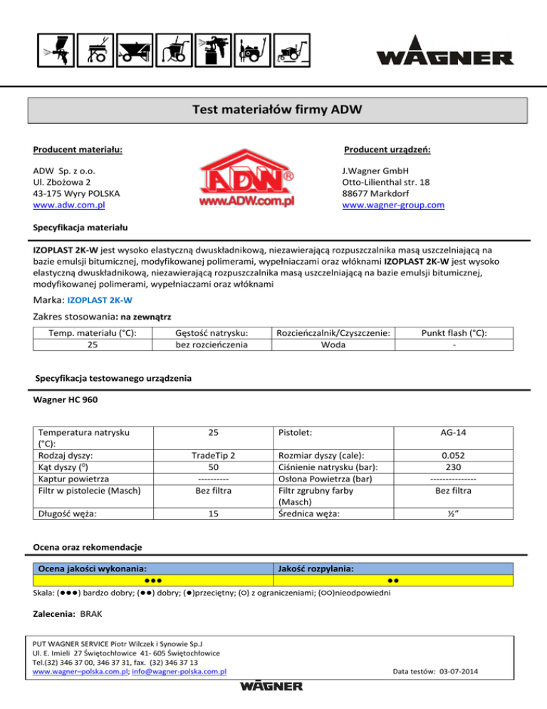 Test materiałów firmy ADW Producent materiału: Producent urządzeń: ADW Sp. z o.o. Ul. Zbożowa 2 43-175 Wyry POLSKA www.adw.com.pl J.Wagner GmbH Otto-Lilienthal str. 18 88677 Markdorf www.wagner-group.com Specyfikacja materiału IZOPLAST 2K-W jest wysoko elastyczną dwuskładnikową, niezawierającą rozpuszczalnika masą uszczelniającą na bazie emulsji bitumicznej, modyfikowanej polimerami, wypełniaczami oraz włóknami IZOPLAST 2K-W jest wysoko elastyczną dwuskładnikową, niezawierającą rozpuszczalnika masą uszczelniającą na bazie emulsji bitumicznej, modyfikowanej polimerami, wypełniaczami oraz włóknami Marka: IZOPLAST 2K-W Zakres stosowania: na zewnątrz Temp. materiału (°C): 25 Gęstość natrysku: bez rozcieńczenia Rozcieńczalnik/Czyszczenie: Woda Punkt flash (°C): - Specyfikacja testowanego urządzenia Wagner HC 960 Temperatura natrysku (°C): Rodzaj dyszy: Kąt dyszy (0) Kaptur powietrza Filtr w pistolecie (Masch) Długość węża: 25 TradeTip 2 50 ---------Bez filtra 15 Pistolet: AG-14 Rozmiar dyszy (cale): Ciśnienie natrysku (bar): Osłona Powietrza (bar) Filtr zgrubny farby (Masch) Średnica węża: 0.052 230 --------------Bez filtra ½” Ocena oraz rekomendacje Ocena jakości wykonania: Jakość rozpylania: ●●● ●● Skala: (●●●) bardzo dobry; (●●) dobry; (●)przeciętny; (○) z ograniczeniami; (○○)nieodpowiedni Zalecenia: BRAK PUT WAGNER SERVICE Piotr Wilczek i Synowie Sp.J Ul. E. Imieli 27 Świętochłowice 41- 605 Świętochłowice Tel.(32) 346 37 00, 346 37 31, fax. (32) 346 37 13 www.wagner–polska.com.pl; [email protected] Data testów: 03-07-2014 Zalecane urządzenia: Minimalne urządzenie Agregat Wagner HeavyCoat 970 Uwagi: Zaleca się dla uzyskania wymaganej powłoki nakładanie dwóch warstw Izoplastu 2 K-W Zdjęcia Załączniki
