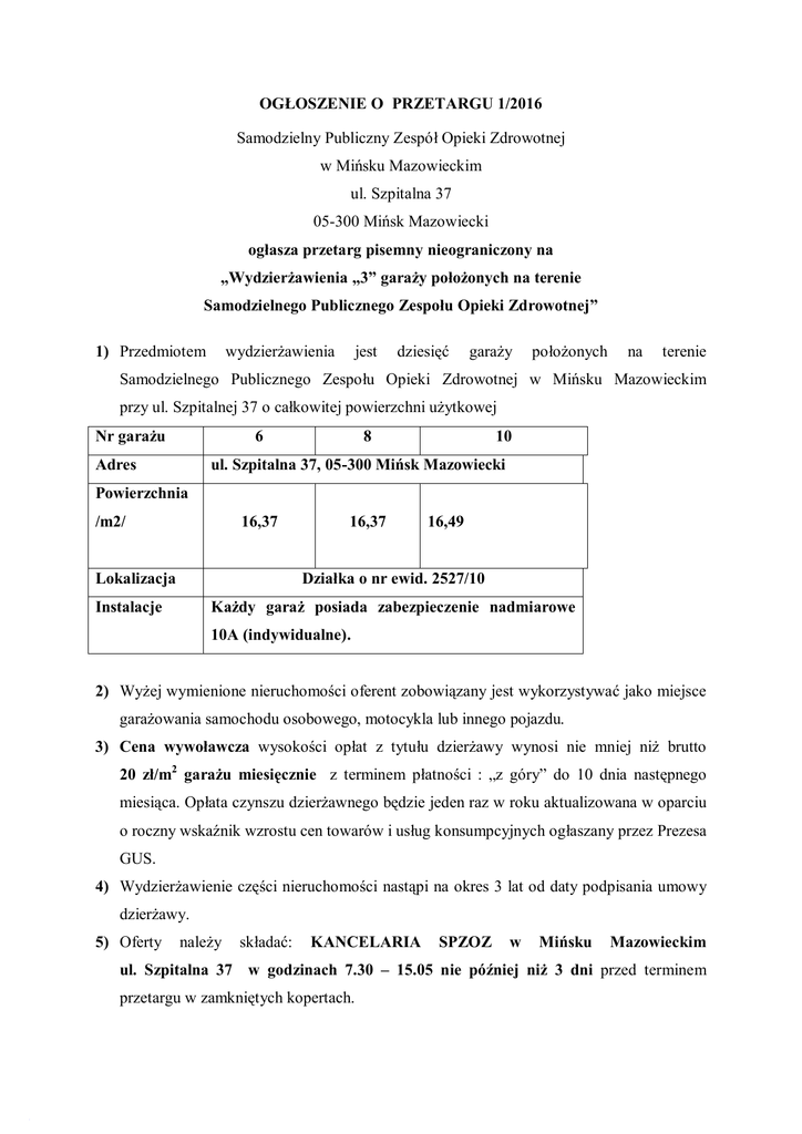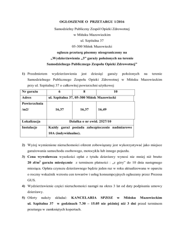 OGŁOSZENIE O PRZETARGU 1/2016 Samodzielny Publiczny Zespół Opieki Zdrowotnej w Mińsku Mazowieckim ul. Szpitalna 37 05-300 Mińsk Mazowiecki ogłasza przetarg pisemny nieograniczony na „Wydzierżawienia „3” garaży położonych na terenie Samodzielnego Publicznego Zespołu Opieki Zdrowotnej” 1) Przedmiotem wydzierżawienia jest dziesięć garaży położonych na terenie Samodzielnego Publicznego Zespołu Opieki Zdrowotnej w Mińsku Mazowieckim przy ul. Szpitalnej 37 o całkowitej powierzchni użytkowej Nr garażu 6 Adres 8 10 ul. Szpitalna 37, 05-300 Mińsk Mazowiecki Powierzchnia /m2/ 16,37 Lokalizacja 16,37 16,49 Działka o nr ewid. 2527/10 Instalacje Każdy garaż posiada zabezpieczenie nadmiarowe 10A (indywidualne). 2) Wyżej wymienione nieruchomości oferent zobowiązany jest wykorzystywać jako miejsce garażowania samochodu osobowego, motocykla lub innego pojazdu. 3) Cena wywoławcza wysokości opłat z tytułu dzierżawy wynosi nie mniej niż brutto 20 zł/m2 garażu miesięcznie z terminem płatności : „z góry” do 10 dnia następnego miesiąca. Opłata czynszu dzierżawnego będzie jeden raz w roku aktualizowana w oparciu o roczny wskaźnik wzrostu cen towarów i usług konsumpcyjnych ogłaszany przez Prezesa GUS. 4) Wydzierżawienie części nieruchomości nastąpi na okres 3 lat od daty podpisania umowy dzierżawy. 5) Oferty należy składać: KANCELARIA SPZOZ w Mińsku Mazowieckim ul. Szpitalna 37 w godzinach 7.30 – 15.05 nie później niż 3 dni przed terminem przetargu w zamkniętych kopertach. 6) Pisemna oferta powinna zawierać:1) imię, nazwisko i adres oferenta albo nazwę lub firmę oraz siedzibę, jeżeli oferentem jest osoba prawna lub inny podmiot; 2) datę sporządzenia oferty; 3) oświadczenie, że oferent zapoznał się z warunkami przetargu i przyjmuje te warunki bez zastrzeżeń; 4) oferowaną cenę i sposób jej zapłaty; 5) proponowany sposób realizacji dodatkowych warunków przetargu. Do oferty należy dołączyć kopię dowodu wniesienia wadium. 7) Termin oglądania nieruchomości do dnia składania ofert w godz. 8.00 - 14.30 8) Otwarcie ofert jest jawne , odbędzie się w Stołówce pracowniczej dnia 12.04.2016r. o godz. 10:00. 9) Oferent może złożyć ofertę na wydzierżawienie jednego garażu lub kilu podając numer garażu oraz wysokość czynszu na poszczególne garaże oddzielnie. 10) Oferent przystępujący do przetargu (słownie złotych: trzysta złotych: wnosi wadium w kwocie 600 PLN z adnotacją „Wadium – dzierżawa garaży” za każdy garaż na konto 06 9226 0005 0010 0100 2000 0090 11) Wybrany oferent, który będzie uchylał się od zawarcia umowy dzierżawy utraci wpłacone wadium. 12) SPZOZ zastrzega sobie prawo do zamknięcia przetargu bez wybrania którejkolwiek z ofert. 13) Integralna częścią ogłoszenia jest umowa , którą oferent podpisze w przypadku wyboru jego oferty. 14) W dniu otwarcia ofert odbędzie się jawna część przetargu w obecności oferentów. Przewodniczący komisji przetargowej przekaże informacje dotyczące przetargu zawarte w ogłoszeniu pod poz.: 1, 2, 3, 4, 10,11, 12. 15) Warunki przetargu (regulamin) dostępny jest w siedzibie Samodzielnego Publicznego Zespołu Opieki Zdrowotnej w Mińsku Mazowieckim ul. Szpitalna 37 w Sekcji Zamówień Publicznych oraz na stronie internetowej www.spzozmm.pl …………………………………….. Mińsk Mazowiecki, dnia 11.04.2016r.