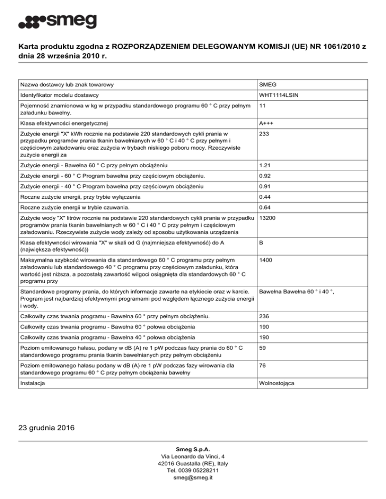 Karta produktu zgodna z ROZPORZĄDZENIEM DELEGOWANYM KOMISJI (UE) NR 1061/2010 z dnia 28 września 2010 r. Nazwa dostawcy lub znak towarowy SMEG Identyfikator modelu dostawcy WHT1114LSIN Pojemność znamionowa w kg w przypadku standardowego programu 60 ° C przy pełnym załadunku bawełny. 11 Klasa efektywności energetycznej A+++ Zużycie energii "X" kWh rocznie na podstawie 220 standardowych cykli prania w przypadku programów prania tkanin bawełnianych w 60 ° C i 40 ° C przy pełnym i częściowym załadowaniu oraz zużycia w trybach niskiego poboru mocy. Rzeczywiste zużycie energii za 233 Zużycie energii - Bawełna 60 ° C przy pełnym obciążeniu 1.21 Zużycie energii - 60 ° C Program bawełna przy częściowym obciążeniu. 0.92 Zużycie energii - 40 ° C Program bawełna przy częściowym obciążeniu 0.91 Roczne zużycie energii, przy trybie wyłączenia 0.44 Roczne zużycie energii w trybie czuwania. 0.64 Zużycie wody "X" litrów rocznie na podstawie 220 standardowych cykli prania w przypadku 13200 programów prania tkanin bawełnianych w 60 ° C i 40 ° C przy pełnym i częściowym załadowaniu. Rzeczywiste zużycie wody zależy od sposobu użytkowania urządzenia Klasa efektywności wirowania "X" w skali od G (najmniejsza efektywność) do A (największa efektywność)) B Maksymalna szybkość wirowania dla standardowego 60 ° C programu przy pełnym załadowaniu lub standardowego 40 ° C programu przy częściowym załadunku, która wartość jest niższa, a pozostałą zawartość wilgoci osiągnięta dla standardowych 60 ° C programu przy 1400 Standardowe programy prania, do których informacje zawarte na etykiecie oraz w karcie. Bawełna Bawełna 60 ° i 40 °, Program jest najbardziej efektywnymi programami pod względem łącznego zużycia energii i wody. Całkowity czas trwania programu - Bawełna 60 ° przy pełnym obciążeniu. 236 Całkowity czas trwania programu - Bawełna 60 ° połowa obciążenia 190 Całkowity czas trwania programu - Bawełna 40 ° połowa obciążenia 190 Poziom emitowanego hałasu, podany w dB (A) re 1 pW podczas fazy prania do 60 ° C standardowego programu prania tkanin bawełnianych przy pełnym obciążeniu 59 Poziom emitowanego hałasu podany w dB (A) re 1 pW podczas fazy wirowania dla standardowego programu 60 ° C przy pełnym obciążeniu bawełny 76 Instalacja Wolnostojąca 23 grudnia 2016 Smeg S.p.A. Via Leonardo da Vinci, 4 42016 Guastalla (RE), Italy Tel. 0039 05228211 [email protected]