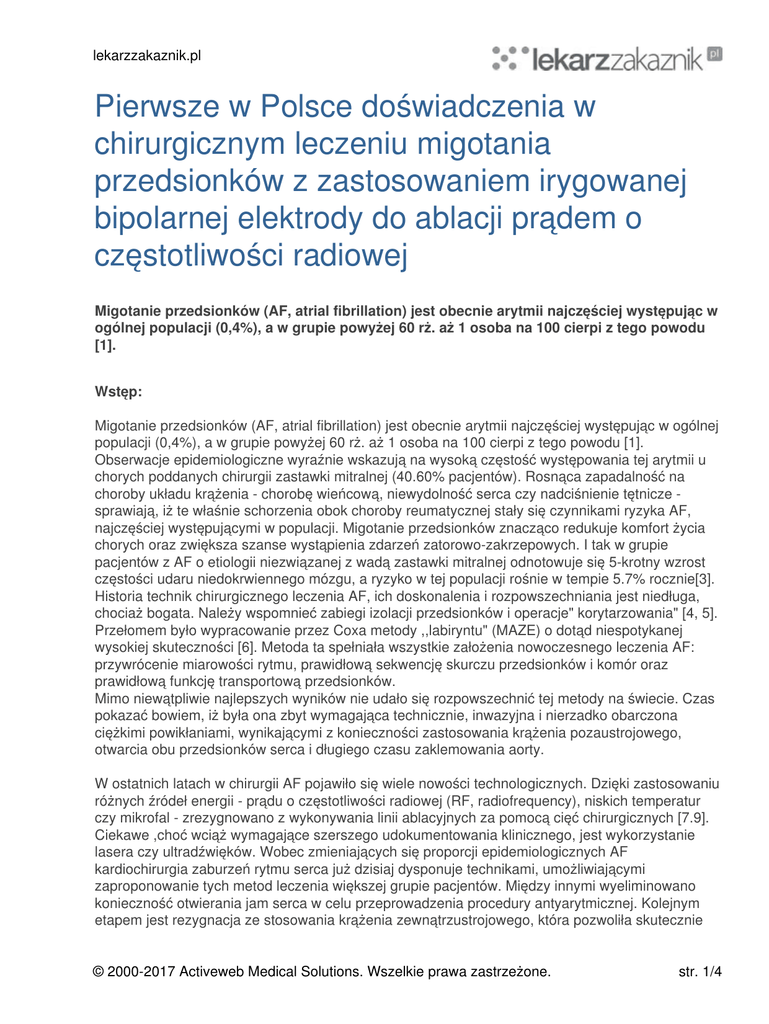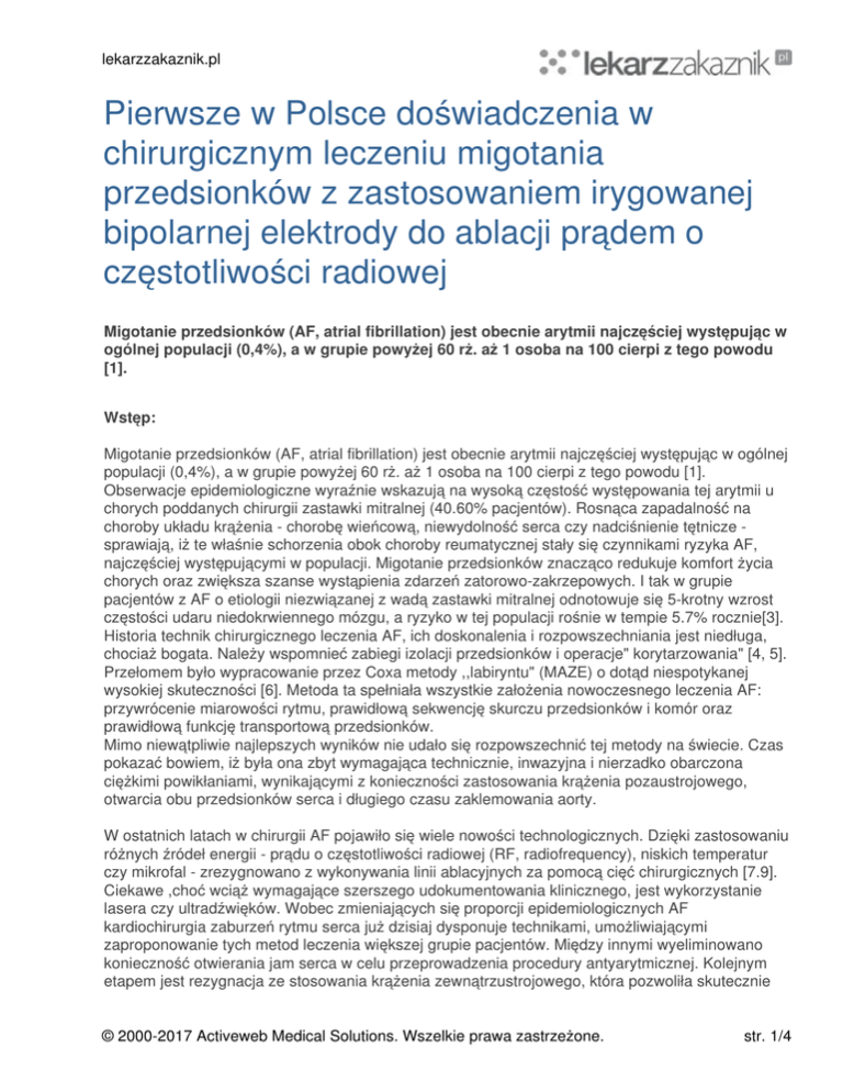 lekarzzakaznik.pl Pierwsze w Polsce doświadczenia w chirurgicznym leczeniu migotania przedsionków z zastosowaniem irygowanej bipolarnej elektrody do ablacji prądem o częstotliwości radiowej Migotanie przedsionków (AF, atrial fibrillation) jest obecnie arytmii najczęściej występując w ogólnej populacji (0,4%), a w grupie powyżej 60 rż. aż 1 osoba na 100 cierpi z tego powodu [1]. Wstęp: Migotanie przedsionków (AF, atrial fibrillation) jest obecnie arytmii najczęściej występując w ogólnej populacji (0,4%), a w grupie powyżej 60 rż. aż 1 osoba na 100 cierpi z tego powodu [1]. Obserwacje epidemiologiczne wyraźnie wskazują na wysoką częstość występowania tej arytmii u chorych poddanych chirurgii zastawki mitralnej (40.60% pacjentów). Rosnąca zapadalność na choroby układu krążenia - chorobę wieńcową, niewydolność serca czy nadciśnienie tętnicze sprawiają, iż te właśnie schorzenia obok choroby reumatycznej stały się czynnikami ryzyka AF, najczęściej występującymi w populacji. Migotanie przedsionków znacząco redukuje komfort życia chorych oraz zwiększa szanse wystąpienia zdarzeń zatorowo-zakrzepowych. I tak w grupie pacjentów z AF o etiologii niezwiązanej z wadą zastawki mitralnej odnotowuje się 5-krotny wzrost częstości udaru niedokrwiennego mózgu, a ryzyko w tej populacji rośnie w tempie 5.7% rocznie[3]. Historia technik chirurgicznego leczenia AF, ich doskonalenia i rozpowszechniania jest niedługa, chociaż bogata. Należy wspomnieć zabiegi izolacji przedsionków i operacje" korytarzowania" [4, 5]. Przełomem było wypracowanie przez Coxa metody ,,labiryntu" (MAZE) o dotąd niespotykanej wysokiej skuteczności [6]. Metoda ta spełniała wszystkie założenia nowoczesnego leczenia AF: przywrócenie miarowości rytmu, prawidłową sekwencję skurczu przedsionków i komór oraz prawidłową funkcję transportową przedsionków. Mimo niewątpliwie najlepszych wyników nie udało się rozpowszechnić tej metody na świecie. Czas pokazać bowiem, iż była ona zbyt wymagająca technicznie, inwazyjna i nierzadko obarczona ciężkimi powikłaniami, wynikającymi z konieczności zastosowania krążenia pozaustrojowego, otwarcia obu przedsionków serca i długiego czasu zaklemowania aorty. W ostatnich latach w chirurgii AF pojawiło się wiele nowości technologicznych. Dzięki zastosowaniu różnych źródeł energii - prądu o częstotliwości radiowej (RF, radiofrequency), niskich temperatur czy mikrofal - zrezygnowano z wykonywania linii ablacyjnych za pomocą cięć chirurgicznych [7.9]. Ciekawe ,choć wciąż wymagające szerszego udokumentowania klinicznego, jest wykorzystanie lasera czy ultradźwięków. Wobec zmieniających się proporcji epidemiologicznych AF kardiochirurgia zaburzeń rytmu serca już dzisiaj dysponuje technikami, umożliwiającymi zaproponowanie tych metod leczenia większej grupie pacjentów. Między innymi wyeliminowano konieczność otwierania jam serca w celu przeprowadzenia procedury antyarytmicznej. Kolejnym etapem jest rezygnacja ze stosowania krążenia zewnątrzustrojowego, która pozwoliła skutecznie © 2000-2017 Activeweb Medical Solutions. Wszelkie prawa zastrzeżone. str. 1/4 lekarzzakaznik.pl leczyć arytmię u pacjentów zakwalifikowanych do zabiegu pomostowania aortalno-wieńcowego bez użycia krążenia pozaustrojowego (OPCAB, off pumpcoronary artery bypass). Ponadto niezwykle istotne wydaje się znalezienie metody zapewniającej przez ścienność wykonywanych blizn przedsionka, co uważane jest przez wielu badaczy za bezwzględny warunek sukcesu klinicznego wykonywanej ablacji. Celem pracy jest przedstawienie pierwszych w Polsce doświadczeń z zastosowaniem irygowanej bipolarnej elektrody do ablacji prądem o częstotliwości radiowej w chirurgicznym leczeniu migotania przedsionków. Materiał i metody Od grudnia 2003 r. na Klinicznym Oddziale Kardiochirurgii Akademii Medycznej w Warszawie u 6 pacjentów z AF wykonano ablację irygowaną elektrodą bipolarną Cardioblate BP, firmy Medtronic. Wiek pacjentów wynosił 61.74 lat (.r. 67 8,71 roku). Operowano 2 kobiety i 4 mężczyzn. U 5 pacjentów występowało napadowe AF, zaś u 1 - utrwalone. Ablacja towarzyszyła procedurze zasadniczej, którą było OPCAB u 4 chorych, wymiana zastawki aortalnej z pomostowaniem tętnic wieńcowych - u 1 osoby oraz wymiana zastawki aortalnej wraz z protezowaniem aorty wstępującej - u 1 pacjenta. Cardioblate BP jest nowym na rynku urządzeniem do ablacji w chirurgicznym leczeniu AF, wykorzystującym irygowaną elektrodę bipolarną aplikującą prąd o częstotliwości radiowej. Emitowana energia przepływa pomiędzy dwoma ramionami aplikatora, mającymi 5cm długości. Urządzenie posiada system sygnalizujący przezścienność wykonanej ablacji. W sposób ciągły w czasie ablacji mierzona jest impedancja tkanki znajdującej się między ramionami elektrody. W miarę wzrostu temperatury, przemieszczenia płynowych i obumierania komórek dochodzi początkowo do spadku impedancji, a następnie do gwałtownego jej wzrostu. Urządzenie dźwiękowo sygnalizuje spełnienie odpowiednich kryteriów, a następnie przerywa ablację. W czasie ablacji system automatycznie zarządza przepływem energii w zależności od impedancji tkanki i czasu trwania ablacji. Temperatura ablowanej tkanki wynosi ok. 50oC. Urządzenie posiada również system do irygacji, uruchamiany poprzez naciśnięcie spustu na aplikatorze. Powoduje to równocześnie zaciśnięcie ramion elektrody i stabilizację w wybranym obszarze anatomicznym. Istnieje możliwość blokady zaciśniętego spustu. Z kolei naciśnięcie pedału powoduje rozpoczęcie ablacji. U wszystkich pacjentów wykonano izolację żył płucnych. Urządzenie zaprojektowane jest w sposób odpowiadający wymaganiom technicznym tej procedury. Można ją wykonywać zarówno w czasie zabiegów z zastosowaniem krążenia pozaustrojowego, jak i bez niego, na przykład podczas