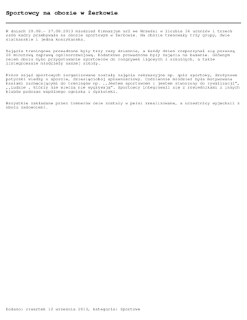 Sportowcy na obozie w Żerkowie W dniach 20.08.- 27.08.2013 młodzież Gimnazjum nr2 we Wrześni w liczbie 36 uczniów i trzech osób kadry przebywała na obozie sportowym w Żerkowie. Na obozie trenowały trzy grupy, dwie siatkarskie i jedna koszykarska. Zajęcia treningowe prowadzone były trzy razy dziennie, a każdy dzień rozpoczynał się poranną 20 minutową zaprawą ogólnorozwojową. Dodatkowo prowadzone były zajęcia na basenie. Głównym celem obozu było przygotowanie sportowców do rozgrywek ligowych i szkolnych, a także zintegrowanie młodzieży naszej szkoły. Prócz zajęć sportowych zorganizowane zostały zajęcia rekreacyjne np. quiz sportowy, drużynowe potyczki wiedzy o sporcie, dziesięciobój sprawnościowy. Codziennie młodzież była motywowana hasłami zachęcającymi do treningów np. ,,Jestem sportowcem i jestem stworzony do rywalizacji”, ,,Ludzie , którzy nie wierzą nie wygrywają”. Sportowcy integrowali się z rówieśnikami z innych klubów podczas wspólnego ogniska i dyskoteki. Wszystkie zakładane przez trenerów cele zostały w pełni zrealizowane, a uczestnicy wyjechali z obozu zadowoleni. Dodano: czwartek 12 września 2013, kategoria: Sportowe