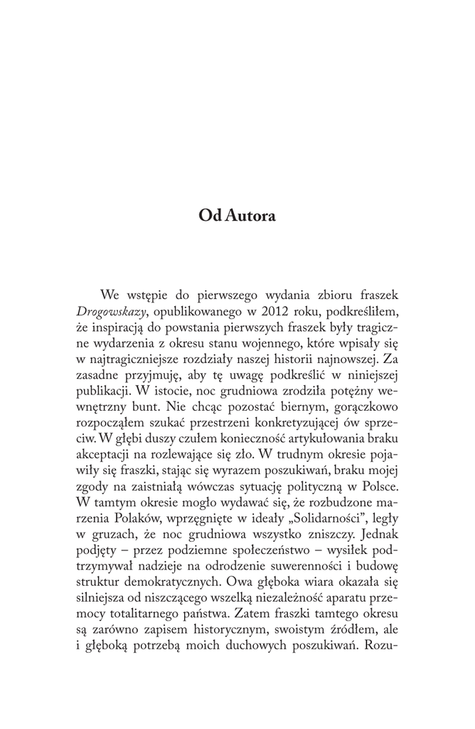 Od Autora We wstępie do pierwszego wydania zbioru fraszek Drogowskazy, opublikowanego w 2012 roku, podkreśliłem, że inspiracją do powstania pierwszych fraszek były tragiczne wydarzenia z okresu stanu wojennego, które wpisały się w najtragiczniejsze rozdziały naszej historii najnowszej. Za zasadne przyjmuję, aby tę uwagę podkreślić w niniejszej publikacji. W istocie, noc grudniowa zrodziła potężny wewnętrzny bunt. Nie chcąc pozostać biernym, gorączkowo rozpocząłem szukać przestrzeni konkretyzującej ów sprzeciw. W głębi duszy czułem konieczność artykułowania braku akceptacji na rozlewające się zło. W trudnym okresie pojawiły się fraszki, stając się wyrazem poszukiwań, braku mojej zgody na zaistniałą wówczas sytuację polityczną w Polsce. W tamtym okresie mogło wydawać się, że rozbudzone marzenia Polaków, wprzęgnięte w ideały „Solidarności”, legły w gruzach, że noc grudniowa wszystko zniszczy. Jednak podjęty – przez podziemne społeczeństwo – wysiłek podtrzymywał nadzieje na odrodzenie suwerenności i budowę struktur demokratycznych. Owa głęboka wiara okazała się silniejsza od niszczącego wszelką niezależność aparatu przemocy totalitarnego państwa. Zatem fraszki tamtego okresu są zarówno zapisem historycznym, swoistym źródłem, ale i głęboką potrzebą moich duchowych poszukiwań. Rozu- miałem, że jedynym punktem odniesienia pozostają wartości wpisane w ponadczasowy porządek. Z niego wyłaniał się również sposób budowania ducha patriotyzmu, tak bardzo potrzebnego w odczytywaniu znaków czasu. Wybicie się Polski na niepodległość, wprowadzanie zmian makrosystemowych i makrostrukturalnych nie uwolniło życia narodowego od nowych niebezpieczeństw, nowych zagrożeń. Z niepokojem patrzyłem na nie w dobie transformacji ustrojowej (okresie przełomu), ale i kolejnych latach. Autentycznie cieszyły mnie sukcesy, których nie można nie zauważać. Analizowałem pojawiające się szanse historyczne, których podjęcie czyniłoby z naszego kraju organizm dynamicznie rozwijający się, budujący czytelne, wydolne struktury państwa. Jako nauczyciel akademicki z nadzieją patrzyłem na możliwość stworzenia szans startu życiowego młodemu pokoleniu Polaków. Niestety, moje nadzieje coraz bardziej zaczęły rozbijać się o rafy interesów partyjnych, brak myślenia racjami stanu narodu, głębokimi waśniami. Po latach nastał kolejny trudny czas, znaki tragicznych wydarzeń w Smoleńsku i próby ich zafałszowania. Musiały one budzić kolejny szeroki sprzeciw społeczny. Ten bagaż nowych doświadczeń, obserwacji, niepokojów przelewałem w kolejne fraszki, jakże często pisane in statu nascendi. Często powstawały one jako mój komentarz, gdy pojawiały się bulwersujące artykuły publikowane w prasie codziennej lub zamieszczane na stronie internetowej. Problematyka życia politycznego, społecznego, czy obyczajowego stawała się zatem coraz częściej podejmowaną. Mam świadomość, że na ich odbiór ma wpływ system wartości czytelnika, a przez to i przyjmowana postawa polityczna. Przyznaję, pisanie fraszek stało się moją – coraz bardziej pogłębianą – pasją, egzemplifikacją wnętrza, a nie tylko zabawą w składnię czy rozbiór według określonego porządku. Z tych racji można znaleźć w nich wiele emocji. W dobie szumu informacyjnego, ucieczki od odpowiedzialności za słowo, kiedy liczba informacji przekracza możliwość ich percepcji i zrozumienia, fraszki mogą odegrać ważną rolę. Przemawia 6 za tym ich lapidarność, rodząca refleksję, budząca nadzieję w świecie programowo wręcz wprowadzanego relatywizmu – poznawczego, etycznego, estetycznego – praktycznie podważającego wszystkie sfery życia. Gromadzone przez lata fraszki zapewne pozostałyby we własnej kolekcji i nie ujrzałyby światła dziennego, gdybym nie spotkał na swojej drodze wspaniałych ludzi, którzy po ich lekturze namówili mnie do ich wydania. Pierwszym recenzentem tych fraszek był dr Zbigniew Jóźwik, przyrodnik, artysta grafik, dzięki któremu obydwa tomiki zawdzięczają wspaniałą szatę graficzną. We wczesnym etapie mojej twórczości najwięcej jednak zawdzięczam Panu redaktorowi dr. hab. Eugeniuszowi Wilkowskiemu, który utwierdził mnie w przekonaniu o konieczności wydania tych fraszek w formie tomiku. Także kolejne zbiory moich fraszek zamieszczał na łamach „Powinności. Pisma Kulturalno-Społecznego Ziemi Chełmskiej”, począwszy od numeru 6 (2011) do chwili obecnej, nadal pozostając otwartym na nie. Dzięki pośrednictwu Pana red. Wilkowskiego mogłem poznać mojego pierwszego Mentora w trudnej sztuce pisania fraszek, Pana Longina Jana Okonia, znanego prozaika, poetę, eseistę i krytyka literackiego z Chełma, który dokonał profesjonalnej oceny i selekcji moich utworów. Bardzo cenię sobie bezpośrednie spotkanie z Panem L. Okoniem i prawdziwą lekcję „fraszkopisania”, z której korzystam do dziś. Moje „zatapianie się” w pisaniu otrzymywało kolejne bodźce, inspiracje, zachęty. Ważnym wydarzeniem stało się pozytywne przyjęcie pierwszego zbioru fraszek Drogowskazy, a przede wszystkim poznanie mojego drugiego Mentora – Pani Prof. dr hab. Władysławy Książek-Bryłowej, która – co jawi się jako bezsporne – otworzyła przede mną nowy, bardziej intensywny rozdział w trudnej sztuce „fraszkopisania”. Pozytywna ocena zgromadzonych nowych utworów przyśpieszyła decyzję o wydaniu przedkładanego zbioru W poszukiwaniu wartości. Fraszki w nim zamieszczone podzieliłem na trzy grupy: akademickie standardy, paradoksy społeczno-obycza7 jowe oraz meandry polityki. Wyrażam głęboką wdzięczność Pani Profesor za podjęty trud przygotowania „Posłowia”, recenzji wydawniczej, a przede wszystkim za otrzymany strumień duchowego wsparcia. To wszystko przyjmuję jako wskazanie, że podejmowany przeze mnie wysiłek zmagania się