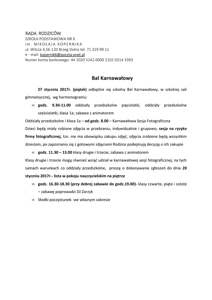 RADA RODZICÓW SZKOŁA PODSTAWOWA NR 6 im. MIKOŁAJA KOPERNIKA ul. Wilcza 4,56-120 Brzeg Dolny tel. 71 319 99 11 e - mail: [email protected] Numer konta bankowego: 44 1020 5242 0000 2102 0314 3393 Bal Karnawałowy 27 stycznia 2017r. (piątek) odbędzie się szkolny Bal Karnawałowy, w szkolnej sali gimnastycznej, wg harmonogramu: • godz. 9.30-11.00 oddziały przedszkolne pięciolatki, oddziały przedszkolne sześciolatki, klasa 1a; zabawa z animatorem Oddziały przedszkolne i klasa 1a – od godz. 8.00 – Karnawałowa Sesja Fotograficzna Dzieci będą miały robione zdjęcia w przebraniu, indywidualnie i grupowo; sesja na ryzyko firmy fotograficznej, tzn. nie ma obowiązku zakupu zdjęć, zdjęcia zrobione będą wszystkim dzieciom, po zapoznaniu się z gotowymi zdjęciami Rodzice podejmują decyzję o ich zakupie • godz. 11.30 – 13.00 klasy drugie i trzecie; zabawa z animatorem Klasy drugie i trzecie mogą również wziąć udział w karnawałowej sesji fotograficznej, na tych samach warunkach co oddziały przedszkolne, proszę o dokonywanie zgłoszeń do dnia 20 stycznia 2017r.- lista w pokoju nauczycielskim na piętrze • godz. 16.30-18.30 (przy dobrej zabawie do godz.19.00)- klasy czwarte, piąte i szóste – zabawę poprowadzi DJ Zarzyk • Słodki poczęstunek- we własnym zakresie