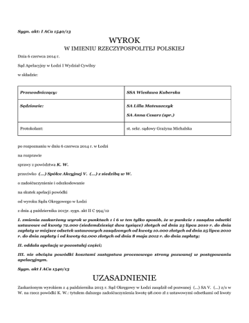 Sygn. akt: I ACa 1540/13 WYROK W IMIENIU RZECZYPOSPOLITEJ POLSKIEJ Dnia 6 czerwca 2014 r. Sąd Apelacyjny w Łodzi I Wydział Cywilny w składzie: Przewodniczący: SSA Wiesława Kuberska Sędziowie: SA Lilla Mateuszczyk SA Anna Cesarz (spr.) Protokolant: st. sekr. sądowy Grażyna Michalska po rozpoznaniu w dniu 6 czerwca 2014 r. w Łodzi na rozprawie sprawy z powództwa K. W. przeciwko (...) Spółce Akcyjnej V. (...) z siedzibą w W. o zadośćuczynienie i odszkodowanie na skutek apelacji powódki od wyroku Sądu Okręgowego w Łodzi z dnia 4 października 2013r. sygn. akt II C 994/12 I. zmienia zaskarżony wyrok w punktach 1 i 6 w ten tylko sposób, że w punkcie 1 zasądza odsetki ustawowe od kwoty 72.000 (siedemdziesiąt dwa tysiące) złotych od dnia 25 lipca 2010 r. do dnia zapłaty w miejsce odsetek ustawowych zasądzonych od kwoty 10.000 złotych od dnia 25 lipca 2010 r. do dnia zapłaty i od kwoty 62.000 złotych od dnia 8 maja 2012 r. do dnia zapłaty; II. oddala apelację w pozostałej części; III. nie obciąża powódki kosztami zastępstwa procesowego strony pozwanej w postępowaniu apelacyjnym. Sygn. akt I ACa 1540/13 UZASADNIENIE Zaskarżonym wyrokiem z 4 października 2013 r. Sąd Okręgowy w Łodzi zasądził od pozwanej (...) SA V. (...) z/s w W. na rzecz powódki K. W.: tytułem dalszego zadośćuczynienia kwotę 98.000 zł z ustawowymi odsetkami od kwoty 10.000 zł od 25 lipca 2010 r. do dnia zapłaty, od kwoty 62.000 zł od 8 maja 2012 r. do dnia zapłaty i od kwoty 26.000 zł od 7 czerwca 2013 r. do dnia zapłaty; zwrot kosztów opieki i pomocy oraz leczenia a także rentę na zwiększone potrzeby; ustalił odpowiedzialność pozwanej za przyszłe szkody; oddalił powództwo w pozostałej części i orzekł o kosztach postępowania. W zakresie objętym apelacją Sąd Okręgowy ustalił, że 29 marca 2010 r. w Ł. przy Al. (...) miał miejsce wypadek komunikacyjny, w wyniku którego obrażeń ciała doznała powódka. Sprawca objęty był obowiązkowym ubezpieczeniem OC w pozwanym zakładzie ubezpieczeń. Po wypadku powódka została przewieziona do Kliniki (...) im. WAM w Ł.. U powódki stwierdzono złamanie przezkłykciowe z przemieszczeniem prawej kości ramiennej. Powódkę poddano operacji repozycji krwawej i osteosyntezy z użyciem metalu. Następnie założono na rękę opatrunek gipsowy na 2 tygodnie, a następnie ortezę odwodzącą na bark i prawe przedramię. Po wypadku powódka mogła chodzić samodzielnie, ale wymagała pomocy innych osób w podstawowych czynnościach. Odczuwała znaczne dolegliwości bólowe. 20 kwietnia 2010 r. powódka została hospitalizowana na Oddziale (...) Pourazowej z uwagi na przykurcz zgięciowowyprostny prawego stawu łokciowego. Od czerwca 2010 r. powódka odbywała wizyty u psychiatry z rozpoznaniem zaburzeń emocjonalnych. Po wykorzystaniu zwolnienia lekarskiego powódka wróciła do pracy. Powódka kontynuowała rehabilitację w poradniach szpitalnych. Zakres ruchu prawej ręki zwiększył się, ale utrzymywały się nadal dolegliwości bólowe. Z czasem pojawiły się u powódki objawy w postaci drętwienia prawej ręki, dlatego zaczęła się leczyć u neurologa. Z uwagi na rozległą ranę na ręce powódka korzystała także z porad dermatologa. Kontynuowała również leczenie w (...) z rozpoznaniem zespołu depresyjno-lękowego po wypadku samochodowym. Z uwagi na powikłany przebieg leczenia powódka była ponownie hospitalizowana od 8 do 19 listopada 2010 r. Powódkę poddano operacji krwawego uwolnienia przykurczu zgięciowego prawego stawu łokciowego i usunięcia metalu. Powódka korzystała też z leczenia uzdrowiskowego. Z uwagi na rozpoznanie zespołu rowka nerwu łokciowego powódka była ponownie hospitalizowana od 18 do 19 maja 2011 r. Pobyt odbył się w trybie planowym celem wykonania operacji usunięcia metalu i neurolizy nerwu łokciowego. Powódka ma obecnie 30 lata. Przed wypadkiem była osobą sprawną. Teraz nie jest samodzielna, nie może dźwigać, sięgać prawą ręką, nie może przeciążać barku. Cały czas wymaga pomocy przez około 2-4 godzin tygodniowo. Pomimo przeprowadzonych operacji nadal utrzymują się dolegliwości bólowe, pojawiły się dodatkowe objawy takie jak mrowienie ręki, zaburzenia krążenia. Konieczne będą dalsze (co najmniej dwie) operacje polegające na przeniesieniu nerwu łokciowego z uwagi na nadbudowę kości i przeszczepienie ścięgna. Powódka korzysta z zabiegów rehabilitacyjnych i fizjoterapeutycznych. Pracuje jako pracownik socjalny w młodzieżowym ośrodku wychowawczym. Stan ręki utrudnia jej pisanie, co należy do jej obowiązków. Oprócz dolegliwości bólowych odczuwa lęki związane z ruchem drogowym. Na skutek wypadku powódka doznała wieloodłamowego, przezkłykciowego złamania kości ramiennej prawej z przemieszczeniem, wadliwie wygojonego, powikłanego przykurczem zgięciowo-wyprostnym stawu łokciowego. Trwały uszczerbek na zdrowiu ze względów ortopedycznych wynosi 25%. Zakres cierpień fizycznych i psychicznych był znacznego stopnia ze względu na deformację, znaczny przykurcz zgięciowo-wyprostny oraz dolegliwości bólowe prawego stawu łokciowego z dużym ograniczeniem sprawności prawej kończyny górnej. Pomimo dwukrotnego leczenia operacyjnego i długotrwałej rehabilitacji dolegliwości te nadal się utrzymują. Rokowania na przyszłość nie są pomyślne. Po dalszym leczeniu nie przewiduje się powrotu do pełnej sprawności prawej kończyny górnej, funkcja prawego stawu łokciowego może ulec tylko częściowej poprawie. W przyszłości w przypadku narastania pourazowych zmian zwyrodnieniowych stawu łokciowego z postępującycm ograniczeniem ruchomości może zajść konieczność wykonania endoprotezoplastyki stawu łokciowego. Skutkiem obrażeń doznanych w przebiegu wypadku były także objawy częściowego uszkodzenia prawego nerwu łokciowego, a prawdopodobnie również urazu kręgosłupa szyjnego. Ze względów 
