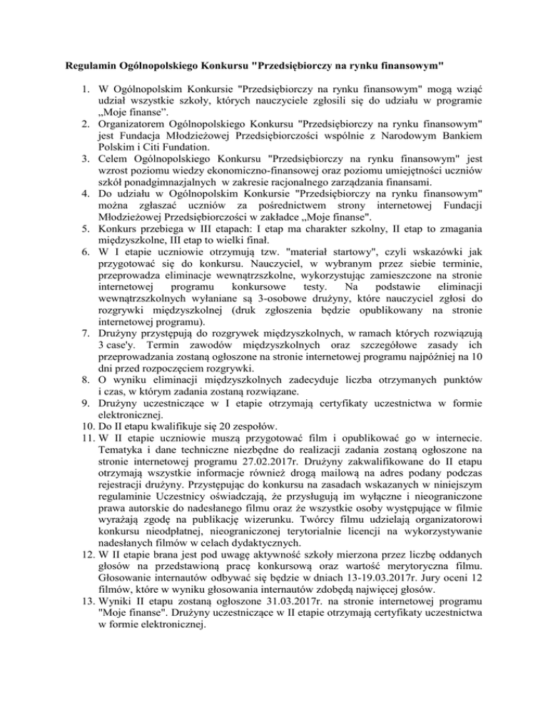 Regulamin Ogólnopolskiego Konkursu "Przedsiębiorczy na rynku finansowym" 1. W Ogólnopolskim Konkursie "Przedsiębiorczy na rynku finansowym" mogą wziąć udział wszystkie szkoły, których nauczyciele zgłosili się do udziału w programie „Moje finanse”. 2. Organizatorem Ogólnopolskiego Konkursu "Przedsiębiorczy na rynku finansowym" jest Fundacja Młodzieżowej Przedsiębiorczości wspólnie z Narodowym Bankiem Polskim i Citi Fundation. 3. Celem Ogólnopolskiego Konkursu "Przedsiębiorczy na rynku finansowym" jest wzrost poziomu wiedzy ekonomiczno-finansowej oraz poziomu umiejętności uczniów szkół ponadgimnazjalnych w zakresie racjonalnego zarządzania finansami. 4. Do udziału w Ogólnopolskim Konkursie "Przedsiębiorczy na rynku finansowym" można zgłaszać uczniów za pośrednictwem strony internetowej Fundacji Młodzieżowej Przedsiębiorczości w zakładce „Moje finanse". 5. Konkurs przebiega w III etapach: I etap ma charakter szkolny, II etap to zmagania międzyszkolne, III etap to wielki finał. 6. W I etapie uczniowie otrzymują tzw. "materiał startowy", czyli wskazówki jak przygotować się do konkursu. Nauczyciel, w wybranym przez siebie terminie, przeprowadza eliminacje wewnątrzszkolne, wykorzystując zamieszczone na stronie internetowej programu konkursowe testy. Na podstawie eliminacji wewnątrzszkolnych wyłaniane są 3-osobowe drużyny, które nauczyciel zgłosi do rozgrywki międzyszkolnej (druk zgłoszenia będzie opublikowany na stronie internetowej programu). 7. Drużyny przystępują do rozgrywek międzyszkolnych, w ramach których rozwiązują 3 case'y. Termin zawodów międzyszkolnych oraz szczegółowe zasady ich przeprowadzania zostaną ogłoszone na stronie internetowej programu najpóźniej na 10 dni przed rozpoczęciem rozgrywki. 8. O wyniku eliminacji międzyszkolnych zadecyduje liczba otrzymanych punktów i czas, w którym zadania zostaną rozwiązane. 9. Drużyny uczestniczące w I etapie otrzymają certyfikaty uczestnictwa w formie elektronicznej. 10. Do II etapu kwalifikuje się 20 zespołów. 11. W II etapie uczniowie muszą przygotować film i opublikować go w internecie. Tematyka i dane techniczne niezbędne do realizacji zadania zostaną ogłoszone na stronie internetowej programu 27.02.2017r. Drużyny zakwalifikowane do II etapu otrzymają wszystkie informacje również drogą mailową na adres podany podczas rejestracji drużyny. Przystępując do konkursu na zasadach wskazanych w niniejszym regulaminie Uczestnicy oświadczają, że przysługują im wyłączne i nieograniczone prawa autorskie do nadesłanego filmu oraz że wszystkie osoby występujące w filmie wyrażają zgodę na publikację wizerunku. Twórcy filmu udzielają organizatorowi konkursu nieodpłatnej, nieograniczonej terytorialnie licencji na wykorzystywanie nadesłanych filmów w celach dydaktycznych. 12. W II etapie brana jest pod uwagę aktywność szkoły mierzona przez liczbę oddanych głosów na przedstawioną pracę konkursową oraz wartość merytoryczna filmu. Głosowanie internautów odbywać się będzie w dniach 13-19.03.2017r. Jury oceni 12 filmów, które w wyniku głosowania internautów zdobędą najwięcej głosów. 13. Wyniki II etapu zostaną ogłoszone 31.03.2017r. na stronie internetowej programu "Moje finanse". Drużyny uczestniczące w II etapie otrzymają certyfikaty uczestnictwa w formie elektronicznej. 14. Do III etapu awansuje 8 zespołów. Finaliści o awansie zostaną poinformowani za pośrednictwem strony internetowej programu "Moje finanse" oraz drogą mailową na adresy podane podczas rejestracji drużyny. 15. Rozgrywka finałowa składa się z dwóch części: test wiedzy w zakresie gospodarowania finansami i konkurs debat metodą Karla Poppera oceniany przez specjalnie powołane jury. Teza debaty zostanie ogłoszony trzy tygodnie przed rozgrywką finałową na stronie internetowej programu. 16. III etap odbędzie się 20-22.04.2017r. w Konstancinie Jeziornej. 17. Decyzje Jury są ostateczne. 18. Dla finalistów Konkursu przewidziano dyplomy i atrakcyjne nagrody. 19. Organizatorzy zastrzegają sobie prawo wprowadzania do regulaminu zmian, o których powiadomią uczestników na stronie internetowej programu.