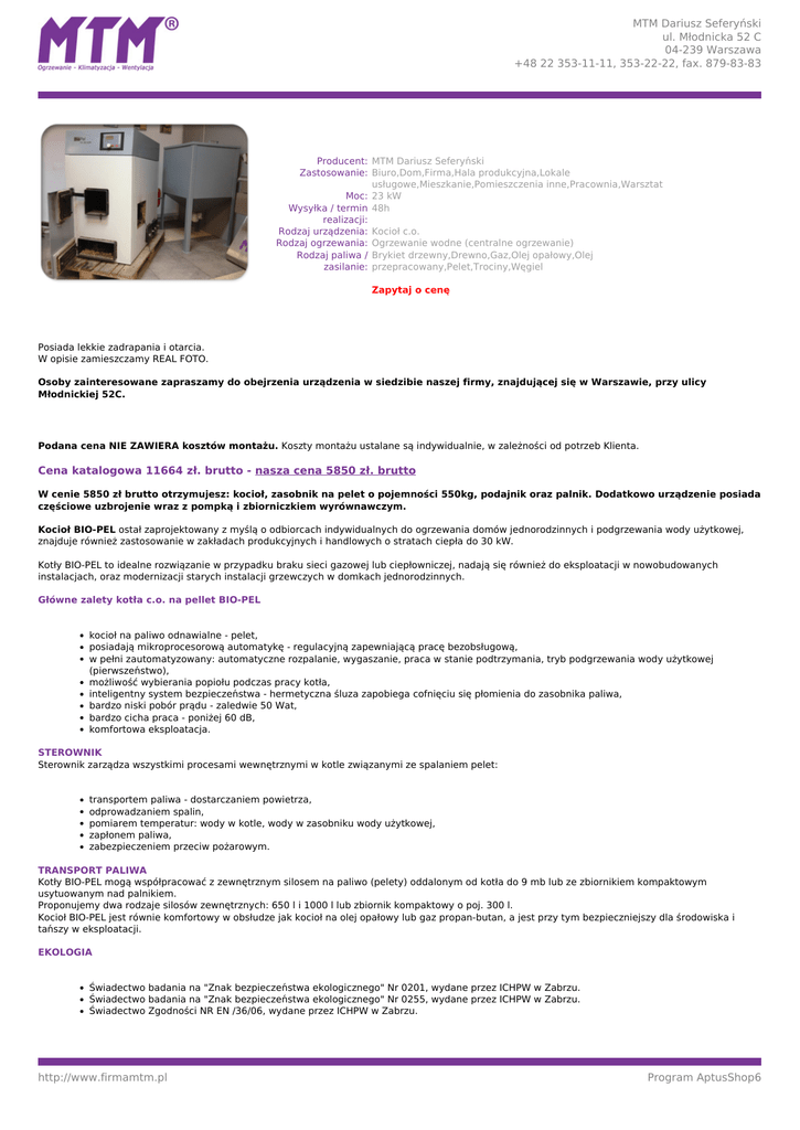 MTM Dariusz Seferyński ul. Młodnicka 52 C 04-239 Warszawa +48 22 353-11-11, 353-22-22, fax. 879-83-83 Producent: MTM Dariusz Seferyński Zastosowanie: Biuro,Dom,Firma,Hala produkcyjna,Lokale usługowe,Mieszkanie,Pomieszczenia inne,Pracownia,Warsztat Moc: 23 kW Wysyłka / termin 48h realizacji: Rodzaj urządzenia: Kocioł c.o. Rodzaj ogrzewania: Ogrzewanie wodne (centralne ogrzewanie) Rodzaj paliwa / Brykiet drzewny,Drewno,Gaz,Olej opałowy,Olej zasilanie: przepracowany,Pelet,Trociny,Węgiel Zapytaj o cenę Posiada lekkie zadrapania i otarcia. W opisie zamieszczamy REAL FOTO. Osoby zainteresowane zapraszamy do obejrzenia urządzenia w siedzibie naszej firmy, znajdującej się w Warszawie, przy ulicy Młodnickiej 52C. Podana cena NIE ZAWIERA kosztów montażu. Koszty montażu ustalane są indywidualnie, w zależności od potrzeb Klienta. Cena katalogowa 11664 zł. brutto - nasza cena 5850 zł. brutto W cenie 5850 zł brutto otrzymujesz: kocioł, zasobnik na pelet o pojemności 550kg, podajnik oraz palnik. Dodatkowo urządzenie posiada częściowe uzbrojenie wraz z pompką i zbiorniczkiem wyrównawczym. Kocioł BIO-PEL ostał zaprojektowany z myślą o odbiorcach indywidualnych do ogrzewania domów jednorodzinnych i podgrzewania wody użytkowej, znajduje również zastosowanie w zakładach produkcyjnych i handlowych o stratach ciepła do 30 kW. Kotły BIO-PEL to idealne rozwiązanie w przypadku braku sieci gazowej lub ciepłowniczej, nadają się również do eksploatacji w nowobudowanych instalacjach, oraz modernizacji starych instalacji grzewczych w domkach jednorodzinnych. Główne zalety kotła c.o. na pellet BIO-PEL kocioł na paliwo odnawialne - pelet, posiadają mikroprocesorową automatykę - regulacyjną zapewniającą pracę bezobsługową, w pełni zautomatyzowany: automatyczne rozpalanie, wygaszanie, praca w stanie podtrzymania, tryb podgrzewania wody użytkowej (pierwszeństwo), możliwość wybierania popiołu podczas pracy kotła, inteligentny system bezpieczeństwa - hermetyczna śluza zapobiega cofnięciu się płomienia do zasobnika paliwa, bardzo niski pobór prądu - zaledwie 50 Wat, bardzo cicha praca - poniżej 60 dB, komfortowa eksploatacja. STEROWNIK Sterownik zarządza wszystkimi procesami wewnętrznymi w kotle związanymi ze spalaniem pelet: transportem paliwa - dostarczaniem powietrza, odprowadzaniem spalin, pomiarem temperatur: wody w kotle, wody w zasobniku wody użytkowej, zapłonem paliwa, zabezpieczeniem przeciw pożarowym. TRANSPORT PALIWA Kotły BIO-PEL mogą współpracować z zewnętrznym silosem na paliwo (pelety) oddalonym od kotła do 9 mb lub ze zbiornikiem kompaktowym usytuowanym nad palnikiem. Proponujemy dwa rodzaje silosów zewnętrznych: 650 l i 1000 l lub zbiornik kompaktowy o poj. 300 l. Kocioł BIO-PEL jest równie komfortowy w obsłudze jak kocioł na olej opałowy lub gaz propan-butan, a jest przy tym bezpieczniejszy dla środowiska i tańszy w eksploatacji. EKOLOGIA Świadectwo badania na "Znak bezpieczeństwa ekologicznego" Nr 0201, wydane przez ICHPW w Zabrzu. Świadectwo badania na "Znak bezpieczeństwa ekologicznego" Nr 0255, wydane przez ICHPW w Zabrzu. Świadectwo Zgodności NR EN /36/06, wydane przez ICHPW w Zabrzu. http://www.firmamtm.pl Program AptusShop6 MTM Dariusz Seferyński ul. Młodnicka 52 C 04-239 Warszawa +48 22 353-11-11, 353-22-22, fax. 879-83-83 Dane techniczne Moc grzewcza Waga Pojemność zasobnika Pojemność wodna kotła BIO-PEL Ciśnienie robocze Sprawność Minimalny ciąg kominowy Maksymalna temp. wody w kotle Minimalna temperatura wody powrotnej Rodzaj paliwa Orientacyjne zużycia paliwa - nominalne Pobór energii elektrycznej (rozruch/praca) Poziom hałasu http://www.firmamtm.pl Powered by TCPDF (www.tcpdf.org) 15-30 kW 280 kg 650 dm3 90 dm3 (90 litrów) 3 bar 96 % 25 Pa 85 °C 45 °C pellet 6-8 mm pellet 1,5-6 kg/h 350/50 Watt Program AptusShop6