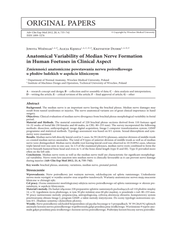 original papers Adv Clin Exp Med 2012, 21, 6, 735–742 ISSN 1899–5276 © Copyright by Wroclaw Medical University Jowita Woźniak1, A–F, Alicja Kędzia1, A, C, D–F, Krzysztof Dudek2, A–D, F Anatomical Variability of Median Nerve Formation in Human Foetuses in Clinical Aspect Zmienności anatomiczne powstawania nerwu pośrodkowego u płodów ludzkich w aspekcie klinicznym 1 2 Department of Normal Anatomy, Wroclaw Medical University, Poland Institute of Machines Design and Operation, Technical University of Wrocław, Poland A – research concept and design; B – collection and/or assembly of data; C – data analysis and interpretation; D – writing the article; E – critical revision of the article; F – final approval of article; G – other Abstract Background. The median nerve is an important nerve leaving the brachial plexus. Median nerve damages may result from tunnel syndromes or injuries. The nerve anatomical variants are of great clinical importance in hand surgery. Objectives. Clinical evaluation of median nerve divergence from brachial plexus morphological variability in foetal period. Material and Methods. The material consisted of 220 brachial plexus sections derived from 110 foetuses aged 14–32 weeks of foetal life (50 females and 60 males, in CRL: 80–233 mm). The survey incorporated the following methods: dissection, anthropological, image digital acquisition, Image J computer transformation system, GIMP programme and statistical methods. Typology assessment was based on 0/1 system. Sexual dimorphism and symmetry were examined. Results. Median nerve left directly lateral cord in 5 cases. In 59 (26.81%) plexuses, anterior division of middle trunk co-created median nerves anomalies. The total of 9 types of anterior division of middle trunk as well as of median nerve were distinguished. Median nerve double root leaving lateral cord was observed in 10 (9.09%) cases, whereas triple lateral root was seen in one case. In 1/3 of the examined plexuses, median nerve roots combined to form the nerve beneath humeral bone head and even in ½ of the bone distal length (type II and III). Type II prevailed more often on the left side. Conclusions. Median nerve roots as well as the median nerve itself are characteristic for significant morphological variability. Nerve roots low junction into median nerve is clinically favourable as it can prevent nerve damage during injuries (Adv Clin Exp Med 2012, 21, 6, 735–742). Key words: brachial plexus, anatomy, variations, median nerve, prenatal period. Streszczenie Wprowadzenie. Nerw pośrodkowy jest ważnym nerwem, odchodzącym od splotu ramiennego. Uszkodzenie nerwu może wystąpić w wyniku urazów oraz zespołów tunelowych. Warianty anatomiczne nerwu mają znaczenie kliniczne w chirurgii ręki. Cel pracy. Ocena zmienności morfologicznej odejścia nerwu pośrodkowego od splotu ramiennego w okresie prenatalnym, w aspekcie klinicznym. Materiał i metody. Do badań włączono 220 preparatów splotów ramiennych pochodzących od 110 płodów między 14. a 32. tygodniem życia płodowego, w tym 50 płci żeńskiej oraz 60 płci męskiej, w przedziale v-tub: 80–233 mm. W pracy zastosowano metody: preparacyjną, antropologiczną, cyfrową akwizycję obrazów, komputerowy system przetwarzania obrazu Image J, program GIMP, a także metody statystyczne. Do oceny typologii zastosowano system 0/1. Zbadano symetrię i dymorfizm płciowy. Wyniki. Nerw pośrodkowy odchodził bezpośrednio od pęczka bocznego w 5 przypadkach. W 59 (26,81%) splotach anomalie korzeni nerwu pośrodkowego współtworzyła gałąź przednia pnia środkowego. Wyróżniono 9 typów anomalii gałęzi przedniej pnia środkowego i korzeni nerwu pośrodkowego. Podwójny korzeń boczny nerwu pośrodko- 736 J. Woźniak, A. Kędzia, K. Dudek wego, odchodzący od pęczka bocznego zaobserwowano w 10 (9,09%) przypadkach, potrójny korzeń boczny w jednym. W 1/3 badanych splotów korzenie nerwu pośrodkowego łączyły się w nerw poniżej głowy kości ramiennej, nawet w ½ dystalnej długości kości (typ II i III). Typ II występował częściej po stronie lewej. Wnioski. Korzenie nerwu pośrodkowego oraz nerw pośrodkowy charakteryzuje duża zmienność morfologiczna. Niskie połączenie korzeni nerwu w nerw pośrodkowy jest korzystne klinicznie, gdyż może zapobiec uszkodzeniu nerwu podczas urazów (Adv Clin Exp Med 2012, 21, 6, 735–742). Słowa kluczowe: splot ramienny, anatomia, warianty, nerw pośrodkowy, okres prenatalny. Median nerve is formed from lateral root and median nerve medial root into common stem. Lateral root is lateral cord extension whereas medial root rises from medial cord. Median nerve (C6–Th1) undergoes damages due to ulnar joint injuries. Clinical image reveals: impaired fingers flexion in interphalangeal joints, atrophy of thumb abduction, flexion and opposition, fingers flexion impairment in proximal interphalangeal joints, hand backtrack and abduction disorder. In hand bending action, only IV, V and partly III fingers bend (blessing hand) and thenar muscle atrophy begins. This nerve can also undergo impairment in the humeral segment. Autopsical studies of peripheral nerves and brachial plexuses were carried out as early as in the 19th century. In 1896, Paterson described peripheral nerves segmental distribution in both limbs as well as particular muscles innervation [1]. In 1904, Harris examined mammals and vertebrates plexuses morphological variants and distribution [2]. In turn, Kerr presented numerous morphological variants of brachial plexus elaborated on the basis of autopsical examinations made in the period 1895–1910 which comprised 175 brachial plexuses originating from adult corpses [3]. Brachial plexus and terminal nerves variability were examined in adults by Matejcik [4], in newborns by Uzun and Bilgic [5] and foetuses by Uysal et al. [6]. Available literature does not provide much information concerning brachial plexus surve