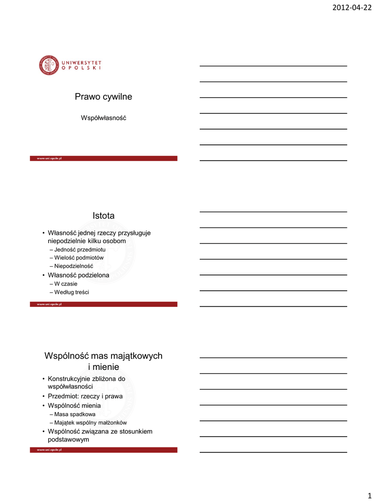 2012-04-22 Prawo cywilne Współwłasność Istota • Własność jednej rzeczy przysługuje niepodzielnie kilku osobom – Jedność przedmiotu – Wielość podmiotów – Niepodzielność • Własność podzielona – W czasie – Według treści Wspólność mas majątkowych i mienie • Konstrukcyjnie zbliżona do współwłasności • Przedmiot: rzeczy i prawa • Wspólność mienia – Masa spadkowa – Majątek wspólny małżonków • Wspólność związana ze stosunkiem podstawowym 1 2012-04-22 Rodzaje współwłasności • Łączna – Masy majątkowe – Bez oznaczania wysokości udziałów – Wynika z określonego stosunku prawnego • Na częściach ułamkowych – Samoistny stosunek prawnorzeczowy – Udział oznaczony ułamkiem idealnym – Udziałem można rozporządzać Źródła współwłasności • • • • Dziedziczenie Czynność prawna Orzeczenie sądowe Przepis ustawy – Nieuchomość wspólna (lokale) – Niektóre cmentarze wyznaniowe Udział we współwłasności • • • • Jedno prawo = suma udziałów Udział w niepodzielnym prawie Ułamek idealny Można rozporządzać bez zgody innych współwłaścicieli • Wielkość udziałów ma znaczenie – Decyzje dotyczące rzeczy – Pożytki i przychody 2 2012-04-22 Uprawnienia i obowiąązki współwłaścicieli • • • • Współposiadanie Współkorzystanie Ponoszenie ciężarów Modele regulacji – Ustawowy – Umowny – sądowy Zarząd rzeczą wspólną • Zarząd: dokonywanie czynności faktycznych i prawnych dotyczących rzeczy • Czynności zachowawcze • Zarząd ustawowy – Zwykły zarząd – Czynności przekraczające zakres zwykłego zarządu Zarząd II • Zarząd umowny – Decyduje wola współwłaścicieli – Możliwość wyznaczenia zarządcy • Zarząd sądowy – Zarządca wyznaczany przez sąd – Na wniosek współwłaściciela – Zarządca pod kontrolą sądu i współwłaścicieli 3 2012-04-22 Współposiadanie i współkorzystanie z rzeczy • Prawo współwłaściciela • W zakresie do pogodzenia z prawami pozostałych • Umownie – Podział w czasie – Według pożytków – W przestrzeni (quoad usum) – Bezpośrednie i pośrednie korzystanie Model sądowy/Korzyści i ciężary • Sąd może określić sposób korzystania z rzeczy wspólnej • Korzyści i ciężary – Pożytki proporcjonalnie do wielkości udziałów – Ciężary proporcjonalnie do wielkości udziałów Zniesienie współwłasności • Współwłasność nie jest stanem preferowanym przez ustawodawcę • Roszczenie – Przysługuje każdemu współwłaścicielowi – Można wyłączyć na czas określony • Tryby – Sądowy – Umowny 4 2012-04-22 Sposoby zniesienia współwłasności • Podział fizyczny – Tylko niektóre rzeczy – W wyniku podziału powstają nowe rzeczy • Przyznanie rzeczy na własność współwłaścicielowi + spłata pozostałych • Podział cywilny (sprzedaż) • Szczególne przepisy o gospodarstwach rolnych. 5