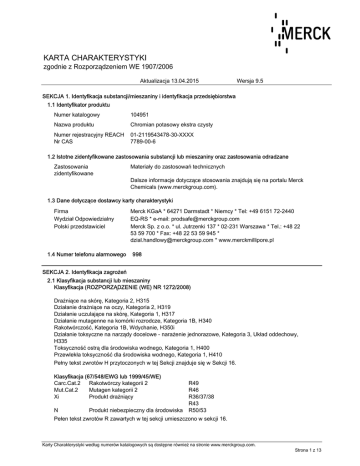 KARTA CHARAKTERYSTYKI zgodnie z Rozporządzeniem WE 1907/2006 Aktualizacja 13.04.2015 Wersja 9.5 SEKCJA 1. Identyfikacja substancji/mieszaniny i identyfikacja przedsiębiorstwa 1.1 Identyfikator produktu Numer katalogowy 104951 Nazwa produktu Chromian potasowy ekstra czysty Numer rejestracyjny REACH Nr CAS 01-2119543478-30-XXXX 7789-00-6 1.2 Istotne zidentyfikowane zastosowania substancji lub mieszaniny oraz zastosowania odradzane Zastosowania zidentyfikowane Materiały do zastosowań technicznych Dalsze informacje dotyczące stosowania znajdują się na portalu Merck Chemicals (www.merckgroup.com). 1.3 Dane dotyczące dostawcy karty charakterystyki Firma Wydział Odpowiedzialny Polski przedstawiciel 1.4 Numer telefonu alarmowego Merck KGaA * 64271 Darmstadt * Niemcy * Tel: +49 6151 72-2440 EQ-RS * e-mail: [email protected] Merck Sp. z o.o. * ul. Jutrzenki 137 * 02-231 Warszawa * Tel.: +48 22 53 59 700 * Fax: +48 22 53 59 945 * [email protected] * www.merckmillipore.pl 998 SEKCJA 2. Identyfikacja zagrożeń 2.1 Klasyfikacja substancji lub mieszaniny Klasyfikacja (ROZPORZĄDZENIE (WE) NR 1272/2008) Drażniące na skórę, Kategoria 2, H315 Działanie drażniące na oczy, Kategoria 2, H319 Działanie uczulające na skórę, Kategoria 1, H317 Działanie mutagenne na komórki rozrodcze, Kategoria 1B, H340 Rakotwórczość, Kategoria 1B, Wdychanie, H350i Działanie toksyczne na narządy docelowe - narażenie jednorazowe, Kategoria 3, Układ oddechowy, H335 Toksyczność ostrą dla środowiska wodnego, Kategoria 1, H400 Przewlekła toksyczność dla środowiska wodnego, Kategoria 1, H410 Pełny tekst zwrotów H przytoczonych w tej Sekcji znajduje się w Sekcji 16. Klasyfikacja (67/548/EWG lub 1999/45/WE) Carc.Cat.2 Rakotwórczy kategorii 2 Mut.Cat.2 Mutagen kategorii 2 Xi Produkt drażniący N Produkt niebezpieczny dla środowiska R49 R46 R36/37/38 R43 R50/53 Pełen tekst zwrotów R zawartych w tej sekcji umieszczono w sekcji 16. Karty Charakterystyki według numerów katalogowych są dostępne również na stronie www.merckgroup.com. Strona 1 z 13 KARTA CHARAKTERYSTYKI zgodnie z Rozporządzeniem WE 1907/2006 Numer katalogowy Nazwa produktu 104951 Chromian potasowy ekstra czysty 2.2 Elementy oznakowania Oznakowanie (ROZPORZĄDZENIE (WE) NR 1272/2008) Piktogramy określające rodzaj zagrożenia Hasło ostrzegawcze Niebezpieczeństwo Zwroty wskazujące rodzaj zagrożenia H340 Może powodować wady genetyczne. H350i Wdychanie może spowodować raka. H315 Działa drażniąco na skórę. H317 Może powodować reakcję alergiczną skóry. H319 Działa drażniąco na oczy. H335 Może powodować podrażnienie dróg oddechowych. H410 Działa bardzo toksycznie na organizmy wodne, powodując długotrwałe skutki. Zwroty wskazujące środki ostrożności Zapobieganie P201 Przed użyciem zapoznać się ze specjalnymi środkami ostrożności. P273 Unikać uwolnienia do środowiska. P280 Stosować rękawice ochronne. Reagowanie P302 + P352 W PRZYPADKU KONTAKTU ZE SKÓRĄ: Umyć dużą ilością wody z mydłem. P305 + P351 + P338 W PRZYPADKU DOSTANIA SIĘ DO OCZU: Ostrożnie płukać wodą przez kilka minut. Wyjąć soczewki kontaktowe, jeżeli są i można je łatwo usunąć. Nadal płukać. P308 + P313 W przypadku narażenia lub styczności: Zasięgnąć porady/ zgłosić się pod opiekę lekarza. Produkt przeznaczony wyłącznie do użytku zawodowego. Etykietowanie dla opakowań o poj. nie większej niż 125 ml Dz.U.01.11.84 Piktogramy określające rodzaj zagrożenia Hasło ostrzegawcze Niebezpieczeństwo Zwroty wskazujące rodzaj zagrożenia H340 Może powodować wady genetyczne. H350i Wdychanie może spowodować raka. H317 Może powodować reakcję alergiczną skóry. Zwroty wskazujące środki ostrożności P201 Przed użyciem zapoznać się ze specjalnymi środkami ostrożności. P280 Stosować rękawice ochronne. P302 + P352 W PRZYPADKU KONTAKTU ZE SKÓRĄ: Umyć dużą ilością wody z mydłem. P308 + P313 W przypadku narażenia lub styczności: Zasięgnąć porady/ zgłosić się pod opiekę lekarza. Produkt przeznaczony wyłącznie do użytku zawodowego. Karty Charakterystyki według numerów katalogowych są dostępne również na stronie www.merckgroup.com. Strona 2 z 13 KARTA CHARAKTERYSTYKI zgodnie z Rozporządzeniem WE 1907/2006 Numer katalogowy Nazwa produktu 104951 Chromian potasowy ekstra czysty Nr Indeksu 024-006-00-8 2.3 Inne zagrożenia Nieznane. SEKCJA 3. Skład/informacja o składnikach 3.1 substancja Wzór chemiczny K₂CrO₄ Nr Indeksu 024-006-00-8 Nr WE 232-140-5 Masa molowa 194,19 g/mol CrK₂O₄ (Hill) Składniki niebezpieczne (ROZPORZĄDZENIE (WE) NR 1272/2008) Nazwa Chemiczna (Stężenie) Nr CAS Numer rejestracji Klasyfikacja chromian potasowy (>= 50 % - <= 100 % ) Podane stężenie jest procentem masy jonów chromianowych rozpuszczonych w wodzie, obliczonym w stosunku do całkowitej masy mieszaniny. 7789-00-6 01-2119543478-30XXXX Rakotwórczość, Kategoria 1B, H350i Działanie mutagenne na komórki rozrodcze, Kategoria 1B, H340 Działanie drażniące na oczy, Kategoria 2, H319 Działanie toksyczne na narządy docelowe - narażenie jednorazowe, Kategoria 3, H335 Drażniące na skórę, Kategoria 2, H315 Działanie uczulające na skórę, Kategoria 1, H317 Toksyczność ostrą dla środowiska wodnego, Kategoria 1, H400 Przewlekła toksyczność dla środowiska wodnego, Kategoria 1, H410 Współczynnik M: 10 Pełny tekst zwrotów H przytoczonych w tej Sekcji znajduje się w Sekcji 16. Składniki niebezpieczne (1999/45/WE) Nazwa Chemiczna (Stężenie) Nr CAS Klasyfikacja chromian potasowy (>= 50 % - <= 100 % ) Podane stężenie jest procentem masy jonów chromianowych rozpuszczonych w wodzie, obliczonym w stosunku do całkowitej masy mieszaniny. 7789-00-6 Carc.Cat.2; R49 Mut.Cat.2; R46 Xi, Produkt drażniący; R36/37/38 R43 N, Produkt niebezpieczny dla środowiska; R50-53 Współczynnik M: 10 Pełen tekst zwrotów R zawartych w tej sekcji umieszczono w sekcji 16. 3.2 Mieszanina