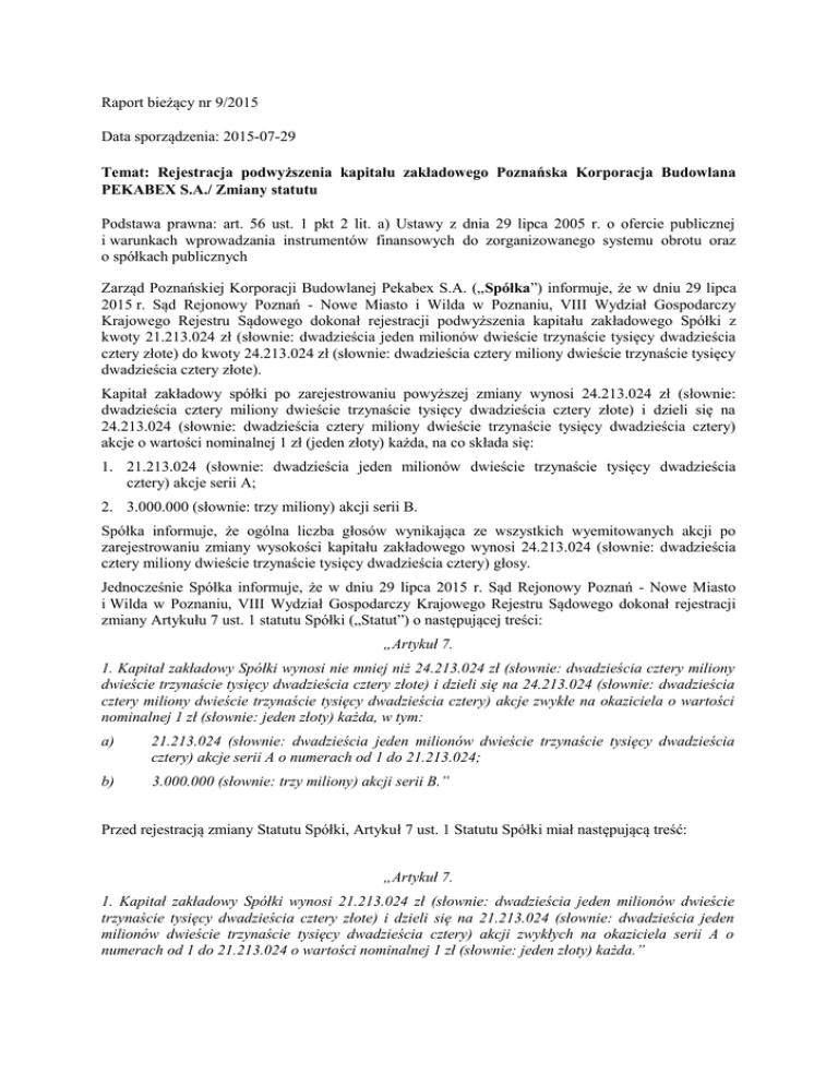 Raport bieżący nr 9/2015 Data sporządzenia: 2015-07-29 Temat: Rejestracja podwyższenia kapitału zakładowego Poznańska Korporacja Budowlana PEKABEX S.A./ Zmiany statutu Podstawa prawna: art. 56 ust. 1 pkt 2 lit. a) Ustawy z dnia 29 lipca 2005 r. o ofercie publicznej i warunkach wprowadzania instrumentów finansowych do zorganizowanego systemu obrotu oraz o spółkach publicznych Zarząd Poznańskiej Korporacji Budowlanej Pekabex S.A. („Spółka”) informuje, że w dniu 29 lipca 2015 r. Sąd Rejonowy Poznań - Nowe Miasto i Wilda w Poznaniu, VIII Wydział Gospodarczy Krajowego Rejestru Sądowego dokonał rejestracji podwyższenia kapitału zakładowego Spółki z kwoty 21.213.024 zł (słownie: dwadzieścia jeden milionów dwieście trzynaście tysięcy dwadzieścia cztery złote) do kwoty 24.213.024 zł (słownie: dwadzieścia cztery miliony dwieście trzynaście tysięcy dwadzieścia cztery złote). Kapitał zakładowy spółki po zarejestrowaniu powyższej zmiany wynosi 24.213.024 zł (słownie: dwadzieścia cztery miliony dwieście trzynaście tysięcy dwadzieścia cztery złote) i dzieli się na 24.213.024 (słownie: dwadzieścia cztery miliony dwieście trzynaście tysięcy dwadzieścia cztery) akcje o wartości nominalnej 1 zł (jeden złoty) każda, na co składa się: 1. 21.213.024 (słownie: dwadzieścia jeden milionów dwieście trzynaście tysięcy dwadzieścia cztery) akcje serii A; 2. 3.000.000 (słownie: trzy miliony) akcji serii B. Spółka informuje, że ogólna liczba głosów wynikająca ze wszystkich wyemitowanych akcji po zarejestrowaniu zmiany wysokości kapitału zakładowego wynosi 24.213.024 (słownie: dwadzieścia cztery miliony dwieście trzynaście tysięcy dwadzieścia cztery) głosy. Jednocześnie Spółka informuje, że w dniu 29 lipca 2015 r. Sąd Rejonowy Poznań - Nowe Miasto i Wilda w Poznaniu, VIII Wydział Gospodarczy Krajowego Rejestru Sądowego dokonał rejestracji zmiany Artykułu 7 ust. 1 statutu Spółki („Statut”) o następującej treści: „Artykuł 7. 1. Kapitał zakładowy Spółki wynosi nie mniej niż 24.213.024 zł (słownie: dwadzieścia cztery miliony dwieście trzynaście tysięcy dwadzieścia cztery złote) i dzieli się na 24.213.024 (słownie: dwadzieścia cztery miliony dwieście trzynaście tysięcy dwadzieścia cztery) akcje zwykłe na okaziciela o wartości nominalnej 1 zł (słownie: jeden złoty) każda, w tym: a) 21.213.024 (słownie: dwadzieścia jeden milionów dwieście trzynaście tysięcy dwadzieścia cztery) akcje serii A o numerach od 1 do 21.213.024; b) 3.000.000 (słownie: trzy miliony) akcji serii B.” Przed rejestracją zmiany Statutu Spółki, Artykuł 7 ust. 1 Statutu Spółki miał następującą treść: „Artykuł 7. 1. Kapitał zakładowy Spółki wynosi 21.213.024 zł (słownie: dwadzieścia jeden milionów dwieście trzynaście tysięcy dwadzieścia cztery złote) i dzieli się na 21.213.024 (słownie: dwadzieścia jeden milionów dwieście trzynaście tysięcy dwadzieścia cztery) akcji zwykłych na okaziciela serii A o numerach od 1 do 21.213.024 o wartości nominalnej 1 zł (słownie: jeden złoty) każda.” PODPISY OSÓB REPREZENTUJĄCYCH SPÓŁKĘ 2015-07-29 Robert Jędrzejowski Prezes Zarządu 2015-07-29 Beata Żaczek Wiceprezes Zarządu