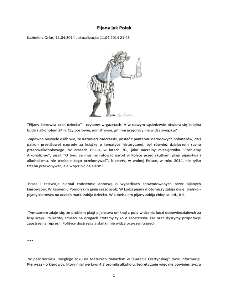 Pijany jak Polak Kazimierz Orłoś 11.04.2014 , aktualizacja: 11.04.2014 21:45 ''Pijany kierowca zabił dziecko'' - czytamy w gazetach. A w naszym sąsiedztwie otwiera się kolejna buda z alkoholem 24 h. Czy posłowie, ministrowie, gminni urzędnicy nie widzą związku? Zapewne niewiele osób wie, że Kazimierz Moczarski, postać z panteonu narodowych bohaterów, dziś patron prestiżowej nagrody za książkę o tematyce historycznej, był również działaczem ruchu przeciwalkoholowego. W czasach PRL-u, w latach 70., jako naczelny miesięcznika ''Problemy Alkoholizmu'', pisał: ''O tym, że musimy ratować naród w Polsce przed skutkami plagi pijaństwa i alkoholizmu, nie trzeba nikogo przekonywać''. Niestety, w wolnej Polsce, w roku 2014, nie tylko trzeba przekonywać, ale wręcz bić na alarm! Prasa i telewizja niemal codziennie donoszą o wypadkach spowodowanych przez pijanych kierowców. W Kamieniu Pomorskim ginie sześć osób, W Łodzi pijany motorniczy zabija dwie. Bielsko pijany kierowca na oczach matki zabija dziecko. W Lubelskiem pijany zabija chłopca. Itd., itd. Tymczasem zdaje się, że problem plagi pijaństwa umknął z pola widzenia ludzi odpowiedzialnych za losy kraju. Po każdej śmierci na drogach czytamy tylko o zaostrzeniu kar oraz słyszymy propozycje zaostrzenia represji. Politycy dostrzegają skutki, nie widzą przyczyn tragedii. *** W październiku ubiegłego roku na Mazurach znalazłem w ''Gazecie Olsztyńskiej'' dwie informacje. Pierwszą - o kierowcy, który miał we krwi 4,8 promila alkoholu, teoretycznie więc nie powinien żyć, a 1 jednak przeżył. Rozbił tylko samochód i zabił pasażera. Drugą - o dwóch siedemnastolatkach z Giżycka, Macieju W. i Karolu S., którzy zamordowali posądzonego o kradzież kolegę, a ''krwawe zajście z użyciem siekiery'' nagrali na komórkę. W sądzie swoje zeznania Maciej W. zaczął od słów: ''Kur , nie pamiętam, byłem pijany''. Z dalszych zeznań wynika, że siedemnastolatek ma już dziewczynę i dziecko. Można by powiedzieć, że oto mamy nowy model polskiej rodziny, o jakim prześcigający się w prorodzinnych deklaracjach politycy oraz obrońcy życia poczętego starają się nie pamiętać. Cofnijmy się więc znów w lata 70. W 10. numerze ''Zdrowia i Trzeźwości'' z roku 1975, w artykule ''Fizyczny i psychiczny rozwój dzieci z rodzin alkoholików'', czytamy: ''Alkohol jest wrogiem dziecka już od chwili jego poczęcia. W ciągu kilkudziesięciu minut przenika do plemników i komórki jajowej. Z krwią kobiety alkohol dostaje się do rozwijającego się płodu, często powodując zwyrodnieniowe zmiany. W rezultacie nadużywania alkoholu przez rodziców na świat przychodzą dzieci niedorozwinięte, upośledzone umysłowo, które przez całe życie będą ciężarem nie tylko dla najbliższych, ale całego społeczeństwa''. Sądzę, że sprawa dzieci upośledzonych przez alkoholizm rodziców, opisywana w Polsce cztery dekady temu, dziś stała się wielkim problemem społecznym. Podobnie jak problem armii młodych Polaków, z reguły bezrobotnych, od rana pijanych, wystających pod sklepami z alkoholem i nagabujących o kilka groszy na piwo. Są widoczni w każdym mieście, wsi, dzielnicy. Ilu takich młodych żyje w naszym kraju? Dwa miliony? Trzy miliony? Więcej? Według danych GUS opublikowanych przez Państwową Agencję Rozwiązywania Problemów Alkoholowych w roku 2011 na statystycznego Polaka - wliczając starców i niemowlęta - przypadało 9,25 litra czystego spirytusu. W tym roku będzie zapewne więcej, bo tendencja jest wzrostowa. Należymy do grona tych krajów europejskich, w których wciąż pije się głównie mocne wódki, i to pije na umór, do dna. Nic dziwnego, że stereotyp ''pijany jak Polak'' jest nadal żywy. *** Istnieje oczywiście fasada - prawne uregulowania, z ustawą ''O wychowaniu w trzeźwości i przeciwdziałaniu alkoholizmowi'' na czele. W jej preambule czytamy: ''Uznając życie obywateli w trzeźwości za niezbędny warunek moralnego i materialnego dobra Narodu, stanowi się...''. I dalej, w art. 1. punkt 1.: ''Organy administracji rządowej i jednostek samorządu terytorialnego są obowiązane do podejmowania działań zmierzających do ograniczenia spożycia napojów alkoholowych''. Jest jeszcze art. 2., w którym punkt 4. mówi, że te same organy zobowiązane są do ''ograniczania dostępności do alkoholu''. Wystarczy jednak przeczytać uważnie artykuł 12. tejże ustawy, by powstało wrażenie, że słuszne założenia są tylko pustymi deklaracjami. Oto bowiem dowiadujemy się, że to lokalni radni ustalają ''dla terenu Gminy (miasta) liczbę punktów sprzedaży napojów alkoholowych (powyżej 4,5 proc.) 2 przeznaczonych do spożycia poza miejscem sprzedaży, jak i w miejscu''. Rady gminy ''ustalają również zasady usytuowania miejsc sprzedaży''. Żadnych ograniczeń w owym ''ustalaniu'' ustawodawca nie przewidział. No i w całej Polsce rady ustalają! Kierując się perspektywą zysków, jakie przynoszą gminom ''punkty sprzedaży napojów alkoholowych'', zapominają oczywiście o preambule ustawy i obowiązku ''ograniczania spożycia i dostępności''. Co więcej, punkt 4. artykułu 12. mówi wyraźnie, że: ''Liczba punktów i usytuowanie powinny być dostosowane do potrzeb ograniczenia dostępności do alkoholu określonych w gminnym programie profilaktyki i rozwiązywania problemów alkoholowych''. Zatem ''potrzeba ograniczenia dostępności'' jest dostosowywana do ''programu'', a nie program do potrzeby! Ze wszystkimi dalszymi skutkami tej zasady. *** Zapisane w ustawie słowa o ''ograniczeniu spożycia'' i ''ograniczeniu dostępności'' sugerują, że władze niepodległej Polski rozumieją, czym grozi odstąpienie od tych zasad. Jednak to złudna wiara. Być może rozumieją, ale odstępują, tolerując istnienie tysięcy legalnych melin pijackich. Bo czym innym są w istocie wszystkie te czynne całą dobę budy z alkoholem nazywane przez urz