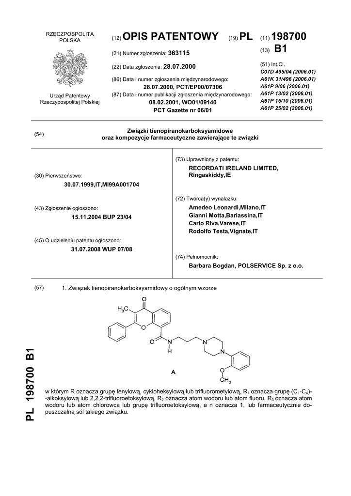 N-{3-[4-[2-metoksy-5-(2,2,2-trifluoroetoksy)fenylo]-1-piperazinylo]-propylo}-7-okso-5-fenylo-7Htieno[3,2-b]pirano-3-karboksyamid, i