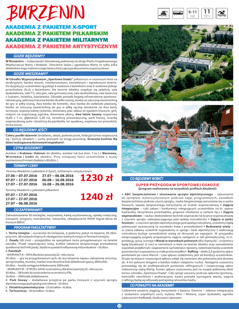 BURZENIN 5-11 lat 11 dni AKADEMIA Z PAKIETEM X-SPORT AKADEMIA Z PAKIETEM PIŁKARSKIM AKADEMIA Z PAKIETEM MILITARNYM AKADEMIA Z PAKIETEM ARTYSTYCZNYM GDZIE BĘDZIEMY? W Burzeninie – miejscowości letniskowej położonej na skraju Parku Krajobrazowego Międzyrzecza Warty i Widawki. Otoczenie lasów i sąsiedztwo Warty to tylko kilka składników tego malowniczego terenu który sprzyja aktywnemu wypoczynkowi. GDZIE MIESZKAMY? W Ośrodku Wypoczynkowym „Sportowa Osada” położonym w sosnowym lesie na atrakcyjnym, bardzo dużym, monitorowanym, oświetlonym i ogrodzonym terenie. Do dyspozycji uczestników są pokoje 3-osobowe z łazienkami oraz 5-osobowe pokoje przechodnie (3+2) z łazienkami. Na terenie obiektu znajduje się jadalnia, sala dyskotekowa, sala TV, sala gier, sala gimnastyczna, sala dyskotekowa, sala taneczna z lustrami, świetlica, kawiarenka. Ośrodek posiada bogatą infrastrukturę sportoworekreacyjną: pełnowymiarowe boisko do piłki nożnej, boisko ze sztuczną nawierzchnią do gry w piłkę nożną, dwa boiska do kometki, dwa boiska do siatkówki plażowej, boisko ze sztuczną nawierzchnią do gry w piłkę ręczną zamiennie na dwa korty tenisowe, wypożyczalnię rowerów, drewniany plac zabaw ze zjazdem linowym, grill, miejsce na organizację ogniska, drewniane altany, dwa letnie baseny rozporowe (3,60 x 7 m, głębokość 1,20 m), strzelnicę pneumatyczną, park linowy, ściankę wspinaczkową, pole i strzelnicę do paintballa, tor quadowy, wojskowy tor przeszkód, tor łuczniczy. CO BĘDZIEMY JEŚĆ? Cztery posiłki dziennie (śniadanie, obiad, podwieczorek, kolacja) turnus rozpoczyna się i kończy obiadem + suchy prowiant na drogę powrotną. Smaczna kuchnia dla dzieci wzbogacona domowymi wypiekami! CZYM JEDZIEMY? Autokar z Krakowa i Katowic do obiektu, autokar lub bus (min. 7 os.) z Warszawy, Wrocławia i Łodzi do obiektu. Przy mniejszej ilości uczestników z wyżej wymienionych miast dopłata (+50 zł/os.). TERMINY I CENY Terminy Akademii z pakietem X-Sport, militarnym i artystycznym 27.06 – 07.07.2016 07.07 – 17.07.2016 17.07 – 27.07.2016 27.07 – 06.08.2016 06.08 – 16.08.2016 16.08 – 26.08.2016 1230 zł CO BĘDZIEMY ROBIĆ? SUPER PRZYGODA W SPORTOWEJ OSADZIE (program realizowany na wszystkich profilach Akademii) Terminy Akademii z pakietem piłkarskim 07.07 – 17.07.2016 17.07 – 27.07.2016 27.07 – 06.08.2016 1240 zł • ABC bezpieczeństwa i stosowania sprzętu alpinistycznego – zapoznanie ze sprzętem wykorzystywanym podczas zajęć programowych, zasadami bezpieczeństwa podczas użycia sprzętu, nauka bezpiecznego poruszania się w parku linowym, zasady bezpiecznego korzystania ze ścianki wspinaczkowej • Zajęcia integracyjne – cykl zabaw i konkurencji integrujących uczestników (m.in. spacer hydraulika, skrzynkowa przechadzka, grupowe chodzenie w nartach itp.) • Zajęcia wspinaczkowe – nauka i doskonalenie techniki wspinaczki na ściance wspinaczkowej z użyciem sprzętu zabezpieczającego pod opieką instruktorów • Zajęcia w parku linowym – z użyciem sprzętu alpinistycznego pod opieką instruktora, uczestnicy będą pokonywać wyznaczoną na wysokości trasę z przeszkodami • Budowanie wieży – w czasie zabawy uczestnik wyposażony w uprząż i kask alpinistyczny z asekuracją instruktora buduje samodzielnie wieżę ze skrzynek po napojach. W przypadku niesprzyjającej pogody proponujemy zajęcia zastępcze w sali gimnastycznej, m.in. prelekcję, quizy, turnieje • Biwak w warunkach polowych (dla chętnych) – uczestnicy będą biwakować (1 noc) w namiotach w lesie na terenie obiektu oraz samodzielnie wypiekać podpłomyki (zapewnione są materace i śpiwory, natomiast każdy uczestnik powinien być wyposażony w małe prześcieradło) • Rafting – około 2,5 godzinny spływ pontonami po rzece Warcie - czas spływu uzależniony jest od kondycji uczestników. Grupa na miejsce rozpoczęcia spływu udaje się rowerami (do pokonania jest dystans ok. 4 km polnymi drogami o bardzo małym natężeniu ruchu). Następnie uczestnicy przesiadają się do profesjonalnych pontonów raftingowych i rozpoczynają spływ malowniczą rzeką Wartą. Koniec spływu usytuowany jest na wyspie położonej obok terenu ośrodka „Sportowa Osada”. Cały sprzęt używany podczas spływów (pontony, kamizelki ratunkowe i asekuracyjne, kaski) posiada wymagane atesty, zajęcia z raftingu będą się odbywały pod opieką ratownika i kadry. CO ZAPEWNIAMY? Zakwaterowanie 10 noclegów, wyżywienie, kadrę wychowawczą, opiekę medyczną, transport, program, instruktorów, ratownika, ubezpieczenie NNW Signal Iduna do kwoty 6.000 zł. PROGRAM FAKULTATYWNY 1. Termy Uniejów – wycieczka do Uniejowa, 2-godzinny pobyt na basenie, 65 zł/os. przy min. 40 osobach chętnych i dostępności wolnych miejsc w Termach Uniejów. 2. Quady (10 min) – przejażdżka na specjalnym torze przygotowanym na terenie ośrodka. Przed rozpoczęciem trasy, krótkie szkolenie bezpiecznego prowadzenia quada oraz techniki jazdy. Jazda na quadach odbywa się indywidualnie – 15 zł/os. 3. Paintball: - WARIANT A – GRA dla dzieci powyżej 12. roku życia: 25 zł/os. – gra na przygotowanym polu do wyczerpania zapasu zakupionej amunicji, sprzęt (maska, mundur, marker oraz dowolna ilość doładowań gazu), 100 kulek; 10 zł/os. – każde następne doładowanie 100 kulek. - WARIANT B – STRZELANIE na strzelnicy dla dzieci poniżej 12. roku życia: 10 zł/os. – 50 kulek do wystrzelenia na strzelnicy PB; 15 zł/os. – 100 kulek doładowania. 4. Park linowy – dodatkowe przejście po parku linowym z użyciem sprzętu alpinistycznego pod opieką instruktora – 12 zł/os. 5. Strzelnica pneumatyczna – 12 strzałów – 6 zł/os. 6. Tor łuczniczy – 10 strzałów – 6 zł/os. CO PONADTO NA AKADEMII? Codziennie poranny jogging; korzystanie z basenu; Domino – zabawa integracyjna z szukaniem wspólnych cech; wybory Miss i Mistera, super dyskoteki; ognisko z 
