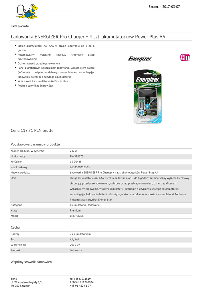 Szczecin 2017-03-07 Karta produktu: Ładowarka ENERGIZER Pro Charger + 4 szt. akumulatorków Power Plus AA ładuje akumulatorki AA, AAA w czasie ładowania od 3 do 6 godzin Automatyczny wyłącznik czasowy chroniący przed przeładowaniem Ochrona przed przebiegunowaniem Panel z graficznym wskaźnikiem ładowania, wskaźnikiem baterii (informuje o użyciu właściwego akumulatorka, zapobiegając ładowaniu baterii lub zużytego akumulatorka) W zestawie 4 akumulatorki AA Power Plus Posiada certyfikat Energy Star Cena 118,71 PLN brutto Podstawowe parametry produktu Numer produktu w systemie 24739 Nr dostawcy EN-398373 Nr Celcen 13-00425 Kod kreskowy 7638900398373 Nazwa produktu Ładowarka ENERGIZER Pro Charger + 4 szt. akumulatorków Power Plus AA Opis ładuje akumulatorki AA, AAA w czasie ładowania od 3 do 6 godzin; automatyczny wyłącznik czasowy chroniący przed przeładowaniem; ochrona przed przebiegunowaniem; panel z graficznym wskaźnikiem ładowania, wskaźnikiem baterii (informuje o użyciu właściwego akumulatorka, zapobiegając ładowaniu baterii lub zużytego akumulatorka); w zestawie 4 akumulatorki AA Power Plus; posiada certyfikat Energy Star Kategoria Akumulatorki i ładowarki Klasa Premium Marka ENERGIZER Cecha Rodzaj Z akumulatorkami Typ AA, AAA W ofercie od 2015-07 Produkt ładowarka Wspólny słownik zamówień Toris ul. Władysława Jagieły 9/1 70-260 Szczecin NIP: 8521011619 REGON: 811220024 +48 91 482 51 77 Szczecin 2017-03-07 Karta katalogowa produktu cd. Ładowarka ENERGIZER Pro Charger + 4 szt. akumulatorków Power Plus AA CPV 31411000-0 Certyfikaty Hit Hit Nowy produkt w ofercie Standard Serdecznie zapraszamy do współpracy Toris zespół. Toris ul. Władysława Jagieły 9/1 70-260 Szczecin NIP: 8521011619 REGON: 811220024 +48 91 482 51 77