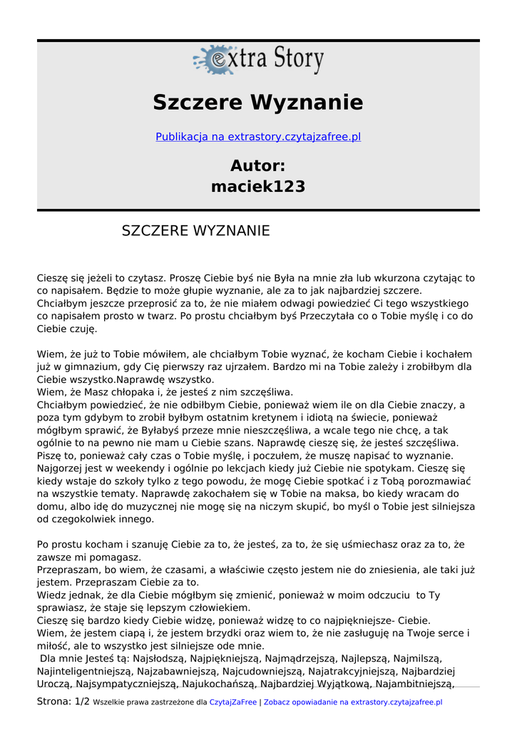 Szczere Wyznanie Publikacja na extrastory.czytajzafree.pl Autor: maciek123 SZCZERE WYZNANIE Cieszę się jeżeli to czytasz. Proszę Ciebie byś nie Była na mnie zła lub wkurzona czytając to co napisałem. Będzie to może głupie wyznanie, ale za to jak najbardziej szczere. Chciałbym jeszcze przeprosić za to, że nie miałem odwagi powiedzieć Ci tego wszystkiego co napisałem prosto w twarz. Po prostu chciałbym byś Przeczytała co o Tobie myślę i co do Ciebie czuję. Wiem, że już to Tobie mówiłem, ale chciałbym Tobie wyznać, że kocham Ciebie i kochałem już w gimnazium, gdy Cię pierwszy raz ujrzałem. Bardzo mi na Tobie zależy i zrobiłbym dla Ciebie wszystko.Naprawdę wszystko. Wiem, że Masz chłopaka i, że jesteś z nim szczęśliwa. Chciałbym powiedzieć, że nie odbiłbym Ciebie, ponieważ wiem ile on dla Ciebie znaczy, a poza tym gdybym to zrobił byłbym ostatnim kretynem i idiotą na świecie, ponieważ mógłbym sprawić, że Byłabyś przeze mnie nieszczęśliwa, a wcale tego nie chcę, a tak ogólnie to na pewno nie mam u Ciebie szans. Naprawdę cieszę się, że jesteś szczęśliwa. Piszę to, ponieważ cały czas o Tobie myślę, i poczułem, że muszę napisać to wyznanie. Najgorzej jest w weekendy i ogólnie po lekcjach kiedy już Ciebie nie spotykam. Cieszę się kiedy wstaje do szkoły tylko z tego powodu, że mogę Ciebie spotkać i z Tobą porozmawiać na wszystkie tematy. Naprawdę zakochałem się w Tobie na maksa, bo kiedy wracam do domu, albo idę do muzycznej nie mogę się na niczym skupić, bo myśl o Tobie jest silniejsza od czegokolwiek innego. Po prostu kocham i szanuję Ciebie za to, że jesteś, za to, że się uśmiechasz oraz za to, że zawsze mi pomagasz. Przepraszam, bo wiem, że czasami, a właściwie często jestem nie do zniesienia, ale taki już jestem. Przepraszam Ciebie za to. Wiedz jednak, że dla Ciebie mógłbym się zmienić, ponieważ w moim odczuciu to Ty sprawiasz, że staje się lepszym człowiekiem. Cieszę się bardzo kiedy Ciebie widzę, ponieważ widzę to co najpiękniejsze- Ciebie. Wiem, że jestem ciapą i, że jestem brzydki oraz wiem to, że nie zasługuję na Twoje serce i miłość, ale to wszystko jest silniejsze ode mnie. Dla mnie Jesteś tą: Najsłodszą, Najpiękniejszą, Najmądrzejszą, Najlepszą, Najmilszą, Najinteligentniejszą, Najzabawniejszą, Najcudowniejszą, Najatrakcyjniejszą, Najbardziej Uroczą, Najsympatyczniejszą, Najukochańszą, Najbardziej Wyjątkową, Najambitniejszą, Strona: 1/2 Wszelkie prawa zastrzeżone dla CzytajZaFree | Zobacz opowiadanie na extrastory.czytajzafree.pl Najbardziej Czarującą, Najczulszą, Najbardziej Uśmiechniętą, Najenergiczniejszą, Najwiarygodniejszą, Najtroskliwszą, Najradośniejszą, Najbardziej Pomysłową, Najwspanialszą, Najbardziej Urzekającą, Najsympatyczniejszą, Najbardziej Urokliwą, Najszczerszą, Najdelikatniejszą, Najbardziej Przekonywującą i Najważniejszą Dziewczyną jaką kiedykolwiek spotkałem w życiu. Podoba mi się w Tobie to, że Jesteś sobą i Nie Udajesz kogoś kim nie Jesteś. Bardzo chciałbym Tobie podziękować za to, że Byłaś i Jesteś ze mną i za to, że często mi doradzasz kiedy jestem zagubiony i kiedy mam problemy. DZIĘKUJĘ Tobie za to. Uwierz, że nigdy nie spotkałem tak Anielskiej Dziewczyny jak Ty. Chciałbym jeszcze zadać może trochę głupie pytanie, ale czy Miałabyś ochotę spotkać się ze mną w wakacje, byśmy wyskoczyli razem na jakiś spacer? Oczywiście jako przyjaciele, nie chciałbym Byś myślała, że chcem Ciebie odbić czy poderwać, bo nie chciałbym zniszczyć Tobie życia. Przepraszam Ciebie jeżeli coś Ciebie zdenerwowało w tym wyznaniu. Gdybyś Miała jakiś problem, albo Chciałabyś pogadać to Pamiętaj, że Możesz zawsze na mnie liczyć. Zawsze i o każdej porze. Pamiętaj, że kochałem Ciebie i kocham Ciebie nadal. Utwory „Tylko ONA” , „Tylko JEJ, Tylko dla NIEJ” oraz „Latarnia i łódka”napisałem z myślą tylko i wyłącznie o Tobie. KOCHAM CIĘ Strona: 2/2 Wszelkie prawa zastrzeżone dla CzytajZaFree | Zobacz opowiadanie na extrastory.czytajzafree.pl