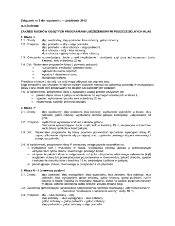 Załącznik nr 2 do regulaminu – ujeżdżenie 2012 UJEŻDŻENIE ZAKRES RUCHÓW OBJĘTYCH PROGRAMAMI UJEŻDŻENIOWYMI POSZCZEGÓLNYCH KLAS 1. Klasa L 1.1. Chody: stęp swobodny, stęp pośredni, kłus roboczy, galop roboczy. 1.2. Przejścia: stęp pośredni – stój – stęp pośredni, stęp pośredni – kłus roboczy – stęp pośredni, kłus roboczy – stój – kłus roboczy, kłus roboczy – galop roboczy – kłus roboczy. 1.3. Ćwiczenia sprawdzające: żucie z ręki (wydłużenie i obniżenie szyi przy jednoczesnym żuciu kiełzna), koło o średnicy 20 m. 1.4. Cel: Wykonanie programów klasy L powinno pokazać: • rozluźnienie, swobodę i giętkość konia; • dążność do ruchu naprzód; • wyraźny i niezmienny rytm; • akceptację kiełzna. Przejścia w klasie L do stój i ze stój mogą odbywać się poprzez stęp. Stęp swobodny jest chodem, w którym należy pozwolić koniowi na całkowitą swobodę w wyciągnięciu głowy i szyi, może być pokazywany na długich lub swobodnych wodzach. 1.5. W sędziowaniu programów klasy L zwracamy uwagę przede wszystkim na: • jakość stępa, kłusa i galopu w odniesieniu do wymagań stawianych w klasie L; • zgięcie i wykonanie rysunku koła o średnicy 20 m; • równowagę, spokój i płynność przejść. 2. Klasa P 2.1. Chody: stęp swobodny, stęp pośredni, kłus roboczy, wydłużenie wykroków w kłusie, kłus pośredni, galop roboczy, wydłużenie skoków galopu, kontrgalop, ustępowanie od łydki. 2.2. Przejścia: wydłużenie wykroków w kłusie i skoków galopu. Ćwiczenia sprawdzające: żucie z ręki, koło o średnicy 15 m, serpentyna o trzech łukach (kłus) i półkola w kontrgalopie. 2.3. Cel: Wykonanie programów tej klasy powinno potwierdzić sprostanie wymogom klasy P, zapoczątkowanie używania siły pchającej oraz uzyskania pewnego stopnia równowagi i przepuszczalności. 2.4. W sędziowaniu programów klasy P zwracamy uwagę przede wszystkim na: • wydłużenie ram i wykroków w kłusie, wydłużenie skoków galopu z jednoczesnym utrzymaniem rytmu chodu, równowagi i prostego konia; • utrzymanie jakości kłusa w ustępowaniu od łydki, utrzymaniu właściwego ustawienia (kąt) względem ściany lub przekątnej oraz pozostawania w równowadze, jakość chodów, zgięcie i wykonanie rysunku koła o średnicy 15 m, serpentyny i półkola w galopie; • jakość galopu i kłusa, równowagę w przejściach i ich płynność. 3. Klasa N – I (pierwszy poziom) 3.1. Chody: stęp pośredni, stęp wyciągnięty, stęp swobodny, kłus zebrany, kłus roboczy, kłus pośredni, kłus wyciągnięty, galop zebrany, galop roboczy, galop pośredni, ruchy boczne w kłusie (łopatką do wewnątrz, trawers), zwrot na zadzie, półpiruet roboczy w stępie, cofanie określoną liczbę kroków, zwykła zmiana nogi. 3.2. Ćwiczenia sprawdzające: uzyskiwanie samoniesienia: kontrola równowagi i ustawienia konia w ćwiczeniu "oddawania i nabierania wodzy", wolty 10 m; 3.3. Przejścia: stój – kłus zebrany – stój, kłus zebrany – kłus wyciągnięty – kłus zebrany, galop zebrany – galop pośredni – galop zebrany, stęp pośredni – galop zebrany – stęp pośredni. 3.4. Cel: Wykonanie programów tej klasy powinno potwierdzić sprostanie wymogom klasy L i P oraz pokazać, że poprzez dalszy trening koń jest przygotowany do przyjęcia większego obciążenia tylnych kończyn (zebranie), demonstruje większą siłę zadu (pchnięcie) w chodach pośrednich i akceptuje kiełzno. Wymagane są większe zgięcie, giętkość w obie strony, przepuszczalność, równowaga w ustawieniu i jej utrzymanie. 3.5. W sędziowaniu programów klasy N zwracamy uwagę na: • w łopatce i trawersie: jakość kłusa, kąt osi wzdłużnej konia względem kierunku ruchu, ustawienie i zgięcie, równowagę i zebranie, • w zwrocie na zadzie i w półpiruecie roboczym jakość i regularność stępa przed, w czasie, po wykonaniu zwrotu, patrzymy na wejście, samo wykonanie i wyjście (ustawienie, zgięcie, poprawność); • w kłusie i galopie pośrednim: akceptowanie większego obciążenia zadu – jednocześnie obserwując większą siłę zarówno pchającą, jak i nośną, wynikającą z bardziej akceptowanego trójpunktowego kontaktu. Konsekwencją jest większe tzw. samoniesienie, wymaganie to wyraźnie odbiega od wymagania stawianego w klasie P, w kontrgalopie: jakość (rytm, tempo) chodu, który powinien być tej samej jakości i w takiej samej równowadze; • w cofaniu: zdolność konia do utrzymania równowagi w przejściach i poprawnego kontaktu oraz regularność stawiania przekątnych par kończyn; • wolty o średnicy 10 m: większe zgięcie i większe zrównoważenie aniżeli w kołach 20 i 15 m. Ważną rolę odgrywa ich symetria i wielkość. 4. Klasa N – II (drugi poziom) Wymagania jak wyżej oraz ciąg w kłusie. W ocenie ciągu w kłusie zwracamy szczególną uwagę na: • jakość kłusa (utrzymanie rytmu, elastyczność, tempo); • poprawność i regularność ciągu, ustawienie i zgięcie, równowagę oraz odpowiedni stopień zebrania. 5. Klasa C 5.1. Chody: stęp wyciągnięty, stęp zebrany, kłus wyciągnięty, galop wyciągnięty, pojedyncza zmiana nogi, ruchy boczne w galopie; 5.2. Przejścia: stęp zebrany – stęp wyciągnięty – stęp zebrany, kłus zebrany – kłus wyciągnięty – kłus zebrany, galop zebrany – galop wyciągnięty – galop zebrany, stęp zebrany – galop zebrany – stęp zebrany, bezpośrednio z cofania ruszyć: 1) kłusem zebranym; 2) galopem zebranym. 5.3. Cel: Potwierdzenie sprostania wymaganiom poprzednich klas. Koń w programach tej klasy powinien demonstrować rytm, giętkość, akceptację kiełzna, przepuszczalność, impuls, brak skrzywienia, zebranie w każdym ruchu oraz w przejściach, zarówno do chodów zebranych, jak i z chodów zebranych. Musi występować wyraźne rozróżnienie pomiędzy chodami zebranymi i wyciągniętymi. 5.4. Przy sęd