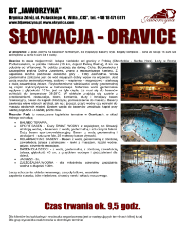 BT „JAWORZYNA” Krynica Zdrój, ul. Pułaskiego 4, Willa „CIS”, tel. +48 18 471 6171 www.btjaworzyna.pl, www.ekrynica.com SŁOWACJA - ORAVICE W programie: 3 godz. pobytu na basenach termalnych, do dyspozycji baseny kryte- bogaty kompleks – cena za wstęp 15 euro lub zewnętrzne w cenie 5 euro od 1 osoby. Oravice to mała miejscowość leżąca niedaleko od granicy z Polską (Chochołów - Sucha Hora). Leży w Rowie Podtatrzańskim, w pobliżu Habovki (10 km, dojazd Doliną Blatną), 6 km na południe od Witanowej. W pobliżu znajdują się doliny: Cicha, Bobrowiecka i szczególnie piękna Dolina Juraniowa, znana z malowniczego kanionu. Z kąpieliska można podziwiać okoliczne góry - Tatry Zachodnie. Woda geotermalna zaliczana jest do wód mających dobry wpływ na organizm. Jest wodą wysoko zmineralizowaną, sodowo – wapienno – magnezowo - siarkową z dużą zawartością żelaza. Fizykochemiczne właściwości wody geotermalnej są często wykorzystywane w balneoterapii. Naturalna woda geotermalna wypływa z głębokości 161m, jest na tyle ciepła, że musi się do basenów schłodzić do temperatury 38-28°C. W obiekcie znajdują się szatnie z przebieralniami, restauracje, bistro, kawiarnia, duży i mniejszy basen relaksacyjny, basen do kąpieli chłodzącej, pomieszczenie do masażu. Baseny zawierają wiele różnych atrakcji, jak np.: jacuzzi, grzyb wodny czy natryski do masażu obolałych mięśni. System wejść do basenów umożliwia kąpiel przy każdej pogodzie i o każdej porze roku. Meander Park to nowoczesne kąpielisko termalne w Oravicach, w skład którego wchodzą: BALNEO TERAPIA, SPORT BASEN - Duży ŚWIAT WODNY z największą na Słowacji atrakcją wodną - basenem z wodą geotermalną i sztucznymi falami. Duży basen sportowo-relaksacyjny. Basen z wodą geotermalną i atrakcjami - sztuczne fale, 25 metrowy basen pływacki, RELAKSACYJNE BASENY - Basen z wodą geotermalną z obniżoną zawartością żelaza z atrakcjami - ławki z masażem, leżaki wodne, gejzer, strumienie masujące, BASEN DLA DZIECI - z wodą geotermalną z obniżoną zawartością żelaza, głębokość 40 cm, z grzybkiem wodnym i zjeżdżalniami dla dzieci, JACUZZI - 2x, ZJEŻDŻALNIA WODNA - dla miłośników adrenaliny zjeżdżalnia wodna o długości 100m. Leczy schorzenia: układu nerwowego, zespoły bólowe, wszelakie zapalenia stawów, bóle mięśniowe, choroby nerek i układu moczowego. Czas trwania ok. 9,5 godz. Dla klientów indywidualnych wycieczka organizowana jest w następujących terminach kliknij tutaj Dla grup wycieczka realizowana w dowolnym terminie