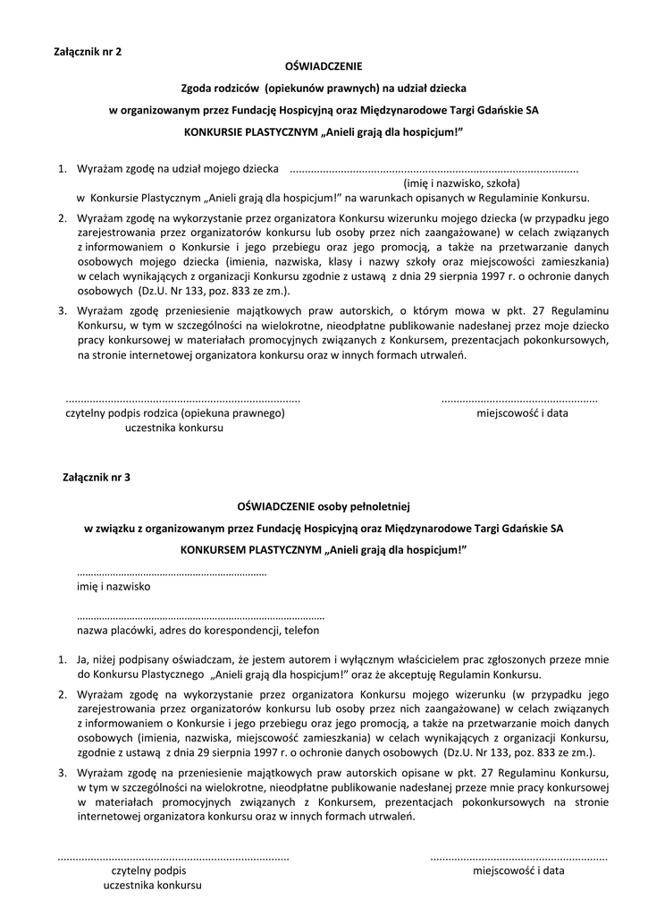 Załącznik nr 2 OŚWIADCZENIE Zgoda rodziców (opiekunów prawnych) na udział dziecka w organizowanym przez Fundację Hospicyjną oraz Międzynarodowe Targi Gdańskie SA KONKURSIE PLASTYCZNYM „Anieli grają dla hospicjum!” 1. Wyrażam zgodę na udział mojego dziecka ................................................................................................ (imię i nazwisko, szkoła) w Konkursie Plastycznym „Anieli grają dla hospicjum!” na warunkach opisanych w Regulaminie Konkursu. 2. Wyrażam zgodę na wykorzystanie przez organizatora Konkursu wizerunku mojego dziecka (w przypadku jego zarejestrowania przez organizatorów konkursu lub osoby przez nich zaangażowane) w celach związanych z informowaniem o Konkursie i jego przebiegu oraz jego promocją, a także na przetwarzanie danych osobowych mojego dziecka (imienia, nazwiska, klasy i nazwy szkoły oraz miejscowości zamieszkania) w celach wynikających z organizacji Konkursu zgodnie z ustawą z dnia 29 sierpnia 1997 r. o ochronie danych osobowych (Dz.U. Nr 133, poz. 833 ze zm.). 3. Wyrażam zgodę przeniesienie majątkowych praw autorskich, o którym mowa w pkt. 27 Regulaminu Konkursu, w tym w szczególności na wielokrotne, nieodpłatne publikowanie nadesłanej przez moje dziecko pracy konkursowej w materiałach promocyjnych związanych z Konkursem, prezentacjach pokonkursowych, na stronie internetowej organizatora konkursu oraz w innych formach utrwaleń. .............................................................................. czytelny podpis rodzica (opiekuna prawnego) uczestnika konkursu .................................................... miejscowość i data Załącznik nr 3 OŚWIADCZENIE osoby pełnoletniej w związku z organizowanym przez Fundację Hospicyjną oraz Międzynarodowe Targi Gdańskie SA KONKURSEM PLASTYCZNYM „Anieli grają dla hospicjum!” …………………………………………………………… imię i nazwisko ……………………………………………………………………………… nazwa placówki, adres do korespondencji, telefon 1. Ja, niżej podpisany oświadczam, że jestem autorem i wyłącznym właścicielem prac zgłoszonych przeze mnie do Konkursu Plastycznego „Anieli grają dla hospicjum!” oraz że akceptuję Regulamin Konkursu. 2. Wyrażam zgodę na wykorzystanie przez organizatora Konkursu mojego wizerunku (w przypadku jego zarejestrowania przez organizatorów konkursu lub osoby przez nich zaangażowane) w celach związanych z informowaniem o Konkursie i jego przebiegu oraz jego promocją, a także na przetwarzanie moich danych osobowych (imienia, nazwiska, miejscowość zamieszkania) w celach wynikających z organizacji Konkursu, zgodnie z ustawą z dnia 29 sierpnia 1997 r. o ochronie danych osobowych (Dz.U. Nr 133, poz. 833 ze zm.). 3. Wyrażam zgodę na przeniesienie majątkowych praw autorskich opisane w pkt. 27 Regulaminu Konkursu, w tym w szczególności na wielokrotne, nieodpłatne publikowanie nadesłanej przeze mnie pracy konkursowej w materiałach promocyjnych związanych z Konkursem, prezentacjach pokonkursowych na stronie internetowej organizatora konkursu oraz w innych formach utrwaleń. ............................................................................. czytelny podpis uczestnika konkursu ........................................................... miejscowość i data