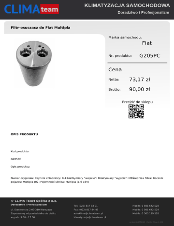 Filtr-osuszacz do Fiat Multipla Marka samochodu: Fiat Nr. produktu: G205PC Cena Netto: 73,17 zł Brutto: 90,00 zł Przejdź do sklepu OPIS PRODUKTU Kod produktu: G205PC Opis produktu: Numer oryginału: Czynnik chłodniczy: R-134aWymiary "wejscie": M6Wymiary "wyjście": M6Średnica filtra: Rocznik pojazdu: Multipla (02-)Pojemność silnika: Multipla (1.6 16V) © CLIMA TEAM Spółka z o.o. Doradztwo i Profesjonalizm Tel: (022) 817 83 01 Mobile: 0 501 642 528 ul. Staniewicka 2 03-310 Warszawa Fax: (022) 817 84 49 Mobile: 0 501 642 529 Zapraszamy od poniedziałku do piątku [email protected] Mobile: 0 500 119 528 w godz. 9:00 - 17:00 [email protected] projekt GRAFCOM | Netler Shop 1.020