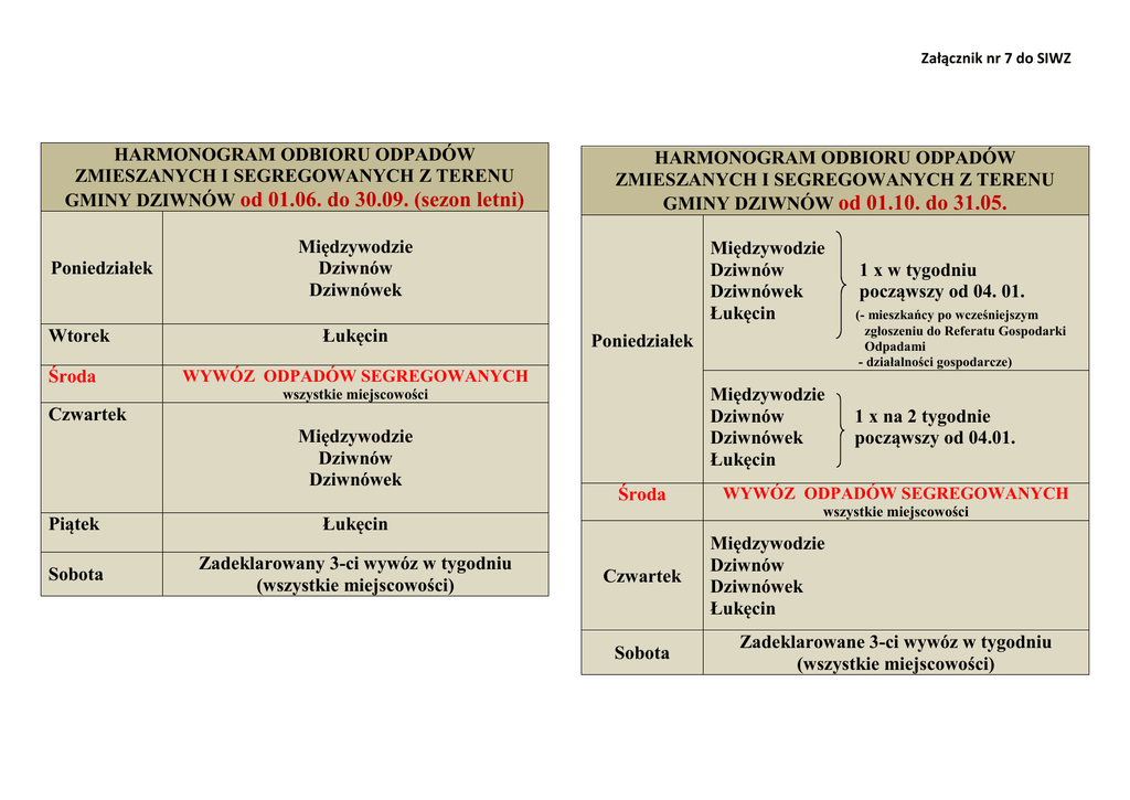 Załącznik nr 7 do SIWZ HARMONOGRAM ODBIORU ODPADÓW ZMIESZANYCH I SEGREGOWANYCH Z TERENU GMINY DZIWNÓW od 01.06. do 30.09. (sezon letni) Poniedziałek Wtorek Środa HARMONOGRAM ODBIORU ODPADÓW ZMIESZANYCH I SEGREGOWANYCH Z TERENU GMINY DZIWNÓW od 01.10. do 31.05. Międzywodzie Dziwnów Dziwnówek Łukęcin Międzywodzie Dziwnów Dziwnówek Łukęcin Poniedziałek WYWÓZ ODPADÓW SEGREGOWANYCH Międzywodzie Dziwnów Dziwnówek Łukęcin wszystkie miejscowości Czwartek Międzywodzie Dziwnów Dziwnówek Piątek Łukęcin Sobota Zadeklarowany 3-ci wywóz w tygodniu (wszystkie miejscowości) Środa Czwartek Sobota 1 x w tygodniu począwszy od 04. 01. (- mieszkańcy po wcześniejszym zgłoszeniu do Referatu Gospodarki Odpadami - działalności gospodarcze) 1 x na 2 tygodnie począwszy od 04.01. WYWÓZ ODPADÓW SEGREGOWANYCH wszystkie miejscowości Międzywodzie Dziwnów Dziwnówek Łukęcin Zadeklarowane 3-ci wywóz w tygodniu (wszystkie miejscowości)