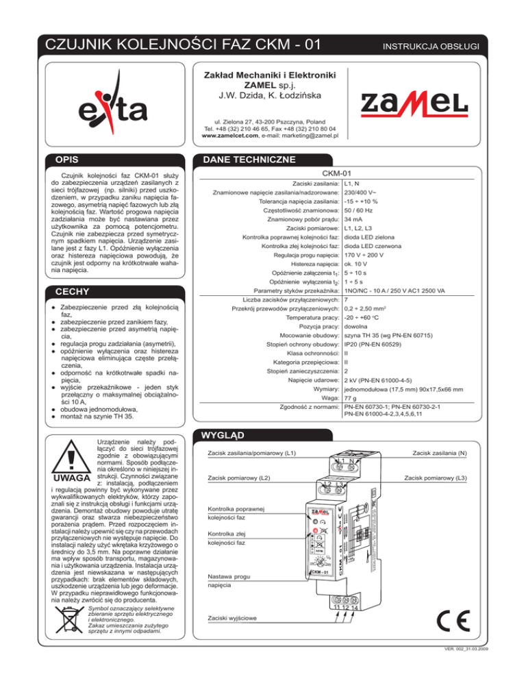 CZUJNIK KOLEJNOŚCI FAZ CKM - 01 INSTRUKCJA OBSŁUGI Zakład Mechaniki i Elektroniki ZAMEL sp.j. J.W. Dzida, K. Łodzińska ul. Zielona 27, 43-200 Pszczyna, Poland Tel. +48 (32) 210 46 65, Fax +48 (32) 210 80 04 www.zamelcet.com, e-mail: [email protected] OPIS DANE Techniczne Czujnik kolejności faz CKM‑01 służy do zabezpieczenia urządzeń zasilanych z sieci trójfazowej (np. silniki) przed uszkodzeniem, w przypadku zaniku napięcia fazowego, asymetrią napięć fazowych lub złą kolejnością faz. Wartość progowa napięcia zadziałania może być nastawiana przez użytkownika za pomocą potencjometru. Czujnik nie zabezpiecza przed symetrycznym spadkiem napięcia. Urządzenie zasilane jest z fazy L1. Opóźnienie wyłączenia oraz histereza napięciowa powodują, że czujnik jest odporny na krótkotrwałe wahania napięcia. CKM-01 Zaciski zasilania: L1, N Znamionowe napięcie zasilania/nadzorowane: 230/400 V~ Tolerancja napięcia zasilania: -15 ÷ +10 % Częstotliwość znamionowa: 50 / 60 Hz Znamionowy pobór prądu: 34 mA Zaciski pomiarowe: L1, L2, L3 Kontrolka poprawnej kolejności faz: dioda LED zielona Kontrolka złej kolejności faz: dioda LED czerwona Regulacja progu napięcia: 170 V ÷ 200 V Histereza napięcia: ok. 10 V Opóźnienie załączenia t1: 5 ÷ 10 s Opóźnienie wyłączenia t2: 1 ÷ 5 s cechy Parametry styków przekaźnika: 1NO/NC - 10 A / 250 V AC1 2500 VA Liczba zacisków przyłączeniowych: 7 ● Zabezpieczenie przed złą kolejnością faz, ● zabezpieczenie przed zanikiem fazy, ● zabezpieczenie przed asymetrią napięcia, ● regulacja progu zadziałania (asymetrii), ● opóźnienie wyłączenia oraz histereza napięciowa eliminująca częste przełączenia, ● odporność na krótkotrwałe spadki napięcia, ● wyjście przekaźnikowe ‑ jeden styk przełączny o maksymalnej obciążalności 10 A, ● obudowa jednomodułowa, ● montaż na szynie TH 35. Urządzenie należy podłączyć do sieci trójfazowej zgodnie z obowiązującymi normami. Sposób podłączenia określono w niniejszej inCzynności związane uwaga strukcji. z: instalacją, podłączeniem i regulacją powinny być wykonywane przez wykwalifikowanych elektryków, którzy zapoznali się z instrukcją obsługi i funkcjami urządzenia. Demontaż obudowy powoduje utratę gwarancji oraz stwarza niebezpieczeństwo porażenia prądem. Przed rozpoczęciem instalacji należy upewnić się czy na przewodach przyłączeniowych nie występuje napięcie. Do instalacji należy użyć wkrętaka krzyżowego o średnicy do 3,5 mm. Na poprawne działanie ma wpływ sposób transportu, magazynowania i użytkowania urządzenia. Instalacja urządzenia jest niewskazana w następujących przypadkach: brak elementów składowych, uszkodzenie urządzenia lub jego deformacje. W przypadku nieprawidłowego funkcjonowania należy zwrócić się do producenta. Symbol oznaczający selektywne zbieranie sprzętu elektrycznego i elektronicznego. Zakaz umieszczania zużytego sprzętu z innymi odpadami. Przekrój przewodów przyłączeniowych: 0,2 ÷ 2,50 mm2 Temperatura pracy: -20 ÷ +60 oC Pozycja pracy: dowolna Mocowanie obudowy: szyna TH 35 (wg PN-EN 60715) Stopień ochrony obudowy: IP20 (PN-EN 60529) Klasa ochronności: II Kategoria przepięciowa: II Stopień zanieczyszczenia: 2 Napięcie udarowe: 2 kV (PN-EN 61000-4-5) Wymiary: jednomodułowa (17,5 mm) 90x17,5x66 mm Waga: 77 g Zgodność z normami: PN-EN 60730-1; PN-EN 60730-2-1 PN-EN 61000-4-2,3,4,5,6,11 wygląd Zacisk zasilania/pomiarowy (L1) Zacisk pomiarowy (L2) Zacisk zasilania (N) Zacisk pomiarowy (L3) Kontrolka poprawnej kolejności faz Kontrolka złej kolejności faz Nastawa progu napięcia Zaciski wyjściowe VER. 002_31.03.2009 MOntaż, działanie 1. Rozłączyć obwód zasilania bezpiecznikiem, wyłącznikiem nadmiarowoprądowym lub rozłącznikiem izolacyjnym przyłączonymi do odpowiedniego obwodu. 2.Sprawdzić odpowiednim przyrządem stan beznapięciowy na przewodach zasilających. 3. Zamontować urządzenie CKM‑01 w rozdzielni na szynie TH 35. 4. Podłączyć przewody pod zaciski zgodnie ze schematem podłączenia. 5. Załączyć obwód zasilania. 6. Nastawić żądany próg napięcia powodujący zadziałanie czujnika kolejności faz. Czujnik po załączeniu zasilania (zasilanie z fazy L1) kontroluje poprawną kolejność faz. W przypadku wykrycia błędnej kolejności faz, zapala się czerwona dioda LED oznaczona jako „ ” (wyjścia 11‑12 zwarte, silnik wyłączony, alarm włączony). W przypadku poprawnej kolejności faz zostaje zapalona zielona dioda LED „ ” (wyjścia 11‑14 zwarte, silnik włączony) – czujnik kontroluje wartości napięć poszczególnych faz. Gdy napięcie na każdej z faz ma poprawną wartość przekaźnik czujnika pozostaje załączony, a sterowane obciążenie (np. silnik) pracuje. W przypadku braku którejkolwiek z faz lub spadku napięcia na jednej z nich, poniżej nastawionego progu (asymetria napięcia) nastąpi wyłączenie przekaźnika. Wyłączenie nastąpi z pewnym opóźnieniem czasowym (t2 od 1 do 5 s). Urządzenie odporne jest na krótkotrwałe spadki napięcia. Ponowne załączenie silnika (wyjścia 11-14 zwarte) nastąpi w momencie powrotu napięcia do wartości ok. 10 V większej od nastawionego progu napięcia (histereza napięciowa) oraz po upływie czasu t1 od 5 do 10 s. Rodzina produktu Podłączenie Uwaga! Układ przekaźnika zasilany jest z fazy L1. Czas opóźnienia wyłączenia przekaźnika zależy od mocy odbiornika podłączonego do sieci trójfazowej. Brak dwóch faz lub zła ich kolejność powoduje natychmiastowe zadziałanie czujnika. Schemat wewnętrzny Przebiegi czasowe Sygnalizacja Sygnalizacja О О Asymetria napięciowa ☼ О Poprawna kolejność faz О ☼ zła kolejność faz zastosowanie Czujnik kolejności faz CKM‑01 należy do rodziny czujników CKx. Wymiary obudowy Czujnik kolejności faz zabezpiecza silnik przed pracą przy awarii sieci zasilającej. Czujnik umożliwi 