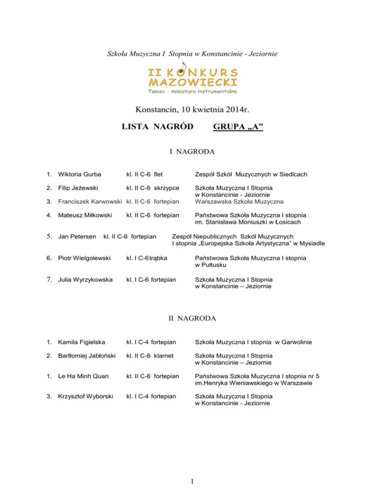 Szkoła Muzyczna I Stopnia w Konstancinie - Jeziornie Konstancin, 10 kwietnia 2014r. LISTA NAGRÓD GRUPA „A” I NAGRODA 1. Wiktoria Gurba kl. II C-6 flet Zespół Szkół Muzycznych w Siedlcach 2. Filip Jeżewski kl. II C-6 skrzypce Szkoła Muzyczna I Stopnia w Konstancinie - Jeziornie Warszawska Szkoła Muzyczna 3. Franciszek Karwowski kl. II C-6 fortepian 4. Mateusz Miłkowski Państwowa Szkoła Muzyczna I stopnia im. Stanisława Moniuszki w Łosicach kl. II C-6 fortepian 5. Jan Petersen kl. II C-6 fortepian Zespół Niepublicznych Szkół Muzycznych I stopnia „Europejska Szkoła Artystyczna” w Mysiadle 6. Piotr Wielgolewski kl. I C-6 trąbka Państwowa Szkoła Muzyczna I stopnia w Pułtusku 7. Julia Wyrzykowska kl. I C-6 fortepian Szkoła Muzyczna I Stopnia w Konstancinie – Jeziornie II NAGRODA 1. Kamila Figielska kl. I C-4 fortepian Szkoła Muzyczna I stopnia w Garwolinie 2. Bartłomiej Jabłoński kl. II C-6 klarnet Szkoła Muzyczna I Stopnia w Konstancinie – Jeziornie 1. Le Ha Minh Quan kl. II C-6 fortepian Państwowa Szkoła Muzyczna I stopnia nr 5 im.Henryka Wieniawskiego w Warszawie 3. Krzysztof Wyborski kl. I C-4 fortepian Szkoła Muzyczna I Stopnia w Konstancinie - Jeziornie 1 Szkoła Muzyczna I Stopnia w Konstancinie - Jeziornie Konstancin, 10 kwietnia 2014r. LISTA NAGRÓD GRUPA „A” III NAGRODA 1. Nela Borsik kl. II C-6 flet Zespół Państwowych Szkół Muzycznych nr 1 w Warszawie – POSM I stopnia im. E.Młynarskiego 2. Roksana Cibor kl. II C-6 skrzypce Szkoła Muzyczna I stopnia w Kozienicach 3. Julia Hawryluk kl. II C-6 flet Zespół Szkół Muzycznych w Siedlcach 4. Hanna Horyd kl. II C-6 fortepian Państwowa Szkoła Muzyczna I stopnia nr 5 im.Henryka Wieniawskiego w Warszawie 5. Patrycja Jastrzębska kl. II C-6 skrzypce Zespół Szkół Muzycznych w Siedlcach 6. Stanisław Kantorowicz kl. II C-6 wiolonczela Prywatna Szkoła Muzyczna I stopnia Bartłomieja Budzyńskiego w Józefowie 7. Dominika Kościów Prywatna Szkoła Muzyczna I i II stopnia „Missio Musica” w Warszawie kl. II C-6 flet 8. Antonina Kozakoszczak Szkoła Muzyczna I Stopnia w Konstancinie – Jeziornie kl. II C-6 flet 9. Barbara Kulikowska kl. II C-6 fortepian Niepubliczna Szkoła Muzyczna I stopnia E P.Gubała w Legionowie 10. Kacper Pudło kl. I C-4 fortepian Szkoła Muzyczna I Stopnia w Konstancinie - Jeziornie 11. Maria Rucińska kl. I C-6 fortepian Zespół Szkół Muzycznych w Siedlcach WYRÓŻNIENIE 1. Maksymilian Królasik Prywatna Szkoła Muzyczna I stopnia Bartłomieja Budzyńskiego w Józefowie kl. I C-6 skrzypce 2