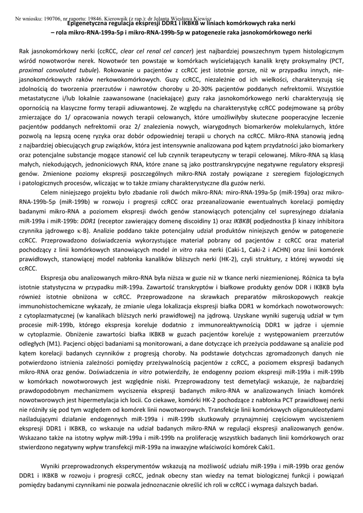 Nr wniosku: 190706, nr raportu: 19846. Kierownik (z rap.): dr Jolanta Wiesława Kiewisz Epigenetyczna regulacja ekspresji DDR1 i IKBKB w liniach komórkowych raka nerki – rola mikro-RNA-199a-5p i mikro-RNA-199b-5p w patogenezie raka jasnokomórkowego nerki Rak jasnokomórkowy nerki (ccRCC, clear cel renal cel cancer) jest najbardziej powszechnym typem histologicznym wśród nowotworów nerek. Nowotwór ten powstaje w komórkach wyściełających kanalik kręty proksymalny (PCT, proximal convoluted tubule). Rokowanie u pacjentów z ccRCC jest istotnie gorsze, niż w przypadku innych, niejasnokomórkowych raków nerkowokomórkowych. Guzy ccRCC, niezależnie od ich wielkości, charakteryzują się zdolnością do tworzenia przerzutów i nawrotów choroby u 20-30% pacjentów poddanych nefrektomii. Wszystkie metastatyczne i/lub lokalnie zaawansowane (naciekające) guzy raka jasnokomórkowego nerki charakteryzują się opornością na klasyczne formy terapii adiuwantowej. Ze względu na charakterystykę ccRCC podejmowane są próby zmierzające do 1/ opracowania nowych terapii celowanych, które umożliwiłyby skuteczne pooperacyjne leczenie pacjentów poddanych nefrektomii oraz 2/ znalezienia nowych, wiarygodnych biomarkerów molekularnych, które pozwolą na lepszą ocenę ryzyka oraz dobór odpowiedniej terapii u chorych na ccRCC. Mikro-RNA stanowią jedną z najbardziej obiecujących grup związków, która jest intensywnie analizowana pod kątem przydatności jako biomarkery oraz potencjalne substancje mogące stanowić cel lub czynnik terapeutyczny w terapii celowanej. Mikro-RNA są klasą małych, niekodujących, jednoniciowych RNA, które znane są jako posttranskrypcyjne negatywne regulatory ekspresji genów. Zmienione poziomy ekspresji poszczególnych mikro-RNA zostały powiązane z szeregiem fizjologicznych i patologicznych procesów, wliczając w to także zmiany charakterystyczne dla guzów nerki. Celem niniejszego projektu było zbadanie roli dwóch mikro-RNA: miro-RNA-199a-5p (miR-199a) oraz mikroRNA-199b-5p (miR-199b) w rozwoju i progresji ccRCC oraz przeanalizowanie ewentualnych korelacji pomiędzy badanymi mikro-RNA a poziomem ekspresji dwóch genów stanowiących potencjalny cel supresyjnego działania miR-199a i miR-199b: DDR1 (receptor zawierający domenę discoidiny 1) oraz IKBKB( podjednostka kinazy inhibitora czynnika jądrowego -B). Analizie poddano także potencjalny udział produktów niniejszych genów w patogenezie ccRCC. Przeprowadzono doświadczenia wykorzystujące materiał pobrany od pacjentów z ccRCC oraz materiał pochodzący z linii komórkowych stanowiących model in vitro raka nerki (Caki-1, Caki-2 i ACHN) oraz linii komórek prawidłowych, stanowiącej model nabłonka kanalików bliższych nerki (HK-2), czyli struktury, z której wywodzi się ccRCC. Ekspresja obu analizowanych mikro-RNA była niższa w guzie niż w tkance nerki niezmienionej. Różnica ta była istotnie statystyczna w przypadku miR-199a. Zawartość transkryptów i białkowe produkty genów DDR i IKBKB była również istotnie obniżona w ccRCC. Przeprowadzone na skrawkach preparatów mikroskopowych reakcje immunohistochemiczne wykazały, że zmianie ulega lokalizacja ekspresji białka DDR1 w komórkach nowotworowych: z cytoplazmatycznej (w kanalikach bliższych nerki prawidłowej) na jądrową. Uzyskane wyniki sugerują udział w tym procesie miR-199b, którego ekspresja koreluje dodatnio z immunoreaktywnością DDR1 w jądrze i ujemnie w cytoplazmie. Obniżenie zawartości białka IKBKB w guzach pacjentów koreluje z występowaniem przerzutów odległych (M1). Pacjenci objęci badaniami są monitorowani, a dane dotyczące ich przeżycia poddawane są analizie pod kątem korelacji badanych czynników z progresją choroby. Na podstawie dotychczas zgromadzonych danych nie potwierdzono istnienia zależności pomiędzy przeżywalnością pacjentów z ccRCC, a poziomem ekspresji badanych mikro-RNA oraz genów. Doświadczenia in vitro potwierdziły, że endogenny poziom ekspresji miR-199a i miR-199b w komórkach nowotworowych jest względnie niski. Przeprowadzony test demetylacji wskazuje, że najbardziej prawdopodobnym mechanizmem wyciszenia ekspresji badanych mikro-RNA w analizowanych liniach komórek nowotworowych jest hipermetylacja ich locii. Co ciekawe, komórki HK-2 pochodzące z nabłonka PCT prawidłowej nerki nie różniły się pod tym względem od komórek linii nowotworowych. Transfekcje linii komórkowych oligonukleotydami naśladującymi działanie endogennych miR-199a i miR-199b skutkowały przynajmniej częściowym wyciszeniem ekspresji DDR1 i IKBKB, co wskazuje na udział badanych mikro-RNA w regulacji ekspresji analizowanych genów. Wskazano także na istotny wpływ miR-199a i miR-199b na proliferację wszystkich badanych linii komórkowych oraz stwierdzono negatywny wpływ transfekcji miR-199a na inwazyjne właściwości komórek Caki1. Wyniki przeprowadzonych eksperymentów wskazują na możliwość udziału miR-199a i miR-199b oraz genów DDR1 i IKBKB w rozwoju i progresji ccRCC, jednak obecny stan wiedzy na temat biologicznej funkcji i powiązań pomiędzy badanymi czynnikami nie pozwala jednoznacznie określić ich roli w ccRCC i wymaga dalszych badań.
