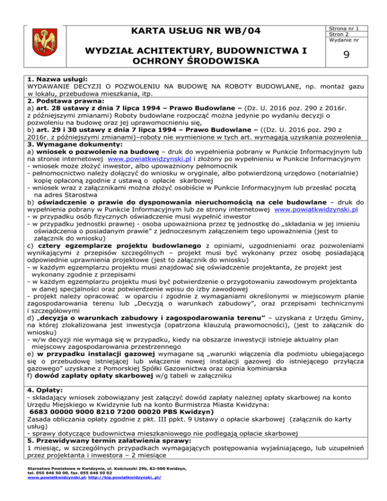 KARTA USŁUG NR WB/04 WYDZIAŁ ACHITEKTURY, BUDOWNICTWA I OCHRONY ŚRODOWISKA Strona nr 1 Stron 2 Wydanie nr 9 1. Nazwa usługi: WYDAWANIE DECYZJI O POZWOLENIU NA BUDOWĘ NA ROBOTY BUDOWLANE, np. montaż gazu w lokalu, przebudowa mieszkania, itp. 2. Podstawa prawna: a) art. 28 ustawy z dnia 7 lipca 1994 – Prawo Budowlane – (Dz. U. 2016 poz. 290 z 2016r. z późniejszymi zmianami) Roboty budowlane rozpocząć można jedynie po wydaniu decyzji o pozwoleniu na budowę oraz jej uprawomocnieniu się, b) art. 29 i 30 ustawy z dnia 7 lipca 1994 – Prawo Budowlane – ((Dz. U. 2016 poz. 290 z 2016r. z późniejszymi zmianami)–roboty nie wymienione w tych art. wymagają uzyskania pozwolenia 3. Wymagane dokumenty: a) wniosek o pozwolenie na budowę – druk do wypełnienia pobrany w Punkcie Informacyjnym lub na stronie internetowej www.powiatkwidzynski.pl i złożony po wypełnieniu w Punkcie Informacyjnym - wniosek może złożyć inwestor, albo upoważniony pełnomocnik - pełnomocnictwo należy dołączyć do wniosku w oryginale, albo potwierdzoną urzędowo (notarialnie) kopię opłaconą zgodnie z ustawą o opłacie skarbowej - wniosek wraz z załącznikami można złożyć osobiście w Punkcie Informacyjnym lub przesłać pocztą na adres Starostwa b) oświadczenie o prawie do dysponowania nieruchomością na cele budowlane – druk do wypełnienia pobrany w Punkcie Informacyjnym lub ze strony internetowej www.powiatkwidzynski.pl - w przypadku osób fizycznych oświadczenie musi wypełnić inwestor - w przypadku jednostki prawnej - osoba upoważniona przez tę jednostkę do „składania w jej imieniu oświadczenia o posiadanym prawie” z jednoczesnym załączeniem tego upoważnienia (jest to załącznik do wniosku) c) cztery egzemplarze projektu budowlanego z opiniami, uzgodnieniami oraz pozwoleniami wynikającymi z przepisów szczególnych – projekt musi być wykonany przez osobę posiadającą odpowiednie uprawnienia projektowe (jest to załącznik do wniosku) - w każdym egzemplarzu projektu musi znajdować się oświadczenie projektanta, że projekt jest wykonany zgodnie z przepisami - w każdym egzemplarzu projektu musi być potwierdzenie o przygotowaniu zawodowym projektanta w danej specjalności oraz potwierdzenie wpisu do izby zawodowej - projekt należy opracować w oparciu i zgodnie z wymaganiami określonymi w miejscowym planie zagospodarowania terenu lub „Decyzją o warunkach zabudowy”, oraz przepisami technicznymi i szczegółowymi d) „decyzja o warunkach zabudowy i zagospodarowania terenu” – uzyskana z Urzędu Gminy, na której zlokalizowana jest inwestycja (opatrzona klauzulą prawomocności), (jest to załącznik do wniosku) - w/w decyzji nie wymaga się w przypadku, kiedy na obszarze inwestycji istnieje aktualny plan miejscowy zagospodarowania przestrzennego e) w przypadku instalacji gazowej wymagane są „warunki włączenia dla podmiotu ubiegającego się o przebudowę istniejącej lub włączenie nowej instalacji gazowej do istniejącego przyłącza gazowego” uzyskane z Pomorskiej Spółki Gazownictwa oraz opinia kominiarska f) dowód zapłaty opłaty skarbowej w/g tabeli w załączniku 4. Opłaty: - składający wniosek zobowiązany jest załączyć dowód zapłaty należnej opłaty skarbowej na konto Urzędu Miejskiego w Kwidzynie lub na konto Burmistrza Miasta Kwidzyna: 6683 00000 9000 8210 7200 00020 PBS Kwidzyn) Zasada obliczania opłaty zgodnie z pkt. III ppkt. 9 Ustawy o opłacie skarbowej (załącznik do karty usług) - sprawy dotyczące budownictwa mieszkaniowego nie podlegają opłacie skarbowej 5. Przewidywany termin załatwienia sprawy: 1 miesiąc, w szczególnych przypadkach wymagających postępowania wyjaśniającego, lub uzupełnień przez projektanta i inwestora – 2 miesiące Starostwo Powiatowe w Kwidzynie, ul. Kościuszki 29b, 82-500 Kwidzyn, tel. 055 646 50 00, fax. 055 646 50 02 www.powiatkwidzynski.pl; http://bip.powiatkwidzynski..pl/ KARTA USŁUG NR WB/04 WYDZIAŁ ACHITEKTURY, BUDOWNICTWA I OCHRONY ŚRODOWISKA Strona nr 2 Stron 2 Wydanie nr 9 6. Odpowiedzialność za załatwienie sprawy: Nazwa Wydziału/Stanowiska: WYDZIAŁ ARCHITEKTURY, BUDOWNICTWA I OCHRONY ŚRODOWISKA Pełnomocnik Starosty – Andrzej Wróblewicz tel. 055 646 50 17 Inspektor - Magdalena Koplin tel. 055 646 50 61 Pracownicy Wydziału – Katarzyna Goworowska-Bień, Joanna Wójtowicz tel. 055 646 50 48 - Ewelina Przysowa, Justyna Porębna tel. 055 646 50 22 Nr pokoju: 109, 110 Nr telefonu: 055-646-50-61, 055-646-50-48, 055-646-50-22, Adres e-mail: [email protected], [email protected] Godziny pracy: pn. - pt. od 7.00 do 16.00 7. Tryb odwoławczy: Odwołanie należy składać poprzez Starostwo Powiatowe do Wojewody Pomorskiego ul. Okopowa 21/27 80-810 Gdańsk. Odwołanie składa się w terminie 14 dni od terminu doręczenia decyzji 8. Uwagi: - Decyzję można odebrać osobiście w pok. 109, 110 lub zostanie przesłana na adres inwestora. Odbiór osobisty znacznie przyspiesza sprawę. - Decyzja o pozwoleniu na budowę wygasa, jeżeli budowa nie zostanie rozpoczęta przed upływem trzech lat od dnia, w którym decyzja ta stanie się ostateczna lub budowa zostanie przerwana na okres dłuższy niż trzy lata. W takim przypadku należy ponownie wystąpić z kompletem dokumentów j.w. o nowe pozwolenie na budowę. 9. Miejsce na notatki: Starostwo Powiatowe w Kwidzynie, ul. Kościuszki 29b, 82-500 Kwidzyn, tel. 055 646 50 00, fax. 055 646 50 02 www.powiatkwidzynski.pl; http://bip.powiatkwidzynski..pl/ WNIOSEK O POZWOLENIE NA BUDOWĘ LUB ROZBIÓRKĘ (B-1) (podstawa prawna: art. 32 i art. 33 ustawy z dnia 7 lipca 1994 r. – Prawo budowlane) 1. Proszę wpisać nazwę organu właściwego do wydania pozwolenia (organ, do którego kierowany jest wniosek): ..........................................................................................................................................................................................................................