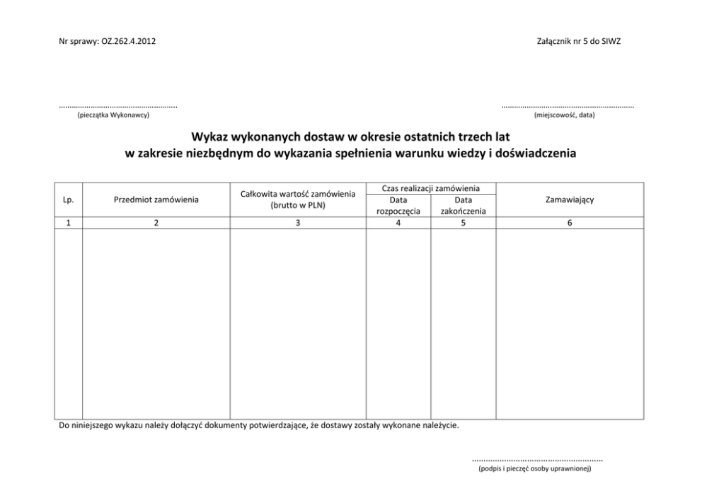 Nr sprawy: OZ.262.4.2012 Załącznik nr 5 do SIWZ ……………………………………………….. ……………………………………………………… (pieczątka Wykonawcy) (miejscowość, data) Wykaz wykonanych dostaw w okresie ostatnich trzech lat w zakresie niezbędnym do wykazania spełnienia warunku wiedzy i doświadczenia Lp. Przedmiot zamówienia Całkowita wartość zamówienia (brutto w PLN) 1 2 3 Czas realizacji zamówienia Data Data rozpoczęcia zakończenia 4 5 Zamawiający 6 Do niniejszego wykazu należy dołączyć dokumenty potwierdzające, że dostawy zostały wykonane należycie. ………………………………………………… (podpis i pieczęć osoby uprawnionej)