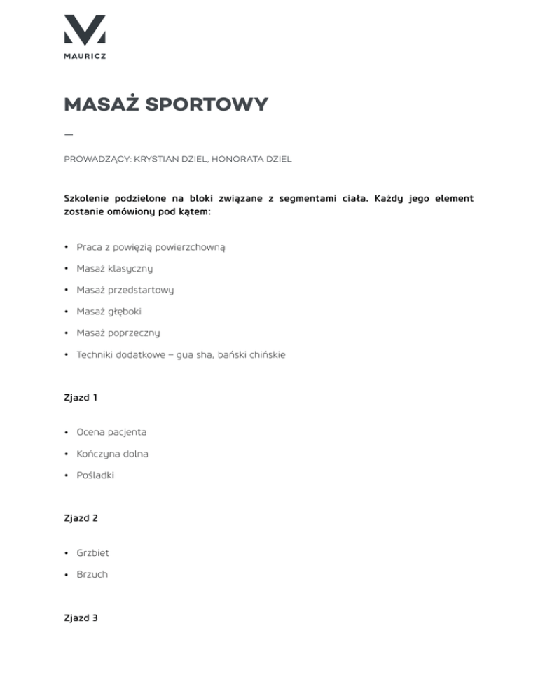 MASAŻ SPORTOWY _ PROWADZĄCY: KRYSTIAN DZIEL, HONORATA DZIEL Szkolenie podzielone na bloki związane z segmentami ciała. Każdy jego element zostanie omówiony pod kątem: • Praca z powięzią powierzchowną • Masaż klasyczny • Masaż przedstartowy • Masaż głęboki • Masaż poprzeczny • Techniki dodatkowe – gua sha, bański chińskie Zjazd 1 • Ocena pacjenta • Kończyna dolna • Pośladki Zjazd 2 • Grzbiet • Brzuch Zjazd 3 • Kończyna górna • Głowa • Planowanie terapii krótko i długoterminowej • Analiza przypadków klinicznych Elementem dodatkowym szkolenia będzie zapoznanie kursantów z wybranymi punktami na ciele pacjenta, które są w stanie poprzez chwilowy ucisk rozluźnić całą stopę, grzbiet, okolice łokci czy kolan.