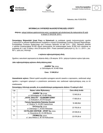 Katowice, dnia 10.09.2015r. INFORMACJA O WYBORZE NAJKORZYSTNIEJSZEJ OFERTY dotyczy: usługa hotelowo-gastronomiczna wraz z wynajęciem sali szkoleniowej dla maksymalnie 40 osób w dniach 21.09-23.09. 2015 r. Zamawiający Wojewódzki Urząd Pracy w Katowicach na podstawie zasady konkurencyjności zgodnie z wytycznymi w zakresie kwalifikowalności wydatków w ramach Europejskiego Funduszu Rozwoju Regionalnego, Europejskiego Funduszu Społecznego oraz Funduszu Spójności na lata 2014 – 2020. Zapytanie ofertowe o wartości przekraczającej 50 000 złotych jednocześnie nie przekraczające kwoty 30 000 euro określonej na podstawie art. 4 pkt. 8 ustawy z dnia 29 stycznia 2004 r. Prawo zamówień publicznych (t.j. Dz. U. z 2013 r., poz. 907 z późn.zm), informuje: o wyborze najkorzystniejszej oferty Zgodnie z warunkami zaproszenia do złożenia oferty z 28 sierpnia 2015 r. jedynym kryterium wyboru była cena. Jako najkorzystniejszą wybrano ofertę złożoną przez: „GAWRA” Sp. z o.o. ul. Górnośląska 44, 43-460 Wisła Cena: 13 940,00 zł Uzasadnienie wyboru: Oferent spełnił wszystkie wymagane warunki zawarte w zaproszeniu, zaoferował usługi zgodnie z wymogami opisanymi w przedmiocie zamówienia oraz zaoferował najkorzystniejszą cenę za ich zrealizowanie. Zamawiający informuje ponadto, że w przedmiotowym postępowaniu złożono 12 ważnych ofert: L.p. Nazwa i adres Wykonawcy 1. „GAWRA” Sp. z o.o. ul. Górnośląska 44, 43-460 Wisła „HOTEL SKALITE” – SŁAWOMIR GÓRNY ul. Krokusów 4, 43-370 Szczyrk Fabryka Specjalistów Radosław Szostek ul. Okrężna 14, 42-280 Częstochowa CN Group Sp. z o.o. ul. Dobrowoja 11, 04-003 Warszawa CS POLAND CENTRUM – SPORT Sp. z o.o. ul. Wyzwolenia 40, 43-438 Brenna FROMAG Sp. z o.o. ul. Jana Wiktora 2, 36-100 Kolbuszowa 2. 3. 4. 5. 6. Cena oferty brutto 13 940,00 zł 17 800,00 zł 16 466,80zł 23 700,00 zł 20 538,00 zł 22 079,28 zł 7. 8. 9. 10. 11. 12. UpHotel s.c. ul. Długa 13 lok. 1, 58-500 Jelenia Góra ARDATEL Sp. z o.o. ul. Jagiellońska 91A, 10-356 Olsztyn BIURO REZERWACJI KARPACZ Agnieszka Mieszkalska ul. Adama Mickiewicza 7 lok. 7, 58-540 Karpacz Biuro rezerwacji „AGATOUR” Agnieszka Bartczak ul. Szymanowskiego 7 lok. 119, 58-506 Jelenia Góra Sanetra Ewa Biuro Turystyczne Ewa Ewa Sanetra Rynek 22, 34-300 Żywiec Pixie Events Małgorzata Wójcicka ul. Wojciecha Korfantego 11a lok.16, 05-850 Ożarów Mazowiecki 16 600,00 zł 17 960,00 zł 23 040,72 zł 22 480,00 zł 16 790,00 zł Niniejsze ogłoszenie o wyborze najkorzystniejszej oferty zostało podane do publicznej wiadomości poprzez jego publikację na tablicy ogłoszeń w siedzibie Urzędu, na stronie internetowej Zamawiającego oraz na stronie Bazy Konkurencyjności. Z up. Dyrektora Wojewódzkiego Urzędu Pracy w Katowicach / - / Jacek Kudzior Wicedyrektor