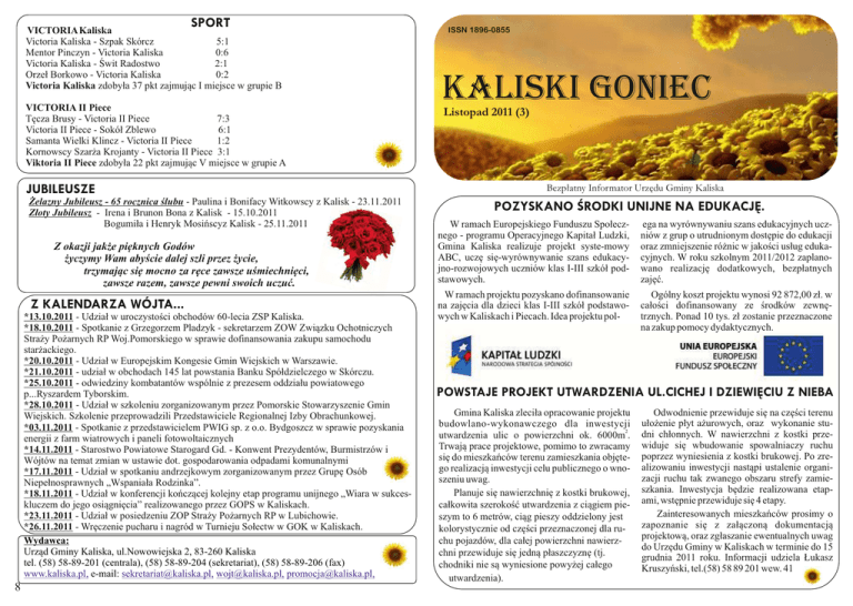 SPORT VICTORIA Kaliska Victoria Kaliska - Szpak Skórcz 5:1 Mentor Pinczyn - Victoria Kaliska 0:6 Victoria Kaliska - Świt Radostwo 2:1 Orzeł Borkowo - Victoria Kaliska 0:2 Victoria Kaliska zdobyła 37 pkt zajmując I miejsce w grupie B VICTORIA II Piece Tęcza Brusy - Victoria II Piece 7:3 Victoria II Piece - Sokół Zblewo 6:1 Samanta Wielki Klincz - Victoria II Piece 1:2 Kornowscy Szarża Krojanty - Victoria II Piece 3:1 Viktoria II Piece zdobyła 22 pkt zajmując V miejsce w grupie A JUBILEUSZE Żelazny Jubileusz - 65 rocznica ślubu - Paulina i Bonifacy Witkowscy z Kalisk - 23.11.2011 Złoty Jubileusz - Irena i Brunon Bona z Kalisk - 15.10.2011 Bogumiła i Henryk Mosińscyz Kalisk - 25.11.2011 Z okazji jakże pięknych Godów życzymy Wam abyście dalej szli przez życie, trzymając się mocno za ręce zawsze uśmiechnięci, zawsze razem, zawsze pewni swoich uczuć. Z KALENDARZA WÓJTA... *13.10.2011 - Udział w uroczystości obchodów 60-lecia ZSP Kaliska. *18.10.2011 - Spotkanie z Grzegorzem Pladzyk - sekretarzem ZOW Związku Ochotniczych Straży Pożarnych RP Woj.Pomorskiego w sprawie dofinansowania zakupu samochodu starżackiego. *20.10.2011 - Udział w Europejskim Kongesie Gmin Wiejskich w Warszawie. *21.10.2011 - udział w obchodach 145 lat powstania Banku Spółdzielczego w Skórczu. *25.10.2011 - odwiedziny kombatantów wspólnie z prezesem oddziału powiatowego p...Ryszardem Tyborskim. *28.10.2011 - Udział w szkoleniu zorganizowanym przez Pomorskie Stowarzyszenie Gmin Wiejskich. Szkolenie przeprowadzili Przedstawiciele Regionalnej Izby Obrachunkowej. *03.11.2011 - Spotkanie z przedstawicielem PWIG sp. z o.o. Bydgoszcz w sprawie pozyskania energii z farm wiatrowych i paneli fotowoltaicznych *14.11.2011 - Starostwo Powiatowe Starogard Gd. - Konwent Prezydentów, Burmistrzów i Wójtów na temat zmian w ustawie dot. gospodarowania odpadami komunalnymi *17.11.2011 - Udział w spotkaniu andrzejkowym zorganizowanym przez Grupę Osób Niepełnosprawnych „Wspaniała Rodzinka”. *18.11.2011 - Udział w konferencji kończącej kolejny etap programu unijnego „Wiara w sukceskluczem do jego osiągnięcia” realizowanego przez GOPS w Kaliskach. *23.11.2011 - Udział w posiedzeniu ZOP Straży Pożarnych RP w Lubichowie. *26.11.2011 - Wręczenie pucharu i nagród w Turnieju Sołectw w GOK w Kaliskach. Wydawca: Urząd Gminy Kaliska, ul.Nowowiejska 2, 83-260 Kaliska tel. (58) 58-89-201 (centrala), (58) 58-89-204 (sekretariat), (58) 58-89-206 (fax) www.kaliska.pl, e-mail: [email protected], [email protected], [email protected], 8 ISSN 1896-0855 KALISKI GONIEC Listopad 2011 (3) Bezpłatny Informator Urzędu Gminy Kaliska POZYSKANO ŚRODKI UNIJNE NA EDUKACJĘ. W ramach Europejskiego Funduszu Społecznego - programu Operacyjnego Kapitał Ludzki, Gmina Kaliska realizuje projekt syste-mowy ABC, uczę się-wyrównywanie szans edukacyjno-rozwojowych uczniów klas I-III szkół podstawowych. ega na wyrównywaniu szans edukacyjnych uczniów z grup o utrudnionym dostępie do edukacji oraz zmniejszenie różnic w jakości usług edukacyjnych. W roku szkolnym 2011/2012 zaplanowano realizację dodatkowych, bezpłatnych zajęć. W ramach projektu pozyskano dofinansowanie na zajęcia dla dzieci klas I-III szkół podstawowych w Kaliskach i Piecach. Idea projektu pol- Ogólny koszt projektu wynosi 92 872,00 zł. w całości dofinansowany ze środków zewnętrznych. Ponad 10 tys. zł zostanie przeznaczone na zakup pomocy dydaktycznych. POWSTAJE PROJEKT UTWARDZENIA UL.CICHEJ I DZIEWIĘCIU Z NIEBA Gmina Kaliska zleciła opracowanie projektu budowlano-wykonawczego dla inwestycji utwardzenia ulic o powierzchni ok. 6000m2. Trwają prace projektowe, pomimo to zwracamy się do mieszkańców terenu zamieszkania objętego realizacją inwestycji celu publicznego o wnoszeniu uwag. Planuje się nawierzchnię z kostki brukowej, całkowita szerokość utwardzenia z ciągiem pieszym to 6 metrów, ciąg pieszy oddzielony jest kolorystycznie od części przeznaczonej dla ruchu pojazdów, dla całej powierzchni nawierzchni przewiduje się jedną płaszczyznę (tj. chodniki nie są wyniesione powyżej całego utwardzenia). Odwodnienie przewiduje się na części terenu ułożenie płyt ażurowych, oraz wykonanie studni chłonnych. W nawierzchni z kostki przewiduje się wbudowanie spowalniaczy ruchu poprzez wyniesienia z kostki brukowej. Po zrealizowaniu inwestycji nastąpi ustalenie organizacji ruchu tak zwanego obszaru strefy zamieszkania. Inwestycja będzie realizowana etapami, wstępnie przewiduje się 4 etapy. Zainteresowanych mieszkańców prosimy o zapoznanie się z załączoną dokumentacją projektową, oraz zgłaszanie ewentualnych uwag do Urzędu Gminy w Kaliskach w terminie do 15 grudnia 2011 roku. Informacji udziela Łukasz Kruszyński, tel.(58) 58 89 201 wew. 41 KONCEPCJA UTWARDZENIA DRÓG - ULICY CICHEJ I DZIEWIĘCIU Z NIEBA VICTORIA KALISKA W poprzednim miesiącu przedstawiliśmy jedną z drużyn gminy Kaliska -VICTORIĘ II PIECE. Teraz czas na Drużynę VICTORIA KALISKA. To właśnie od niej wszystko się zaczęło. Początki tej drużyny sięgają roku 1953. Z inicjatywy p. Jerzego Grzonki i kilku innych osób dn.30.04.1953r zwołano ogólne zebranie, na którym zdecydowano o założeniu Ludowego Zespołu Sportowego. Na samym początku LZS liczył 25 członków. Pierwsza sekcja, która powstała to właśnie sekcja piłki nożnej. Zamiłowanie do piłki sprawiło, że własnymi siłami zbudowano pierwsze boisko w porozumieniu z Gromadzką Radą Narodową. Już po roku drużyna zdobyła mistrzostwa powiatu po decydującym spotkaniu z LZS Semlin z wynikiem 3:1. Wśród pierwszych piłkarzy byli m.in. Ryszard Lenz, Kazimierz Ossowski, Józef, Jerzy i Hubert Skórzewski, Wiktor Machnikowski, Klaus Kreft, Jerzy i Zbigniew Grzonka. Z upływem czasu piłkarzy przybywało. Zespół poza rozgrywkami ligowymi uczestniczył w turniejach i meczach towarzyskich. W 1991r zespół zdobył I miejsce w Halowym Turnieju 