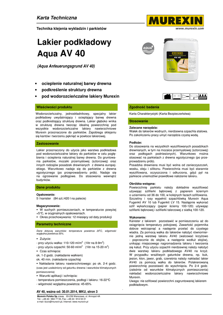 Karta Techniczna Technika klejenia wykładzin i parkietów KLT_AV40 Lakier podkładowy Aqua AV 40 (Aqua Anfeuerungsgrund AV 40) • ocieplenie naturalnej barwy drewna • podkreślenie struktury drewna • pod wodorozcieńczalne lakiery Murexin Właściwości produktu Zgodność badania Wodorozcieńczalny, jednoskładnikowy, specjalny lakier podkładowy uwydatniający i ocieplający barwę drewna oraz podkreślający strukturę drewna. Lakier głęboko wnika w strukturę drewna tworząc idealną powierzchnię pod wszystkie wodorozcieńczalne lakiery nawierzchniowe Murexin przeznaczone do parkietów. Zapobiega sklejaniu się kantów i tworzeniu pęknięć w powłoce lakierowej. Karta Charakterystyki (Karta Bezpieczeństwa) Stosowanie Zalecane narzędzia: Wałek do lakierów wodnych, nierdzewna szpachla stalowa. Po zakończeniu pracy umyć narzędzia czystą wodą. Podłoże: Do stosowania na wszystkich wyszlifowanych posadzkach drewnianych, w tym na mozaice przemysłowej (sztorcowej) oraz podłogach podniesionych). Warunkowo można stosować na parkietach z drewna egzotycznego (po przeprowadzeniu prób). Posadzka drewniana musi być wolna od zanieczyszczeń, wosku, oleju i silikonu. Powierzchnia musi być starannie wyszlifowana, oczyszczona i odkurzona, gdyż pył na parkiecie uniemożliwi prawidłowe nałożenie lakieru. Zastosowanie Lakier przeznaczony do użycia jako warstwa podkładowa pod wodorozcieńczalne lakiery do parkietów w celu pogłębienia i ocieplenia naturalnej barwy drewna. Do gruntowania parkietów, mozaiki przemysłowej (sztorcowej) oraz innych rodzajów posadzek drewnianych z drewna europejskiego. Warunkowo nadaje się do parkietów z drewna egzotycznego (po przeprowadzeniu prób). Nadaje się na ogrzewanie podłogowe. Do stosowania wewnątrz budynków. Obróbka wstępna: Powierzchnię parkietu należy dokładnie wyszlifować używając szlifierki bębnowej z papierem ściernym o uziarnieniu od 36 do 100, w kolejnych fazach szlifowania. Szczeliny i rysy wypełnić szpachlówką Murexin Aqua Fugenkit AV 10 lub Fugenkit LV 15. Następnie wykonać szlif wykańczający (papier ścierny 100-120) używając szlifierki bębnowej i szlifierki talerzowej z siatką 100-120. Dane produktu Opakowanie: 5 l kanister (84 szt./420 l na palecie) Magazynowanie: W suchych pomieszczeniach, w temperaturze powyżej +5°C, w oryginalnych opakowaniach. Okres przechowywania: 12 miesięcy od daty produkcji Wykonanie: Kanister z lakierem pozostawić w pomieszczeniu aż do osiągnięcia temperatury pokojowej. Zawartość pojemnika dobrze wstrząsnąć a następnie przelać do czystego wiadra. Za pomocą wałka do lakierów nałożyć równomiernie jedną warstwę lakieru AV40 (walcować krzyżowo - poprzecznie do słojów, a następnie wzdłuż słojów), unikając miejscowego nagromadzenia lakieru i tworzenia się kałuż. Przy użyciu szpachli nierdzewnej należy nałożyć dwie warstwy lakieru podkładowego AV40 na krzyż. W przypadku wrażliwych gatunków drewna, np. buk, jesion, klon, jawor, grab, czereśnia należy nakładać lakier AV40 za pomocą wałka do lakierów. Polakierowaną powierzchnię pozostawić do wyschnięcia. Po 2-4 godz. (zależnie od warunków klimatycznych pomieszczenia) nakładać wodorozcieńczalne lakiery nawierzchniowe Murexin. Uwaga: nie szlifować powierzchni zagruntowanej lakierem podkładowym. Parametry techniczne Dane dotyczą warunków: temperatura powietrza 20oC, wilgotność względna powietrza 55%. Zużycie: - przy użyciu wałka: 110-120 ml/m2 (1litr na 8-9m2) - przy użyciu szpachli: 50-60 ml/m2 (1litr na 15-20 m2) Czas schnięcia: ok. 1-2 godz. (nakładanie wałkiem) ok. 40 min. (nakładanie szpachlą) Nakładanie lakieru nawierzchniowego: po ok. 2-4 godz. (czas jest uzależniony od gatunku drewna i warunków klimatycznych pomieszczenia) Warunki aplikacji i schnięcia: - temperatura pomieszczenia, podłogi i lakieru: 16-22°C - wilgotność względna powietrza: 45-65% AV 40, ważna od: 30.01.2014, MKU, stron 3 Murexin Polska Sp. z o.o. 03-236 Warszawa, ul. Annopol 4A Tel.: +48 22 / 884 77 55, Fax: +48 22 / 814 53 31 e-mail: [email protected], Internet: www.murexin.pl 1 Karta Techniczna Technika klejenia wykładzin i parkietów KLT_AV40 _______________________________ Dodatkowe informacje: Nie zaleca się wylewania lakieru bezpośrednio na posadzkę drewnianą (należy stosować wiadra do lakierów). W przypadku lakierowania problematycznych gatunków drewna (np. buk, jesion, klon, jawor, grab, czereśnia) zaleca się nakładanie lakieru za pomocą wałka. W przypadku lakierowania nietypowych gatunków drewna, renowacji starych podłóg lub odnawiania warstw lakierniczych zaleca się przeprowadzenie prób na małej powierzchni parkietu. Optymalna temperatura stosowania: +16oC ÷ +22oC. W okresie letnim wyższa temperatura otoczenia znacznie przyspiesza wysychanie lakierów, co może utrudniać ich rozprowadzanie. Szczególnie należy unikać pracy podczas bezpośredniego nasłonecznienia lub zbytniego miejscowego nagrzania parkietu. W takich przypadkach prace najlepiej przeprowadzać wcześnie rano. Obróbka i lakierowanie parkietu o wilgotności niezgodnej z obowiązującymi normami oraz w nieprawidłowych warunkach klimatycznych panujących w pomieszczeniu, może prowadzić do wystąpienia szkód w posadzce drewnianej. Przy silnym spadku wilgotności powietrza istnieje podwyższone ryzyko tworzenia się szczelin w parkiecie. Zjawisko to jest naturalne dla drewna i nie powstaje pod wpływem działania lakieru. Aby zminimalizować ryzyko zbytniego wysuszenia posadzki drewnianej należy utrzymywać wilgotność powietrza na stałym poziomie, stosując odpowiednie urządzenia nawilżające powietrze. Lakierowanej posadzki drewnianej nie przykrywać folią malarską, nie oklejać taśmami malarskimi ani innymi nieprzepuszczającymi powietrza materiałami. Niniejsza karta techniczna bazuje na rozległym doświadczeniu, została stworzona z najlepszej woli, ni