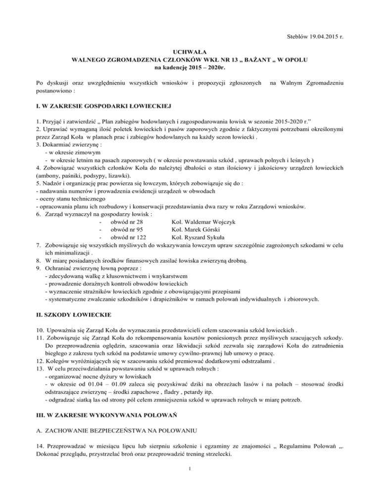 Steblów 19.04.2015 r. UCHWAŁA WALNEGO ZGROMADZENIA CZŁONKÓW WKŁ NR 13 „ BAŻANT „ W OPOLU na kadencję 2015 – 2020r. Po dyskusji oraz uwzględnieniu wszystkich wniosków i propozycji zgłoszonych postanowiono : na Walnym Zgromadzeniu I. W ZAKRESIE GOSPODARKI ŁOWIECKIEJ 1. Przyjąć i zatwierdzić „ Plan zabiegów hodowlanych i zagospodarowania łowisk w sezonie 2015-2020 r.” 2. Uprawiać wymaganą ilość poletek łowieckich i pasów zaporowych zgodnie z faktycznymi potrzebami określonymi przez Zarząd Koła w planach prac i zabiegów hodowlanych na każdy sezon łowiecki . 3. Dokarmiać zwierzynę : - w okresie zimowym - w okresie letnim na pasach zaporowych ( w okresie powstawania szkód , uprawach polnych i leśnych ) 4. Zobowiązać wszystkich członków Koła do należytej dbałości o stan ilościowy i jakościowy urządzeń łowieckich (ambony, paśniki, podsypy, lizawki). 5. Nadzór i organizację prac powierza się łowczym, których zobowiązuje się do : - nadawania numerów i prowadzenia ewidencji urządzeń w obwodach - oceny stanu technicznego - opracowania planu ich rozbudowy i konserwacji przedstawiania dwa razy w roku Zarządowi wniosków. 6. Zarząd wyznaczył na gospodarzy łowisk : - obwód nr 28 Kol. Waldemar Wojczyk - obwód nr 95 Kol. Marek Górski - obwód nr 122 Kol. Ryszard Sykuła 7. Zobowiązuje się wszystkich myśliwych do wskazywania łowczym upraw szczególnie zagrożonych szkodami w celu ich minimalizacji . 8. W miarę posiadanych środków finansowych zasilać łowiska zwierzyną drobną. 9. Ochraniać zwierzynę łowną poprzez : - zdecydowaną walkę z kłusownictwem i wnykarstwem - prowadzenie doraźnych kontroli obwodów łowieckich - wyznaczenie strażników łowieckich zgodnie z obowiązującymi przepisami - systematyczne zwalczanie szkodników i drapieżników w ramach polowań indywidualnych i zbiorowych. II. SZKODY ŁOWIECKIE 10. Upoważnia się Zarząd Koła do wyznaczania przedstawicieli celem szacowania szkód łowieckich . 11. Zobowiązuje się Zarząd Koła do rekompensowania kosztów poniesionych przez myśliwych szacujących szkody. Do przeprowadzenia oględzin, szacowania oraz likwidacji szkód zezwala się zarządowi Koła do zatrudnienia biegłego z zakresu tych szkód na podstawie umowy cywilno-prawnej lub umowy o pracę. 12. Kolegów wyróżniających się w szacowaniu szkód premiować dodatkowymi odstrzałami . 13. W celu przeciwdziałania powstawaniu szkód w uprawach rolnych : - organizować nocne dyżury w łowiskach - w okresie od 01.04 – 01.09 zaleca się pozyskiwać dziki na obrzeżach lasów i na polach – stosować środki odstraszające zwierzynę – środki zapachowe , fladry , petardy itp. - odgradzać siatką las od strony pól celem zmniejszenia szkód w uprawach rolnych w miarę potrzeb. III. W ZAKRESIE WYKONYWANIA POLOWAŃ A. ZACHOWANIE BEZPIECZEŃSTWA NA POLOWANIU 14. Przeprowadzać w miesiącu lipcu lub sierpniu szkolenie i egzaminy ze znajomości „ Regulaminu Polowań „. Dokonać przeglądu, przystrzelać broń oraz przeprowadzić trening strzelecki. 1 15. Uczestnictwo w szkoleniu jest warunkiem uzyskania zezwoleń na odstrzał indywidualny i dopuszczenie do polowań zbiorowych . 16. Każdy wyjazd na polowanie indywidualne obowiązkowo zgłaszać w następujących punktach: - Obwód 28 - Leśnictwo Ligota Trawska ul. Dworska 2A ( u kolegi Arkadiusza Adamskiego ) - Obwód 95 - Leśnictwo Rogów Op. Gwoździce - Obwód 122 - u kolegi Sommera Waldemara Nadziejów 17A . 17. Zobowiązuje się myśliwych do precyzyjnego określania sposobu i miejsca wykonywania polowania oraz bezwzględnego wykonywania polowania zgodnie z wpisem w książce zgłoszeń. 18 . Trofea zwierzyny płowej wycenione przez komisję na dwa czerwone punkty przechodzą na własność Koła . Zobowiązuje się Zarząd do corocznej informacji o zabranych porożach na rzecz Koła oraz o sposobie ich zagospodarowania . B. POLOWANIA ZBIOROWE 19. Uroczyste polowania ( Hubertus, Wigilijne, zakończenie sezonu ) organizować z biesiadą myśliwską. 20. Nagonkę zabezpieczają prowadzący polowanie zbiorowe. 21. Utrzymywać gorące posiłki na polowaniu zbiorowym. 22. Wpływy za tusze zwierzyny grubej pozyskanej na polowaniu zbiorowym przechodzą w całości na rzecz Koła. 23. W dniach , w których organizowane jest polowanie zbiorowe wstrzymuje się wykonywanie polowań indywidualnych na wszystkich obwodach do godziny 17.00- nie dotyczy polowań dewizowych. 24. Zaproszeni goście na polowania indywidualne lub zbiorowe nie otrzymują rekompensaty za strzeloną zwierzynę . 25. Wynagrodzenie dla naganki na polowaniu zbiorowym realizować z kasy Koła. Zapraszanie gości na polowania zbiorowe za zgodą prezesa Koła. Udział w polowaniu zbiorowym zgłaszać do czwartku poprzedzającego polowanie. C. POLOWANIA INDYWIDUALNE 26. Przy przyznawaniu zezwoleń na odstrzał indywidualny ustala się następujące zasady: - podstawą uzyskania zezwolenia na odstrzał indywidualny jest uczestnictwo w szkoleniu z zakresu bezpieczeństwa na polowaniu , szkoleniu strzeleckim oraz bieżące wywiązywanie się z prac na rzecz Koła - wydania odstrzałów na samce zwierzyny płowej w zależności od przepracowania na rzecz Koła 15 rbg do rogaczy i 30 rbg do byków , razem 65 rbg do listopada - myśliwym , którzy przepracowali w stosunku do wymaganej podwójną ilość rbg przydzielić dodatkowe odstrzały na samce zwierzyny płowej lub na dziki odyńce - w przydzielaniu odstrzałów na samce zwierzyny płowej winien uczestniczyć członek Komisji Rewizyjnej. 27. Odstrzały rogaczy realizować w dwóch etapach : I etap 11.05 –15.07 II etap 15.07 – do końca 09 28. Odstrzał guzikarza premiować dodatkowym zezwoleniem. 29. Rekompensatę za zwierzynę pozyskaną na polowaniu indywidualnym ustala się w wysokości 10 % wartości tuszy z wyłączeniem zwierzyny trofealnej ( byk, rogacz, odyniec). 30. Myśliwy ma prawo zabrać każdą upolowaną zwi
