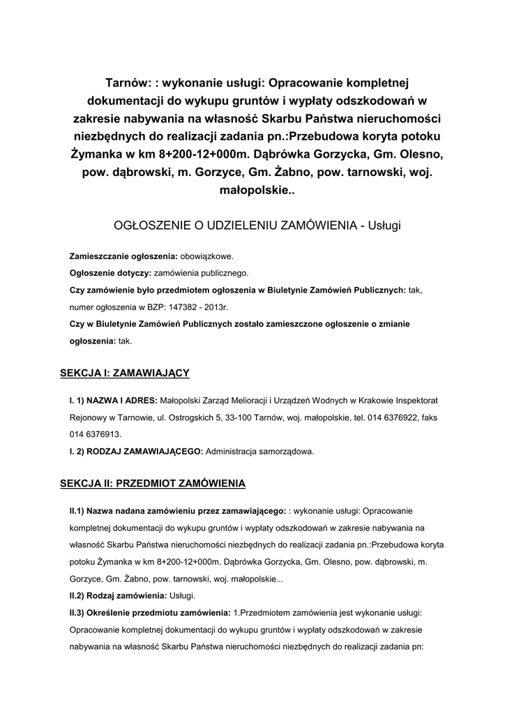 Tarnów: : wykonanie usługi: Opracowanie kompletnej dokumentacji do wykupu gruntów i wypłaty odszkodowań w zakresie nabywania na własność Skarbu Państwa nieruchomości niezbędnych do realizacji zadania pn.:Przebudowa koryta potoku Żymanka w km 8+200-12+000m. Dąbrówka Gorzycka, Gm. Olesno, pow. dąbrowski, m. Gorzyce, Gm. Żabno, pow. tarnowski, woj. małopolskie.. OGŁOSZENIE O UDZIELENIU ZAMÓWIENIA - Usługi Zamieszczanie ogłoszenia: obowiązkowe. Ogłoszenie dotyczy: zamówienia publicznego. Czy zamówienie było przedmiotem ogłoszenia w Biuletynie Zamówień Publicznych: tak, numer ogłoszenia w BZP: 147382 - 2013r. Czy w Biuletynie Zamówień Publicznych zostało zamieszczone ogłoszenie o zmianie ogłoszenia: tak. SEKCJA I: ZAMAWIAJĄCY I. 1) NAZWA I ADRES: Małopolski Zarząd Melioracji i Urządzeń Wodnych w Krakowie Inspektorat Rejonowy w Tarnowie, ul. Ostrogskich 5, 33-100 Tarnów, woj. małopolskie, tel. 014 6376922, faks 014 6376913. I. 2) RODZAJ ZAMAWIAJĄCEGO: Administracja samorządowa. SEKCJA II: PRZEDMIOT ZAMÓWIENIA II.1) Nazwa nadana zamówieniu przez zamawiającego: : wykonanie usługi: Opracowanie kompletnej dokumentacji do wykupu gruntów i wypłaty odszkodowań w zakresie nabywania na własność Skarbu Państwa nieruchomości niezbędnych do realizacji zadania pn.:Przebudowa koryta potoku Żymanka w km 8+200-12+000m. Dąbrówka Gorzycka, Gm. Olesno, pow. dąbrowski, m. Gorzyce, Gm. Żabno, pow. tarnowski, woj. małopolskie... II.2) Rodzaj zamówienia: Usługi. II.3) Określenie przedmiotu zamówienia: 1.Przedmiotem zamówienia jest wykonanie usługi: Opracowanie kompletnej dokumentacji do wykupu gruntów i wypłaty odszkodowań w zakresie nabywania na własność Skarbu Państwa nieruchomości niezbędnych do realizacji zadania pn: Przebudowa koryta potoku Żymanka w km 8+200-12+000m. Dąbrówka Gorzycka, Gm. Olesno, pow. dąbrowski, m. Gorzyce, Gm. Żabno, pow. tarnowski, woj. małopolskie. 2.Szczegółowy zakres zamówienia obejmuje: 2.1 Przygotowanie dokumentacji do wykupu gruntów i wypłaty odszkodowań. Celem opracowania będzie podział działek ewidencyjnych, zajętych w wyniku przebudowy potoku Żymanka. Należy wykonać następujące czynności: 2.1.1 Opracowanie operatu geodezyjnego celem uregulowania strony prawnej gruntów trwale zajmowanych wzdłuż potoku Żymanka w km 8+200-12+000 dla działek niepodzielonych zgodnie z projektem budowlanym. W przypadku dodatkowego zajęcia terenu na działkach, które są już podzielone należy dokonać ustalenia granic zgodnie z zajęciem terenu. Należy wykonać następujące czynności: A)Opracować wstępny projektu podziału działek w oparciu o projekt budowlany. Granice podziału działek należy uzgodnić z Inwestorem. Podział nieruchomości będzie wykonywany w oparciu o ustawę z dnia 21 sierpnia 1997 o Gospodarce Nieruchomościami Dz.U.1997 Nr 115 poz.741 z późn. zmianami art.93 pkt 2a. B)Wykonać podział geodezyjny działek ewidencyjnych zgodnie z pozytywnie zaopiniowanym wstępnym projektem podziału. Dokumentacja powinna zawierać: - mapy jednostkowe z projektem podziału nieruchomości wraz z wykazem zmian gruntowych w 5-ciu egzemplarzach - wypisy z Rejestru Gruntów - protokoły badania ksiąg wieczystych - odpisy z ksiąg wieczystych - wykazy synchronizacyjne dla działek które nie są ujawnione w księgach wieczystych 2 egz. - oryginały aktów własności ziemi lub ich kopie potwierdzone za zgodność z oryginałem przez organ wydający dokument 1 - egz. - inne dokumenty stwierdzające własność takie jak: postanowienia sadu o stwierdzeniu nabycia spadku, akty notarialne i inne 1egz. - kopie protokołów z ustalenia i przyjęcia granic nieruchomości podlegających podziałowi. - przygotowanie wraz ze złożeniem wniosków właścicieli gruntów do wydania decyzji na podział działek 2.1.2 Opracowanie dokumentacji szacunkowej określającej wartość gruntów trwale i czasowo zajmowanych, oraz odszkodowań za szkody poniesione przez właścicieli gruntów podczas realizacji inwestycji na zadaniu: Przebudowa koryta potoku Żymanka w km 8+200-12+000m. Dąbrówka Gorzycka, Gm. Olesno, pow. dąbrowski, m. Gorzyce, Gm. Żabno, pow. tarnowski, woj. Małopolskie Zakres czynności obejmuje: Sporządzenie operatów szacunkowych określających wartość gruntów trwale zajmowanych wraz z odszkodowaniami oraz wartość gruntów czasowo zajętych. Należy wykonać: Operat szacunkowy określający wartość gruntów trwale zajmowanych wraz z odszkodowaniami: Operat szacunkowy określający wartość gruntów czasowo zajętych. Dokumentację szacunkową dla działek, wzdłuż zakresu robót objętego projektem budowlanym, które zostały już podzielone przed rozpoczęciem robót budowlanych w km 8+200-12+000 należy sporządzić do dnia 30.06.2013r. Wykaz działek do sporządzenia operatu szacunkowego należy uzgodnić z Inwestorem. Operaty szacunkowe zostaną sporządzone w oparciu o następujące warunki: a)Operat szacunkowy obejmuje wycenę wszystkich wykupywanych działek zgodnie z ustawą z dnia 21 sierpnia 1997 o Gospodarce Nieruchomościami Dz.U.1997 Nr 115 poz.741 z późn. zmianami oraz przepisami obowiązującymi Rzeczoznawców Majątkowych i wypełnioną Kartą Weryfikacji Operatów Szacunkowych ( załącznik nr 9 do SIWZ) Wypełnioną kartę należy przedłożyć Zamawiającemu wraz z operatem szacunkowym. b)Operat powinien zawierać wycenę na podstawie wartości rynkowej gruntów z podziałem na wartość gruntów trwale zajmowanych oraz wartość odszkodowań za straty poniesione przez właścicieli podczas realizacji inwestycji. c)Operat powinien obejmować wycenę według stanu nieruchomości i poziomu cen na dzień rozpoczęcia robót w zakresie realizacji inwestycji tj. 19.12.2012 r. d)Do operatu szacunkowego należy dołączyć protokoły badania ksiąg wieczystych podpisane przez Wykonawcę. e)W przypadku gdy na wycenianej działce znajdowały się drzewa, lub inne