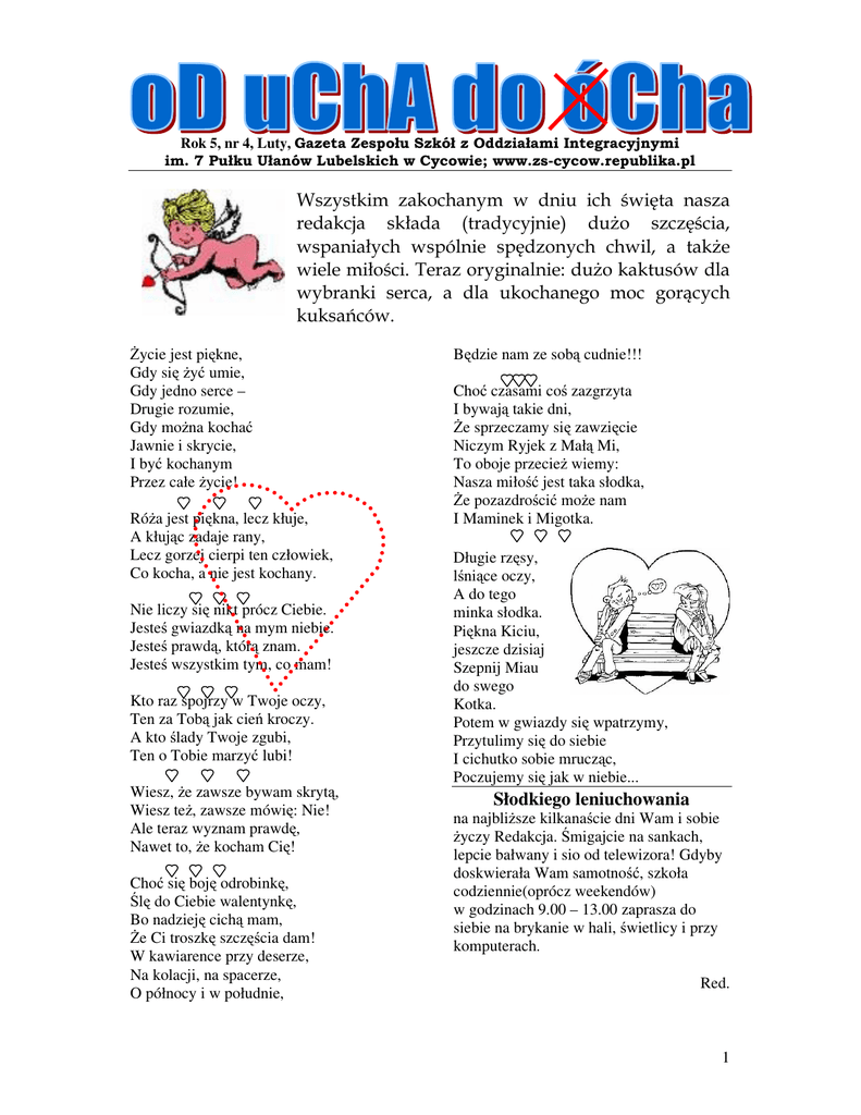Rok 5, nr 4, Luty, ! " # $ % & ! # !" " " ! ! $ % ycie jest pi kne, Gdy si y umie, Gdy jedno serce – Drugie rozumie, Gdy mo na kocha Jawnie i skrycie, I by kochanym Przez całe ycie! Ró a jest pi kna, lecz kłuje, A kłuj c zadaje rany, Lecz gorzej cierpi ten człowiek, Co kocha, a nie jest kochany. Nie liczy si nikt prócz Ciebie. Jeste gwiazdk na mym niebie. Jeste prawd , któr znam. Jeste wszystkim tym, co mam! Kto raz spojrzy w Twoje oczy, Ten za Tob jak cie kroczy. A kto lady Twoje zgubi, Ten o Tobie marzy lubi! Wiesz, e zawsze bywam skryt , Wiesz te , zawsze mówi : Nie! Ale teraz wyznam prawd , Nawet to, e kocham Ci ! Cho si boj odrobink , l do Ciebie walentynk , Bo nadziej cich mam, e Ci troszk szcz cia dam! W kawiarence przy deserze, Na kolacji, na spacerze, O północy i w południe, B dzie nam ze sob cudnie!!! Cho czasami co zazgrzyta I bywaj takie dni, e sprzeczamy si zawzi cie Niczym Ryjek z Mał Mi, To oboje przecie wiemy: Nasza miło jest taka słodka, e pozazdro ci mo e nam I Maminek i Migotka. Długie rz sy, l ni ce oczy, A do tego minka słodka. Pi kna Kiciu, jeszcze dzisiaj Szepnij Miau do swego Kotka. Potem w gwiazdy si wpatrzymy, Przytulimy si do siebie I cichutko sobie mrucz c, Poczujemy si jak w niebie... Słodkiego leniuchowania na najbli sze kilkana cie dni Wam i sobie yczy Redakcja. migajcie na sankach, lepcie bałwany i sio od telewizora! Gdyby doskwierała Wam samotno , szkoła codziennie(oprócz weekendów) w godzinach 9.00 – 13.00 zaprasza do siebie na brykanie w hali, wietlicy i przy komputerach. Red. 1 CO Z TEGO WYNIKNIE? O tajemnicy przyja ni ze szkoł w Łucku i jej konsekwencjach Od tego trzeba zacz : po co, na co i w jakim celu całe to zamieszanie. Nasza szkoła nawi zała znajomo , aby pozna nowych i interesuj cych ludzi, zjednoczy si i w ko cu doprowadzi do wymiany młodzie y mi dzy naszymi szkołami. W listopadzie nasza szkoła nawi zała kontakt ze Specjalistyczn Szkoł nr 5 w Łucku. Dyrekcja, nauczyciele i uczniowie, którzy reprezentowali nasz wspólnot szkoln , byli ju w zaprzyja nionej szkole. Teraz czas na naszych znajomych. W dniach 9 i 10 stycznia bie cego roku mieli my przyjemno go ci w murach naszej szkoły delegacj ze Specjalistycznej Szkoły nr 5 w Łucku. Obie wizyty miały na celu zapoznanie si z histori i tradycjami regionu oraz specyfik szkolnictwa w Polsce i na Ukrainie. Go cie zostali powitani cz ci artystyczn , mi dzy innymi wyst pami grup tanecznych i wystawieniem jasełek. Popołudnie i wieczór upłyn ły na wymianie do wiadcze edukacyjnych i dyskusji o szkolnictwie. Cało oprawiona została poezj rosyjska pt. „Cztery pory roku” . Mił niespodziank dla go ci był prezent, który ufundował dyrektor naszej szkoły pana Zbigniewa Rutkowskiego. Była to pomoce naukowe w j zyku angielskim. Drugiego dnia przedstawiciele naszej szkoły i szkoły z Łucka udali si na wycieczk do Lublina. Go cie mieli okazj obejrzenia najpi kniejszych i najbardziej warto ciowych dla nauki miejsc w stolicy naszego województwa. Spotkanie przyniosło rezultaty. Młodzie naszego zespołu szkół została zaproszona na pobyt w urokliwych zak tkach obwodu woły skiego w miesi cach letnich. 2 Najpi kniejsze chwile z pobytu delegacji zostały uwiecznione na fotografiach i kartach kroniki szkoły. Mili go cie dokonali równie własnor cznego wpisu do naszej kroniki. Oby tak owocnie zacz ta współpraca trwała jak najdłu ej. Wszystkim nam było niezmiernie miło go ci tak zacnych go ci. Dyrekcja, grono pedagogiczne i uczniowie, wszyscy czekamy na kolejna wizyt . Kasia Pułka :-)* CO W IZBIE TRADYCJI PISZCZY? Wreszcie udało si i od 7 grudnia 2006 roku mamy wymarzone siodło. Prezent od wi tego ludzkiego Mikołaja Od momentu powstania w naszej szkole Izby Tradycji trwały intensywne poszukiwania uła skiego siodła, które dopełniłoby zbiory. Stało si to dzi ki yczliwo ci pana Mariana Brody-literata i kolekcjonera z Lublina, który nadziej , wypo yczył nam siodło, jednak wszystko wskazuje na to, e wkrótce po prostu odsprzeda je szkole. Negocjacje w tej sprawie prowadz opiekunowie izby. Szkoła szuka równie sponsorów. (Mo e masz bogatego wujka?) Trzymamy kciuki za pomy lno rozmów i mamy nadziej , e siodło, ten jeden najwa niejszych atrybutów ułana, pozostanie w naszej szkole na zawsze. Kasia Bogudzi ska we współpracy z Pani V. Marciniak Zdrowsi gór Agnieszka Piela z kl. III d GM zaj ła drugie miejsce w konkursie plastycznym pt. „Idea pierwszej pomocy-pomagam i prosz o pomoc” w kategorii gimnazja. Dominika Bartosiak z kl. III a SP zaj ła drugie miejsce w konkursie na scenariusz pt. „Ba o zdrowiu, higienie i pomocy” w kategorii: szkoły podstawowe (kl. I-III). Uczennice otrzymały nagrody rzeczowe. Oba konkursy zorganizował Powiatowy Zespół ds. Szkół Promuj cych Zdrowie w Ł cznej. Zwyci czyniom gratulujemy! Kasia Bogudzi ska Bajka o zdrowiu ył sobie kiedy chłopiec o imieniu Tomek. Chodził do trzeciej klasy. Nie miał kole anek i kolegów, bo był otyły. Wszyscy si z niego miali. Nie radził sobie na lekcjach wychowania fizycznego. Był bardzo samotny. Cały swój wolny czas sp dzał przed komputerem, objadaj c si słodyczami. Pewniej nocy przy nił mu si anioł i diabeł. Obaj kłócili si namawiali do ró nych rzeczy: - Anioł: chłopcze, odrzu słodycze, bo przez nie jeste nieszcz liwy! - Diabeł: nie rezygnuj z chipsów i batonów, przecie to Twoje przysmaki! - Anioł: Tomku, radz Ci, zacznij cz ciej wychodzi z domu i spróbuj uprawia sport, np. jazd na rowerze. - Diabeł: Chłopcze, w kuchni, w szafce le y schowana czekolada z orzechami, we sobie kawałek! - Anioł: Tomku, przesta pi col na niadanie, a zacznij pi mleko i jogurt , a nie po ałujesz! Dr czony przez Diabła i Anioła obudził si . Postanowił posłucha rady Anioła i spróbowa . Zacz ł cz ciej wychodzi na dwór i je dzi na rowerze. Ci ko mu było oprze si słodyczom. Kusiły go na ka dym kroku. Ale nie poddał si . Po dwóch tygodniach z rado ci stw