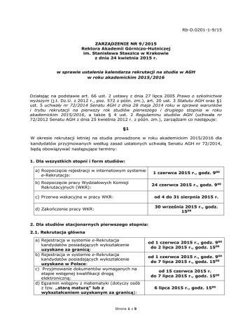 Rb-D.0201-1-9/15 ZARZĄDZENIE NR 9/2015 Rektora Akademii Górniczo-Hutniczej im. Stanisława Staszica w Krakowie z dnia 24 kwietnia 2015 r. w sprawie ustalenia kalendarza rekrutacji na studia w AGH w roku akademickim 2015/2016 Działając na podstawie art. 66 ust. 2 ustawy z dnia 27 lipca 2005 Prawo o szkolnictwie wyższym (j.t. Dz.U. z 2012 r., poz. 572 z późn. zm.), art. 20 ust. 3 Statutu AGH oraz §1 ust. 5 uchwały nr 72/2014 Senatu AGH z dnia 28 maja 2014 roku w sprawie warunków i trybu rekrutacji na pierwszy rok studiów pierwszego i drugiego stopnia w roku akademickim 2015/2016, a także § 4 ust. 2 Regulaminu studiów AGH (uchwała nr 72/2012 Senatu AGH z dnia 25 kwietnia 2012 r. z późn. zm.), zarządzam co następuje: §1 W okresie rekrutacji letniej na studia prowadzone w roku akademickim 2015/2016 dla kandydatów przyjmowanych według zasad ustalonych uchwałą Senatu AGH nr 72/2014, będą obowiązywać następujące terminy: 1. Dla wszystkich stopni i form studiów: a) Rozpoczęcie rejestracji w internetowym systemie e-Rekrutacja: 1 czerwca 2015 r., godz. 900 b) Rozpoczęcie pracy Wydziałowych Komisji Rekrutacyjnych (WKR): 24 czerwca 2015 r., godz. 900 c) Przerwa wakacyjna w pracy WKR: od 4 do 31 sierpnia 2015 r. d) Zakończenie pracy WKR: 30 września 2015 r., godz. 1500 2. Dla studiów stacjonarnych pierwszego stopnia: 2.1. Rekrutacja główna a) Rejestracja w systemie e-Rekrutacja kandydatów posiadających wykształcenie uzyskane za granicą: b) Rejestracja w systemie e-Rekrutacja kandydatów posiadających wykształcenie uzyskane w Polsce: c) Przyjmowanie dokumentów wymaganych na etapie wstępnej kwalifikacji drogą elektroniczną: d) Egzamin wstępny z matematyki (dotyczy osób z tzw. „starą maturą” lub z wykształceniem uzyskanym za granicą): Strona 1 z 5 od 1 czerwca 2015 r., godz. 900 do 2 lipca 2015 r., godz. 1500 od 1 czerwca 2015 r., godz. 900 do 7 lipca 2015 r., godz. 1500 od 15 czerwca 2015 r. do 7 lipca 2015 r., godz. 1500 6 lipca 2015 r., godz. 1500 e) Wstępna kwalifikacja kandydatów: 8 lipca 2015 r., ogłoszenie wyników o godz. 1500 f) Przyjmowanie podań od zakwalifikowanych kandydatów oraz wydawanie decyzji o przyjęciu na studia: od 9 do 20 lipca 2015 r. (w tym sobota 18 lipca) g) Dokonywanie wpisu na studia: od 9 do 20 lipca 2015 r. (w tym sobota 18 lipca) h) Ogłoszenie ewentualnej rekrutacji uzupełniającej I: 20 lipca 2015 r., godz. 1500 2.2. Rekrutacja uzupełniająca I a) Rejestracja kandydatów w systemie e-Rekrutacja: b) Przyjmowanie dokumentów wymaganych na etapie wstępnej kwalifikacji drogą elektroniczną: od 21 lipca 2015 r., godz. 900 do 24 lipca 2015 r., godz. 1500 od 21 do 24 lipca 2015 r., godz. 1500 24 lipca 2015 r., ogłoszenie wyników o godz. 1700 c) Wstępna kwalifikacja kandydatów: d) Przyjmowanie podań od zakwalifikowanych kandydatów oraz wydawanie decyzji o przyjęciu na studia: od 27 do 31 lipca 2015 r. e) Dokonywanie wpisu na studia: od 27 do 31 lipca 2015 r. f) Ogłoszenie ewentualnej rekrutacji uzupełniającej II: 3 sierpnia 2015 r., godz. 1500 2.3. Rekrutacja uzupełniająca II a) Rejestracja kandydatów w systemie e-Rekrutacja: b) Przyjmowanie dokumentów wymaganych na etapie wstępnej kwalifikacji drogą elektroniczną: c) Egzamin wstępny z matematyki (dotyczy osób z tzw. „starą maturą” lub z wykształceniem uzyskanym za granicą): od 4 sierpnia 2015 r., godz. 900 do 8 września 2015 r., godz. 1500 od 1 do 8 września 2015 r., godz. 1500 8 września 2015 r., godz. 1500 9 września 2015 r., ogłoszenie wyników o godz. 1500 d) Wstępna kwalifikacja kandydatów: e) Przyjmowanie podań od zakwalifikowanych kandydatów oraz wydawanie decyzji o przyjęciu na studia: od 10 do 19 września 2015 r. (w tym sobota 19 września) f) Dokonywanie wpisu na studia: od 10 do 19 września 2015 r. (w tym sobota 19 września) 3. Dla studiów niestacjonarnych pierwszego stopnia 3.1. Rekrutacja główna a) Rejestracja w systemie e-Rekrutacja : od 1 czerwca 2015 r., godz. 900 do 10 lipca 2015 r., godz. 1500 b) Przyjmowanie dokumentów wymaganych na etapie wstępnej kwalifikacji drogą elektroniczną: od 1 czerwca 2015 r. do 10 lipca 2015 r., godz. 1500 Strona 2 z 5 c) Egzamin wstępny z matematyki (dotyczy osób z tzw. „starą maturą” lub z wykształceniem uzyskane za granicą): d) Wstępna kwalifikacja kandydatów: 6 lipca 2015 r., godz. 1500 13 lipca 2015 r., ogłoszenie wyników o godz. 1500 e) Przyjmowanie podań od zakwalifikowanych kandydatów oraz wydawanie decyzji o przyjęciu na studia: od 14 do 24 lipca 2015 r. (w tym sobota 18 lipca) f) od 14 do 24 lipca 2015 r. (w tym sobota 18 lipca) g) Dokonywanie wpisu na studia: Ogłoszenie ewentualnej rekrutacji uzupełniającej: 27 lipca 2015 r., godz. 1500 3.2. Rekrutacja uzupełniająca a) Rejestracja kandydatów w systemie e-Rekrutacja: b) Przyjmowanie dokumentów wymaganych na etapie wstępnej kwalifikacji drogą elektroniczną: c) Egzamin wstępny z matematyki (dotyczy osób z tzw. „starą maturą” lub z wykształceniem uzyskanym za granicą): od 28 lipca 2015 r., godz. 900 do 11 września 2015 r., godz. 1500 od 1 do 11 września 2015 r., godz. 1500 8 września 2015 r., godz. 1500 11 września 2015 r., ogłoszenie wyników o godz. 1700 d) Wstępna kwalifikacja kandydatów: e) Przyjmowanie podań od zakwalifikowanych kandydatów oraz wydawanie decyzji o przyjęciu na studia: od 14 do 19 września 2015 r. (sobota) f) Dokonywanie wpisu na studia: od 14 do 19 września 2015 r. (sobota) 4. Dla studiów stacjonarnych drugiego stopnia: 4.1. Rekrutacja główna a) Rejestracja w systemie e-Rekrutacja: od 1 czerwca 2015 r., godz. 900 do 10 września 2015 r., godz. 1500 b) Przyjmowanie wymaganych dokumentów drogą elektroniczną: od 1 do 10 września 2015 r. c) Przeprowadzanie egzaminów wstępnych: 11 września 2015 r. od godz. 900 14 września 2015 r., ogłoszenie wyników o godz. 1500 d) Wstępna kwalifikacja kandydatów: e) Przyjmowanie podań od zakwalifi