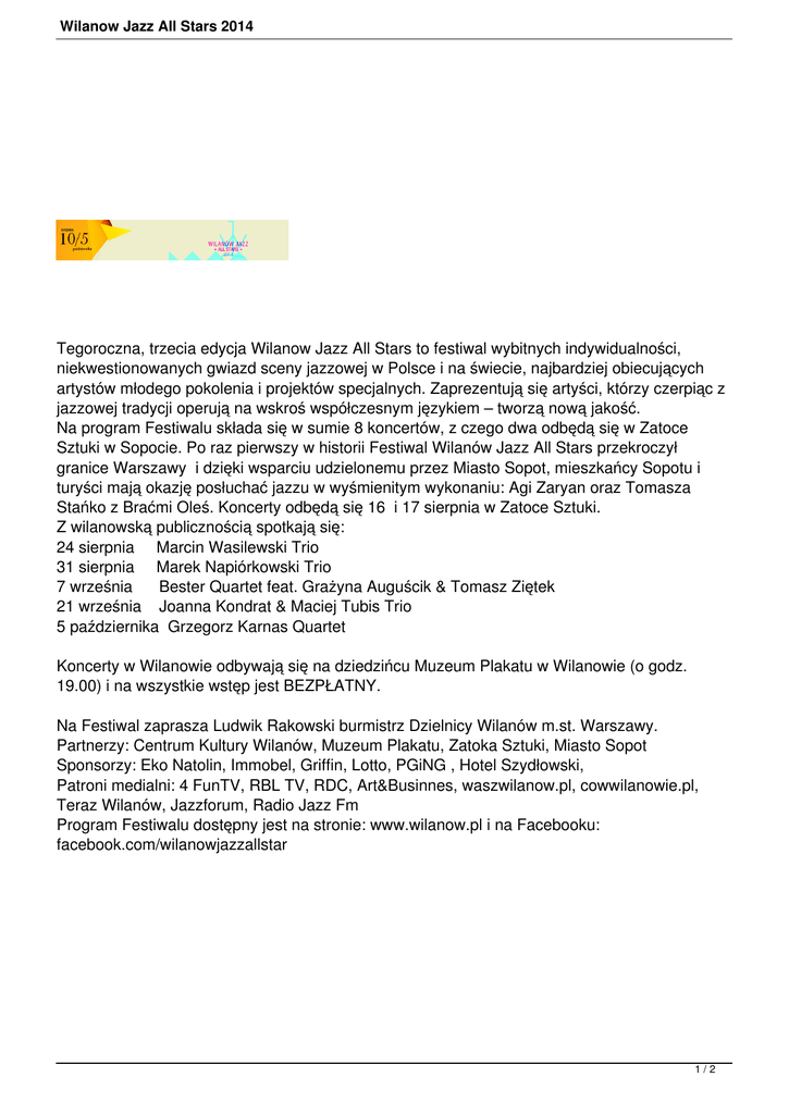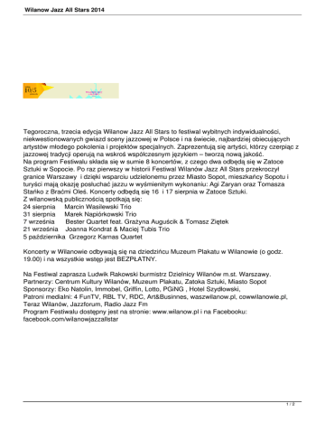 Wilanow Jazz All Stars 2014 Tegoroczna, trzecia edycja Wilanow Jazz All Stars to festiwal wybitnych indywidualności, niekwestionowanych gwiazd sceny jazzowej w Polsce i na świecie, najbardziej obiecujących artystów młodego pokolenia i projektów specjalnych. Zaprezentują się artyści, którzy czerpiąc z jazzowej tradycji operują na wskroś współczesnym językiem – tworzą nową jakość. Na program Festiwalu składa się w sumie 8 koncertów, z czego dwa odbędą się w Zatoce Sztuki w Sopocie. Po raz pierwszy w historii Festiwal Wilanów Jazz All Stars przekroczył granice Warszawy i dzięki wsparciu udzielonemu przez Miasto Sopot, mieszkańcy Sopotu i turyści mają okazję posłuchać jazzu w wyśmienitym wykonaniu: Agi Zaryan oraz Tomasza Stańko z Braćmi Oleś. Koncerty odbędą się 16 i 17 sierpnia w Zatoce Sztuki. Z wilanowską publicznością spotkają się: 24 sierpnia Marcin Wasilewski Trio 31 sierpnia Marek Napiórkowski Trio 7 września Bester Quartet feat. Grażyna Auguścik & Tomasz Ziętek 21 września Joanna Kondrat & Maciej Tubis Trio 5 października Grzegorz Karnas Quartet Koncerty w Wilanowie odbywają się na dziedzińcu Muzeum Plakatu w Wilanowie (o godz. 19.00) i na wszystkie wstęp jest BEZPŁATNY. Na Festiwal zaprasza Ludwik Rakowski burmistrz Dzielnicy Wilanów m.st. Warszawy. Partnerzy: Centrum Kultury Wilanów, Muzeum Plakatu, Zatoka Sztuki, Miasto Sopot Sponsorzy: Eko Natolin, Immobel, Griffin, Lotto, PGiNG , Hotel Szydłowski, Patroni medialni: 4 FunTV, RBL TV, RDC, Art&Businnes, waszwilanow.pl, cowwilanowie.pl, Teraz Wilanów, Jazzforum, Radio Jazz Fm Program Festiwalu dostępny jest na stronie: www.wilanow.pl i na Facebooku: facebook.com/wilanowjazzallstar 1/2 Wilanow Jazz All Stars 2014 2/2