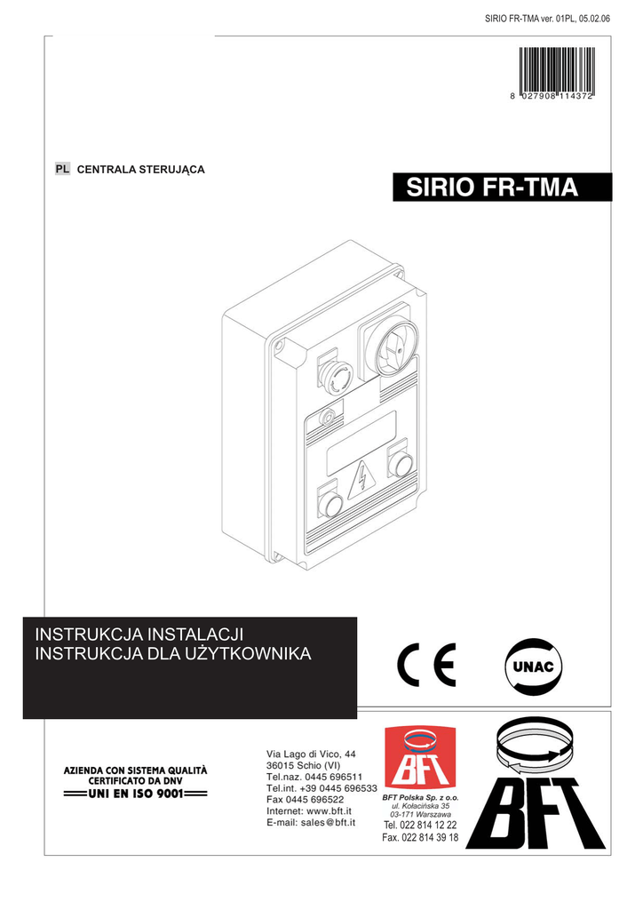 SIRIO FR-TMA ver. 01PL, 05.02.06 PL CENTRALA STERUJ¥CA INSTRUKCJA INSTALACJI INSTRUKCJA DLA U¯YTKOWNIKA Tel. 022 814 12 22 Fax. 022 814 39 18 INSTRUKCJA INSTALACJI POLSKI Dziêkujemy Pañstwu za wybór produktu BFT. Jesteœmy pewni, ¿e bêd¹ Pañstwo wiêcej ni¿ zadowoleni z u¿ytkowania naszego napêdu do bram oraz innych elementów sterowania. Produkt jest dostarczany z instrukcj¹ „u¿ytkowania” i broszur¹ dotycz¹c¹ „Instalacji”. Obydwie czêœci powinny zostaæ przeczytane uwa¿nie, poniewa¿ dostarczaj¹ wa¿nych informacji o bezpieczeñstwie i prawid³owym uruchomieniu napêdu. Oœwiadczamy, ¿e ten produkt jest zgodny z nastêpuj¹cymi europejskimi Dyrektywami: 89/336/EEC, 73/23/EEC oraz 98/37/EWG (z póŸniejszymi zmianami). 1) ZASADY BEZPIECZEÑSTWA OSTRZE¯ENIE! Niepoprawna instalacja albo niew³aœciwe u¿ycie produktu mo¿e spowodowaæ uszkodzenie osób, zwierz¹t lub rzeczy. Instalacja musi byæ wykonana zgodnie z zaleceniami dotycz¹cymi zabezpieczeñ i sterowañ wymienionymi w EN 12978. Rozdzia³ „ZASADY BEZPIECZEÑSTWA” oraz ca³a instrukcja instalacji i u¿ytkownika dostarczone z tym produktem powinny byæ przeczytane uwa¿nie, poniewa¿ dostarczaj¹ wa¿nych informacji o bezpieczeñstwie, instalacji i u¿ytkowaniu. ! Odpady i materia³y z opakowania (plastik, tektura, polistyren itd.) wykonane s¹ zgodnie z warunkami okreœlonymi przez aktualne europejskie standardy. Trzymaj torby z nylonu lub polistyrenu poza zasiêgiem dzieci. ! Przechowuj niniejsz¹ instrukcjê razem z opisem technicznym dla przysz³ych przegl¹dów oraz napraw. ! Ten produkt by³ zaprojektowany i wyprodukowany wy³¹cznie do u¿ycia wyszczególnionego w obecnej dokumentacji. Jakiekolwiek inne u¿ycie nie wyszczególnione w tej dokumentacji mog³oby uszkodziæ produkt i mo¿e byæ niebezpieczne. ! Spó³ka nie ponosi ¿adnej odpowiedzialnoœci za jakiekolwiek konsekwencje wynikaj¹ce z niew³aœciwego u¿ycia produktu, albo u¿ytkowania które nie jest wyszczególnione w obecnej dokumentacji. ! Nie instaluj produktu w obszarze zagro¿enia wybuchem. ! Spó³ka nie ponosi ¿adnej odpowiedzialnoœci wynikaj¹cej z nieprzestrzegania “Zasad bezpieczeñstwa” oraz nie dochowania nale¿ytej starannoœci podczas instalacji urz¹dzeñ automatyki do otwierania i zamykania bram, jak równie¿ od jakichkolwiek deformacji, które mog³yby zdarzyæ siê podczas u¿ycia. ! Instalacja musi byæ dostosowana do warunków wymienionych w nastêpuj¹cych dyrektywach europejskich: 89/336/CEE, 73/23/EWG, 98/37/EWG z póŸniejszymi poprawkami. !W krajach poza UE, dobry poziom bezpieczeñstwa zapewniæ mo¿e zachowanie wy¿ej wymienionych standardów. Nale¿y pamiêtaæ równie¿ o aktualnych lokalnych normach i przepisach. ! Wy³¹cz napiêcie zasilaj¹ce przed wykonaniem jakiejkolwiek pracy z instalacj¹ elektryczn¹. Roz³¹cz te¿ jakiekolwiek baterie zasilania awaryjnego, je¿eli takich u¿yto. ! W linii zasilaj¹cej zastosuj wy³¹cznik bezpieczeñstwa, z odleg³oœci¹ styków równ¹ albo wiêksz¹ ni¿ 3,5 mm. ! Linia zasilaj¹ca powinna byæ zabezpieczona bezpiecznikiem ró¿nicowo-pr¹dowym z progiem 0,03A ! SprawdŸ poprawnoœæ uziemienia: po³¹cz wszystkie czêœci z metalu (bramê i wszystkie komponenty systemu) do zacisku uziemiaj¹cego. ! Zamontuj odpowiednie urz¹dzenia zabezpieczaj¹ce (fotokomórki, listwy krawêdziowe i tak dalej), które s¹ potrzebne by ochroniæ u¿ytkowników mog¹cych znaleŸæ siê w obszarze dzia³ania bramy przed niebezpieczeñstwem spowodowanym przez zgniecenie, podniesienie i uderzenie krawêdzi¹ bramy itp. ! Zamocuj przynajmniej jeden ostrzegawczy sygnalizator œwietlny w widocznym miejscu. Przyklej znak ostrzegawczy do bramy. ! Spó³ka nie ponosi ¿adnej odpowiedzialnoœci wynikaj¹cej z poprawnego funkcjonowania, gdy wraz z napêdem s¹ u¿ywane !elementy dodatkowe innych producentów. ! U¿ywaj wy³¹cznie oryginalnych czêœci zamiennych i osprzêtu. ! Nie modyfikuj komponentów automatyzacji, je¿eli nie jesteœ upowa¿niony przez spó³kê. ! Po uruchomieniu, poinstruuj wszystkich u¿ytkowników o zasadzie dzia³ania i obs³ugi napêdu bramy gara¿owej. Poinformuj o sposobie awaryjnego otwierania w przypadku awarii lub braku zasilania. ! Pilot do uruchamiania bramy przechowuj poza zasiêgiem dzieci, w taki sposób, aby by³o wykluczone jego niepo¿¹dane u¿ycie. ! Utrzymuj dzieci i inne osoby poza zasiêgiem pracuj¹cej bramy. Bramê nale¿y otwieraæ i zamykaæ tylko kiedy jest widoczny ca³y !zakres dzia³ania bramy i nie przebywaj¹ w nim ludzie. ! Jakiekolwiek przeróbki instalacji lub naprawy zlecaj wy³¹cznie wykwalifikowanemu personelowi. ! U¿ytkowanie, które nie jest wyraŸnie wymienione w niniejszej instrukcji, nie jest dozwolone. ! Instalacja musi byæ wykonana zgodnie z zaleceniami dotycz¹cymi zabezpieczeñ i sterowañ wymienionymi w EN 12978. 2) OPIS Centrala steruj¹ca SIRIO FR wyposa¿ona w mikroprocesor, przeznaczona do si³owników wyposa¿onych w silniki zasilane napiêciem 3 fazowym 400V lub 1 fazowym 230V. Wyposa¿ona jest w przyciski steruj¹ce oraz g³ówny wy³¹cznik zasilania. Za pomoc¹ diod sygnalizacyjnych LED mo¿na dokonaæ diagnozy poprawnoœci dokonanych po³¹czeñ. Zmiany ustawieñ dokonuje siê za pomoc¹ mikroprze³¹czników DIP-switch oraz potencjometrów monta¿owych. 3) SPECYFIKACJA TECHNICZNA Zasilanie: 400 Vac 3-fazy 230 Vac 1-faza Pr¹d silnika: 2A 4A Separacja elektryczna zasilanie/niskie napiêcie:> 2MOhm 500Vdc Odpornoœæ dielektryczna zasilanie/niskie napiêcie: 3750Vac / 1' Maksymalna moc silnika: 750W 375W Zasilanie urz¹dzeñ dodatkowych: 24Vac/0,5A Obci¹¿enie wyjœcia SCA: 24V/3W Wejœcie lampy sygnalizacyjnej: 230V/40W Wymiary: patrz rysunek fig.1 4) LISTWA ZACISKOWA - (Fig.3) UWAGA W celu wykonania okablowania i instalacji elektrycznej nale¿y postêpowaæ zgodnie ze standardami obowi¹zuj¹cymi w danym kraju. Przewody zasilone ró¿nymi napiêciami powinny byæ fizycznie odseparowane l