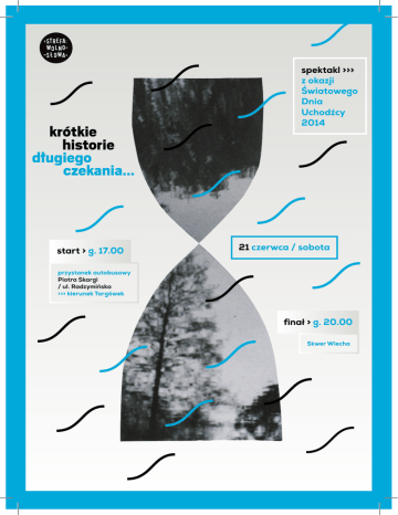 krótkie historie długiego czekania... start > g. 17.00 spektakl >>> z okazji Światowego Dnia Uchodźcy 2014 21 czerwca / sobota przystanek autobusowy Piotra Skargi / ul. Radzymińska >>> kierunek Targówek finał > g. 20.00 Skwer Wiecha występują: INFO >>> www.strefawolnoslowa.pl krótkie historie długiego czekania... reżyseria > Alicja Borkowska dramaturgia > Tomasz Gromadka współpraca dramaturgiczna > Dagna Dąbrowiecka współpraca organizacyjna > Weronika Chinowska, Elżbieta Jankowska Czekają. Na zmianę, na dokumenty, na powrót do rodzinnego kraju, na spotkanie z rodziną, na pracę. Ich marzenia o lepszym życiu przeplatają się ze wspomnieniami kraju, który zostawili, z planami na przyszłość, z sytuacjami z codziennego życia. Historie uchodźców oraz wątki z „Trzech sióstr” Czechowa spotkają się w interaktywnym przedstawieniu fundacji Strefa WolnoSłowa na Targówku. „Krótkie historie długiego czekania” to opowieści o oczekiwaniu, tęsknocie i podróży rozgrywające się w przestrzeni przystanków autobusowych, tworzone przez uczestników wielokulturowych warsztatów Strefy WolnoSłowej - migrantów, uchodźców oraz seniorów z dzielnicy Targówek. Publiczność zaproszona zostanie do udziału w swoistej podróży-układance. Jej kolejne elementy będą składały się na refleksję nad oczekiwaniem, nad sensem czekania, jak również na opowieść o biurokracji, o uzależnieniu ludzkiego losu od kawałka papieru. Mariusz Budzisz, Barbara Buksińska, Ivana Davidović, Ivan Diaz, Anna Fiszer, Barbara Herman, Vira Hres, Victoria Ivanova, Barbara Jędraszko, Sviatoslav Kariuk, Artem Kozlov, Ioana Maciejewska, Olena Marciniak, Liuda Moriak, Arnold Nasalski, Iana Oparij, Roksolana Osiedach, Łukasz Prusiński, Vita Shkaraban, Marina Staravojtava, Stanisław Szewczyk, Małgorzata Szymańska, Mikołaj Szymański, Marina Tsedronska, Fenglan Xu, Anastasiya Yiakunina, Abdellah Yamani, Anka Zakrzewska, Zinowiy Zhmurko, Oleska Zoloto-wa oraz seniorzy z Dzielnicy Targówek i panie oczekujące na status uchodźcy - rezydentki Ośrodka dla Uchodźców na Targówku. GŁÓWNY PARTNER Tym razem wielokulturowa grupa teatralna złożona jest z Polaków, migrantów i uchodźców, zarówno pierwszy raz biorących udział w wydarzeniu teatralnym, jak i tych, którzy uczestniczyli we wcześniejszych inicjatywach teatralnych fundacji. W spektaklu wykorzystane zostaną prawdziwe historie, autorskie teksty i opowieści powstałe w wyniku improwizacji inspirowanych dramatem „Trzy Siostry” Antoniego Czechowa. Spektakl realizowany jest w ramach projektu Azyl Warszawa 2014 współfinansowanego przez Miasto Stołeczne Warszawa, Dzielnicę Targówek. PARTNERZY PROJEKT WSPÓŁFINANSUJE PATRONI MEDIALNI