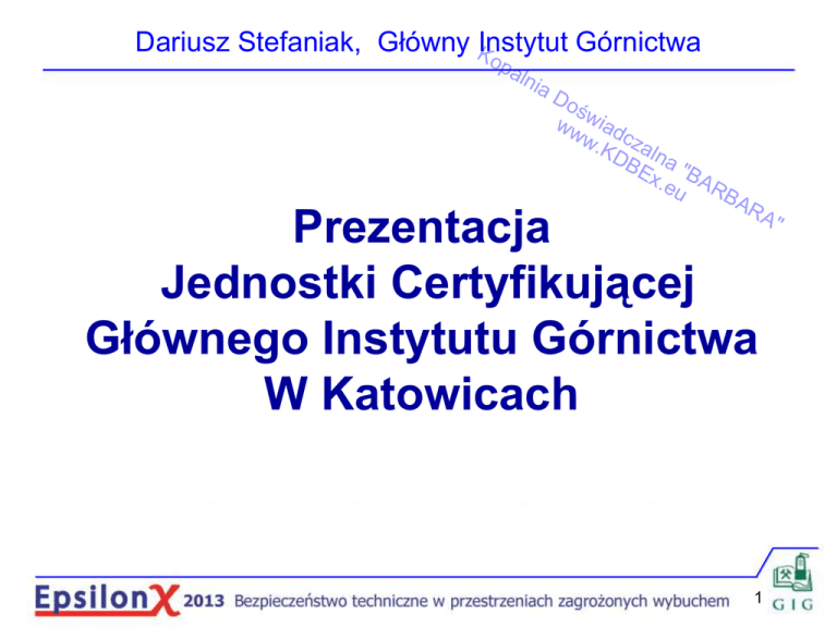 Dariusz Stefaniak, Główny KInstytut Górnictwa op aln ia Do ś ww wiad w.K cza DB lna Ex "BA .eu R BA RA " Prezentacja Jednostki Certyfikującej Głównego Instytutu Górnictwa W Katowicach 1 Podstawy formalne działalności Jednostki Certyfikującej GIG K op aln ia Do ś ww wiad w.K cza Ustawy horyzontalne : DB lna Ex "BA eu Rjednolity: Ustawa z dnia 30 sierpnia 2002 r. o systemie oceny zgodności .(tekst BA RA do Dz.U. 2004 r. nr 204, poz. 2087 z późn. zmianami). Ustawa stanowi podstawę " transpozycji dyrektyw nowego podejścia. Ustawa z dnia 12 grudnia 2003 r. o ogólnym bezpieczeństwie produktów (Dz.U. z 31.12.2003 r. nr 229, poz. 2275). Jest to transpozycja Dyrektywy o ogólnym bezpieczeństwie produktu (2001/95/WE) Ustawa z dnia 2 marca 2000 r. o ochronie niektórych praw konsumentów oraz o odpowiedzialności za szkodę wyrządzoną przez produkt niebezpieczny (Dz.U. z dnia 31.03.2000 r. Nr 22, poz. 271). Jest to transpozycja Dyrektywy o odpowiedzialności producenta za szkody wyrządzone przez wadliwy wyrób (85/374/EWG). 2 Schemat organizacyjny Jednostki K Certyfikującej GIG op aln ia NACZELNY DYREKTOR GŁÓWNEGO INSTYTUTU GÓRNICTWA Do ś ww wiad w.K cza DB lna Ex "BA .eu R BA RA Rada ds. Certyfikacji KIEROWNIK Jednostki Certyfikującej Specjaliści Komitet Techniczny Sekretariat Kierownik ds. Jakości Zespół Certyfikacji Systemów Zarządzania " Zespół Certyfikacji Osób i Rozwoju Systemów Zespół Certyfikacji Wyrobów - Katowice - Zespół Certyfikacji Wyrobów - KD Barbara - Specjaliści Specjaliści Specjaliści 3 Posiadane przez Jednostkę Certyfikującą akredytacje PCA : K op aln ia Do ś ww wiad w.K cza DB lna Ex "BA .eu R wydana BA akredytacja PCA nr AC 038 w zakresie certyfikacji wyrobów, RA " akredytacja PCA nr AC 083 wydana w zakresie certyfikacji systemów zarządzania, akredytacja PCA nr AC 145 wydana w zakresie certyfikacji personelu (osób), 4 Certyfikacja systemówKzarządzania op aln ia PREDSIĘBIORSTWO ( producent wyrobu, wykonawca usługi ) Do ś ww wiad w.K cza DB lna Ex "BA .eu R BA RA " WDRAŻA SZJ ( wg PN-ISO 9001 ) certyfikacja WDRAŻA SZŚ ( wg PN-EN ISO 14001 ) JEDNOSTKA CERTYFIKUJĄCA SYSTEMY akredytacja JEDNOSTKA AKREDYTUJĄCA (posiada wdrożony certyfikacja posiada system wg. PN-EN ISO/IEC 17021 system wg EN ISO/IEC 17011 WDRAŻA SZBHP ( wg PN-N-18001 ) 5 Certyfikacja osób (personelu) K op aln ia OSOBA Do ś ww wiad w.K cza DB lna Ex "BA .eu R BA RA " SZKOLENIE certyfikacja JEDNOSTKA JEDNOSTKA CERTYFIKUJĄCA akredytacja AKREDYTUJĄCA PERSONEL EGZAMIN posiada wdrożony system certyfikacja posiada wdrożony system wg wg PN-EN ISO/IEC 17024 EN ISO/IEC 17011 NADZÓR JC 6 Certyfikacja wyrobów K op aln ia PREDSIĘBIORSTWO ( producent wyrobu ) Do ś ww wiad w.K cza DB lna Ex "BA .eu R BA RA " WYRÓB - PROJEKT JEDNOSTKA JEDNOSTKA certyfikacja CERTYFIKUJĄCA akredytacja AKREDYTUJĄCA WYROBY PRODUKCJA) posiada wdrożony certyfikacja (posiada wdrożony system wg system wg PN-EN 45011) EN ISO/IEC 17011 POWTARZALNOŚĆ PROD. - NADZÓR JC 7 Uproszczona procedura certyfikacji K dobrowolnej wyrobów op Kontakt Klienta z GIG-JC aln ia Złożenie wniosku i dokumentacji Opracowanie programu badań wyrobu Do ś ww wiad w.K cza DB lna Ex "BA .eu R BA Wykonanie badań w laboratoriach akredyt. RA " Ocena dokumentacji technicznej Audit WTO produkcji wyrobu Przygotowanie protokołu z oceny wyrobu Orzeczenie Komitetu Technicznego Decyzja o przyznaniu certyfikatu Odmowa wydania Wydanie certyfikatu Audity nadzoru 8 Autoryzacje i notyfikacje K op aln ia Do św Główny Instytut Górnictwa posiada autoryzacje i wnotyfikacje ww iadc w następującym zakresie: .KD zaln BE a "B x AR Dyrektywa 94/9/WE w sprawie zasadniczych wymagań dla urządzeń .eiu systemów BA RA ochronnych przeznaczonych do użytku w przestrzeniach zagrożonych wybuchem " > pełny zakres dyrektywy (badania + certyfikacja + zatwierdzanie systemów jakości), Dyrektywa 2006/42/WE w sprawie zasadniczych wymagań dla maszyn > maszyny do robót podziemnych (badania + certyfikacja + zatwierdzanie systemu jakości), Dyrektywa 93/15/WE w sprawie materiałów wybuchowych przeznaczonych do użytku cywilnego > pełny zakres dyrektywy (badania + certyfikacja + zatwierdzanie systemów jakości) Oczekujemy na autoryzacje i notyfikacje w obszarze następnych dwóch dyrektyw: 2007/23/WE dotyczącej wyrobów pirotechnicznych 89/106/EWG dotyczącej materiałów budowlanych 9 Przykładowy certyfikat badania typu WE (1-sza strona) K op aln ia Do ś ww wiad w.K cza DB lna Ex "BA .eu R BA RA 10 " Przykładowy certyfikat zatwiedzenia systemu jakości K op aln ia Do ś ww wiad w.K cza DB lna Ex "BA .eu R BA RA 11 " Certyfikacja personelu (osób) K op aln ia • Do ś ww wiad Obecnie ocena personelu, dotycząca obszaru w.K cza związanego l z Dyrektywą ATEX, realizowana jest w następujących Dkategoriach: BE na "B x.e AR u B DEx I – certyfikacja osób dozoru ruchu elektrycznego ARnad A" użytkownikami urządzeń i systemów ochronnych w zakładach górniczych, w których występuje zagrożenie wybuchowe, • DEx II – certyfikacja osób dozoru ruchu nad użytkownikami urządzeń i systemów ochronnych w zakładach pozagórniczych, w których występuje zagrożenie wybuchowe, • IEx - certyfikacja inspektorów fabrycznych urządzeń i systemów ochronnych przeznaczonych do użytku w przestrzeniach zagrożonych wybuchem, • MEx – certyfikacja menadżerów – absolwentów studiów podyplomowych z zakresu bezpieczeństwa technicznego w przestrzeniach zagrożonych wybuchem. 12 Schemat procedury certyfikacji personelu K op aln ia Do ś i niezbędnej dokumentacji w odniesieniu do wybranej kategorii ww wiad w.K cza DB lna Ex "BA .eu R Złożenie wniosku o certyfikację wraz z wymaganą dokumentacją BA Wstępna weryfikacja wniosku. Rejestracja wniosku. Wstępny kontakt z osobą wnioskującą; Informacje o programie certyfikacji, RA Egzamin wnioskodawcy Przegląd i merytoryczna ocena zgromadzonego materiału. Podpis