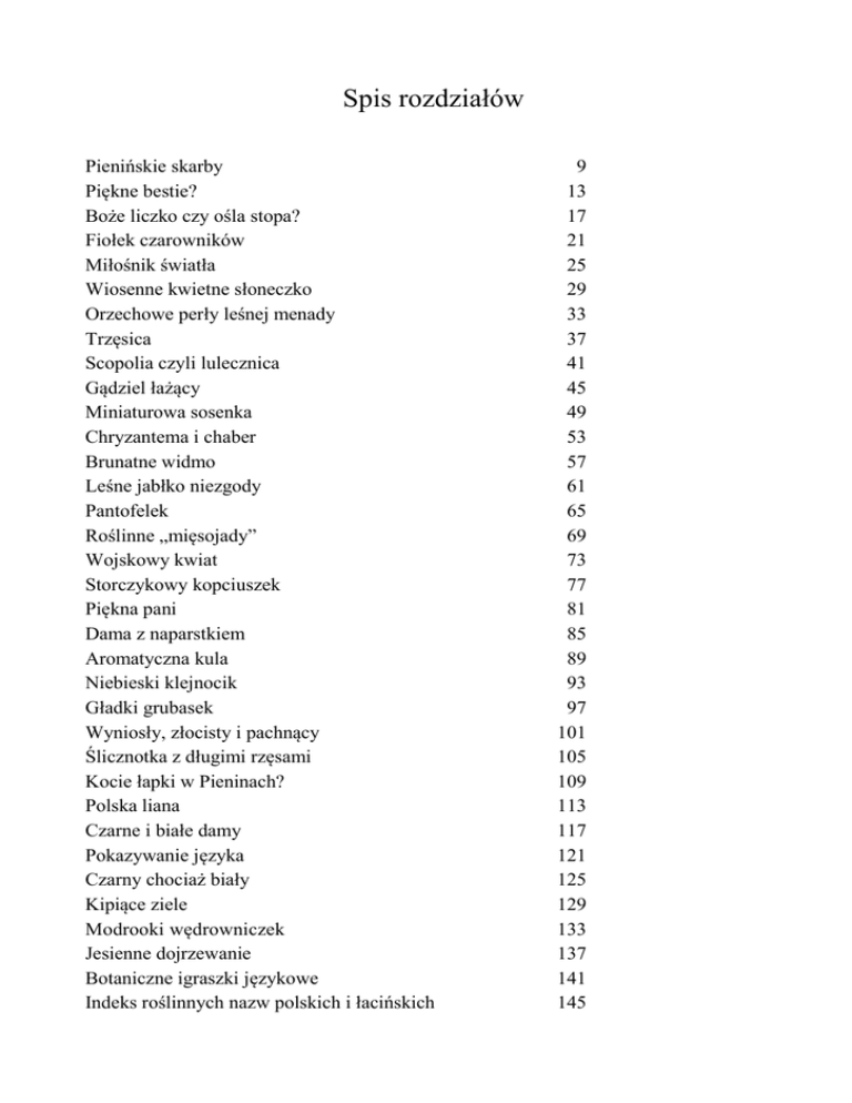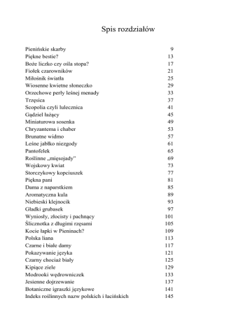 Spis rozdziałów Pienińskie skarby Piękne bestie? Boże liczko czy ośla stopa? Fiołek czarowników Miłośnik światła Wiosenne kwietne słoneczko Orzechowe perły leśnej menady Trzęsica Scopolia czyli lulecznica Gądziel łażący Miniaturowa sosenka Chryzantema i chaber Brunatne widmo Leśne jabłko niezgody Pantofelek Roślinne „mięsojady” Wojskowy kwiat Storczykowy kopciuszek Piękna pani Dama z naparstkiem Aromatyczna kula Niebieski klejnocik Gładki grubasek Wyniosły, złocisty i pachnący Ślicznotka z długimi rzęsami Kocie łapki w Pieninach? Polska liana Czarne i białe damy Pokazywanie języka Czarny chociaż biały Kipiące ziele Modrooki wędrowniczek Jesienne dojrzewanie Botaniczne igraszki językowe Indeks roślinnych nazw polskich i łacińskich 9 13 17 21 25 29 33 37 41 45 49 53 57 61 65 69 73 77 81 85 89 93 97 101 105 109 113 117 121 125 129 133 137 141 145