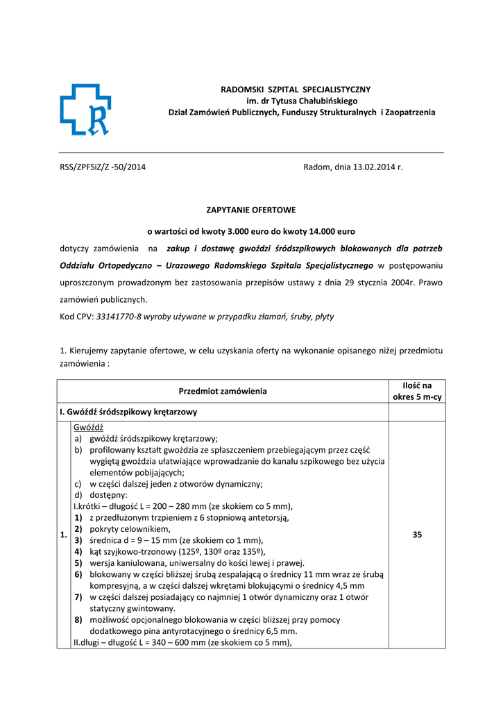 RADOMSKI SZPITAL SPECJALISTYCZNY im. dr Tytusa Chałubińskiego Dział Zamówień Publicznych, Funduszy Strukturalnych i Zaopatrzenia RSS/ZPFSiZ/Z -50/2014 Radom, dnia 13.02.2014 r. ZAPYTANIE OFERTOWE o wartości od kwoty 3.000 euro do kwoty 14.000 euro dotyczy zamówienia na zakup i dostawę gwoździ śródszpikowych blokowanych dla potrzeb Oddziału Ortopedyczno – Urazowego Radomskiego Szpitala Specjalistycznego w postępowaniu uproszczonym prowadzonym bez zastosowania przepisów ustawy z dnia 29 stycznia 2004r. Prawo zamówień publicznych. Kod CPV: 33141770-8 wyroby używane w przypadku złamań, śruby, płyty 1. Kierujemy zapytanie ofertowe, w celu uzyskania oferty na wykonanie opisanego niżej przedmiotu zamówienia : Przedmiot zamówienia Ilość na okres 5 m-cy I. Gwóźdź śródszpikowy krętarzowy Gwóźdź a) gwóźdź śródszpikowy krętarzowy; b) profilowany kształt gwoździa ze spłaszczeniem przebiegającym przez część wygiętą gwoździa ułatwiające wprowadzanie do kanału szpikowego bez użycia elementów pobijających; c) w części dalszej jeden z otworów dynamiczny; d) dostępny: I.krótki – długość L = 200 – 280 mm (ze skokiem co 5 mm), 1) z przedłużonym trzpieniem z 6 stopniową antetorsją, 2) pokryty celownikiem, 1. 3) średnica d = 9 – 15 mm (ze skokiem co 1 mm), 4) kąt szyjkowo-trzonowy (125º, 130º oraz 135º), 5) wersja kaniulowana, uniwersalny do kości lewej i prawej. 6) blokowany w części bliższej śrubą zespalającą o średnicy 11 mm wraz ze śrubą kompresyjną, a w części dalszej wkrętami blokującymi o średnicy 4,5 mm 7) w części dalszej posiadający co najmniej 1 otwór dynamiczny oraz 1 otwór statyczny gwintowany. 8) możliwość opcjonalnego blokowania w części bliższej przy pomocy dodatkowego pina antyrotacyjnego o średnicy 6,5 mm. II.długi – długość L = 340 – 600 mm (ze skokiem co 5 mm), 35 - 2. 3. 4. 5. z 6 stopniową antetorsją, do długości 520 mm pokryty celownikiem dalszym, średnica d = 9 – 15 mm (ze skokiem co 1 mm), kąt szyjkowo-trzonowy (125º, 130º oraz 135º), wersja kaniulowana, lewa, prawa. blokowany w części bliższej śrubą zespalającą o średnicy 11 mm wraz ze śrubą kompresyjną, a w dalszej części wkrętami blokującymi o średnicy 4,5 lub 5,0 mm. - w części dalszej posiadający co najmniej 1 otwór dynamiczny oraz 2 otwory statyczne gwintowane. - możliwość opcjonalnego blokowania w części bliższej przy pomocy dodatkowego pina antyrotacyjnego o średnicy 6,5 mm. e) system wykonany ze stali nierdzewnej, możliwość użycia tytanu/stopu tytanu; f) 1 szt. dla każdego kompletu; Śruby blokujące a) śruby blokujące; b) system wykonany ze stali nierdzewnej, możliwość użycia tytanu/stopu tytanu; c) 2 szt. dla każdego kompletu; Śruby kompresyjne a) śruby kompresyjne, b) system wykonany ze stali nierdzewnej, możliwość użycia tytanu/stopu tytanu; c) 2 szt. dla każdego kompletu Śruby zespalające a) śruba zespalająca 6,5 i 11 mm; po 1 szt. dla każdego kompletu b) ze stożkowy wyjściem gwintu zmniejszającym koncentrację naprężeń; c) system wykonany ze stali nierdzewnej, możliwość użycia tytanu/stopu tytanu; d) stosowanie zamiennie śruby zespalającej lub śruby zaślepiającej Śruba zaślepiająca (zaślepka) a) śruba zaślepiająca b) system wykonany ze stali nierdzewnej, możliwość użycia tytanu/stopu tytanu; c) po 1 szt. dla każdego kompletu; d) stosowanie zamiennie śruby zespalającej lub śruby zaślepiającej 40 30 30 40 6. Instrumentarium – kompletne, użyczenie; II. Gwóźdź śródszpikowy udowy (uniwersalny) Gwóźdź a) gwóźdź śródszpikowy udowy (uniwersalny); b) jeden uniwersalny gwóźdź przeznaczony do leczenia złamań kości udowej (używany przy metodzie kompresyjnej, rekonstrukcyjnej oraz wstecznej), wprowadzany metodą ante i retrograde; c) długość L = 240 – 600 mm (ze skokiem co 5 mm) d) do długości 520 mm pokryty celownikiem dalszym; 1. e) średnica d = 8 – 16 mm (ze skokiem co 1 mm)w wersji kaniulowanej, lewy i prawy; f) w części dalszej posiadający min. 4 otwory w co najmniej 2 płaszczyznach (w tym co najmniej 1 dynamiczny), z niskim blokowaniem; g) usytuowanie środka pierwszego otworu dystalnego max. 5 mm od końca gwoździa dla gwoździ kaniulowanych i 9 mm od końca gwoździa dla gwoździ litych; h) w części bliższej posiadający min. 6 otworów w tym: 2 rekonstrukcyjne, 2 do 8 blokowania wstecznego i 2 do blokowania statycznego i kompresyjnego; przy metodzie rekonstrukcyjnej blokowany w części bliższej 2 ryglami samowiercącymi o średnicy Ø 6,5 mm; j) przy metodzie kompresyjnej blokowany w części bliższej w zależności od typu złamania ryglami o średnicy Ø 4,5 mm oraz dodatkowo ryglami o średnicy Ø 6,5 mm; k) przy metodzie wstecznej blokowany w części bliższej w zależności od typu złamania 2 ryglami lub zestawem blokującym o średnicy Ø 6,5 mm; l) zapewnia zastosowanie 2 dodatkowych rygli o średnicy Ø 4,5 mm przy wielkoodłamowych złamaniach; m) w części dalszej blokowany ryglami o średnicy Ø 4,5 mm; n) system wykonany ze stali nierdzewnej, możliwość użycia tytanu/stopu tytanu; o) 1 szt. dla każdego kompletu; Śruby blokujące a) śruby blokujące o śred. 4,5 mm - 4 szt. dla kompletu lub śruby blokujące o 2. śred. 6,5 i 4,5 mm - po 2 szt. – 4 szt. dla każdego kompletu b) system wykonany ze stali nierdzewnej, możliwość użycia tytanu/stopu tytanu; Śruba zaślepiająca a) kaniulowana śruba zaślepiająca pozwalająca na wydłużenie części bliższej gwoździa w przynajmniej 6 rozmiarach w zakresie 0-25 mm stopniowane co 5 3. mm. b) system wykonany ze stali nierdzewnej, możliwość użycia tytanu/stopu tytanu; c) stosowanie zamiennie śruby zaślepiającej lub śruby kompresyjnej d) 1 szt. dla każdego kompletu; Śruba kompresyjna a) śruba kompresyjna 4. b) system wykonany ze stali nierdzewnej, możliwość użycia tytanu/stopu tytanu; c)