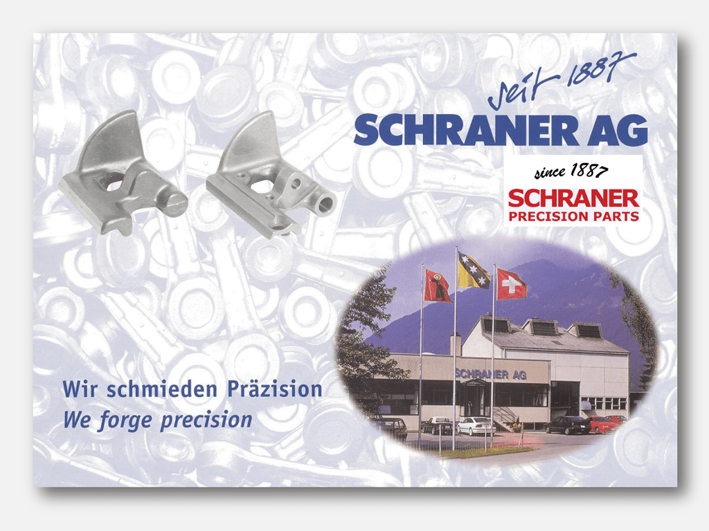 Schraner AG Schraner AG jest rodzinną firmą założoną w szwajcarskim kantonie Glarus w 1887 roku. Firma specjalizuje się w produkcji skomplikowanych i precyzyjnych odkuwek o masie od kilku gramów do około pięciu kilogramów. W 2006 roku powstała spółka córka – Schraner Polska – oferująca szeroką gamę produktów w konkurencyjnych cenach. Najwięksi klienci pochodzą ze Szwecji, Szwajcarii i z Niemiec. Schraner współpracuje ponadto z agencją sprzedaży ESMA ze Szwecji, która reprezentuje firmę na rynku skandynawskim. Schraner Polska Produkty / Branże / Segmenty Nowatorska technologia Elementy produkowane przez Schraner stosowane m. in. w następujących branżach: • przemysł maszynowy • precyzyjne urządzenia • przemysł lotniczy • konstrukcja silników • maszyny rolnicze • maszyny leśne • systemy zamkowe • sprzęt medyczny • przemysł włókienniczy • przyrządy pomiarowe • obróbka materiałów • transport są Schraner zatrudnia w sumie 50 osób (20 w Szwajcarii, 30 w Polsce). Założona w 1887 w Glarus w Szwajcarii Schraner AG jest producentem precyzyjnych podzespołów i wysokiej jakości produktów z kutego żelaza. Precyzyjne elementy różnych kształtów i rozmiarów są projektowane i produkowane m. in. dla przemysłu włókienniczego, lotnictwa, medycyny, branży sportowej, zegarmistrzostwa, jak również dla inżynierii mechanicznej. Rex-Bud Sp. z o.o. został założony w 1995 roku. Po 17 latach może pochwalić się bogatym doświadczeniem i fachową wiedzą w zakresie: • generalnego wykonawstwa – kompleksowego realizowania obiektów halowych, magazynowych, produkcyjnych, pomieszczeń biurowych • usług deweloperskich – w zakresie powierzchni magazynowych i pomieszczeń biurowych • prefabrykacji konstrukcji stalowych • betonowych posadzek przemysłowych Lista maszyn ISO TS 16949:2009 od maja 2012 Przetwarzamy wszystkie rodzaje stali do kucia, włączając stal nierdzewną, aluminium, mosiądz, miedź i brąz. Zalety odkuwek: * oszczędność materiału (w zależności od części : nawet do 5x mniej materiału) * wytrzymałość na wysokie obciążenia * większa wytrzymałość dzięki geometrycznemu rozłożeniu włókien * wyeliminowanie maksymalnych obciążeń, wzmocnienie materiału dzięki zbitej i drobnoziarnistej strukturze * niższe koszty narzędzi w porównaniu do innych technologii Ceny: Ze względu na fakt, że posiadamy zakład produkcyjny w Polsce, jesteśmy w stanie zaoferować konkurencyjne ceny. Terminy: Dzięki temu, że mamy własny dział produkcji narzędzi, jesteśmy bardzo elastyczni i nawet w krótkim czasie jesteśmy w stanie wyprodukować próbkę lub początkową serię. Projekt: Etapy projektowania i przygotowywania produkcji dużej skali realizowane są w Szwajcarii. Wszystkie szczegóły dotyczące precyzyjnej obróbki mogą być uzgodnione bezpośrednio z działem konstrukcyjnym w Oberurnen. Szwajcarska technologia za rozsądną cenę – z przyjemnością przedstawimy ofertę wszystkim zainteresowanym. Jakość: Nasza firma posiada certyfikat ISO 9001:2000 i spełnia wszystkie wymagania jakościowe. Przyjęcie i magazynowanie materiału wstępnego stanowi pierwszy etap logistyki produkcji w Schraner Polska. Magazyn umożliwia uporządkowane składowanie różnych rodzajów materiałów do produkcji. Materiał wstępny jest składowany w warunkach spełniających najwyższe wymagania naszych klientów. Cięcie materiału wstępnego Cięcie jest realizowane z precyzją +/0.4mm. Przed kuciem materiał jest poddawany procesowi oczyszczania, aby usunąć wszystkie zewnętrzne zanieczyszczenia. Śrutowanie Maszyna śrutownicza jest jedną z najważniejszych maszyn w procesie produkcji odkuwek Schraner. Po każdym etapie produkcji powierzchnia przetworzonego elementu jest czyszczona w operacji śrutowania. Pozwala to prawidłowo pracować i uniknąć niebezpieczeństwa powstania zakuć i pęknięć w kolejnych krokach. Nagrzewanie materiału Piece indukcyjne Amysa zapewniają nagrzew z możliwością osiągnięcia dowolnej temperatury, a następnie stałe jej utrzymanie, umożliwiające uzyskanie szerokiego asortymentu kształtów i wymiarów odkuwek. Kucie 3 młoty hydrauliczne dwustronnego działania LASCO HOU 160 i 1 LASCO HOU 200 są używane w dziale kucia matrycowego. Z technicznego i ekonomicznego punktu widzenia, młot kuźniczy jest nadal idealną jednostką kształtującą dla przemysłu kuźniczego. Młot hydrauliczny zapewnia maksymalną siłę formującą przy minimalnym zużyciu energii, co stanowi doskonałe warunki do kucia szerokiej gamy części. LASCO jest wynalazcą i pionierem hydraulicznych systemów napędowych dla młotów matrycowych. Hydrauliczny młot dwustronnego działania HO-U opracowany przez LASCO przy użyciu najnowocześniejszych systemów hydraulicznego i elektronicznego sterowania wniósł nowe standardy wydajności i jakości. Precyzja w kuciu jest podstawą wszystkich następujących działań. Obcinanie wypływki Do obcinania wypływki zastosowaliśmy prasy MIOS T55 TR, które pozwalają na zachowanie precyzji dzięki zwartej konstrukcji stalowej. Kalibracja na zimno Przy produkcji najbardziej precyzyjnych komponentów, kiedy wymagania co do tolerancji są na najwyższym poziomie, ostatnim krokiem jaki stosujemy jest kalibracja komponentu. Do kalibracji używamy prasy śrubowej Weingarten PA 140 Muller- Prasa śrubowa PA 140 zapewnia bardzo wysoką precyzję operacji kalibrowania. W spawanej, bardzo wytrzymałej konstrukcji monoblokowej, porusza się po regulowanych we wszystkie cztery strony prowadnicach, wykonany z odlewu staliwnego, wysokiej jakości suwak. Zainstalowany na prasie układ sterowania MW-FORGE-CONTROL-SYSTEM (FCS) podczas ustawiania wymaganych parametrów urządzenia łączy nowoczesność w działaniu, wysoką elastyczność i maksymalną precyzję. Obróbka cieplna Piece elektryczne BOREL do obróbki cieplnej odkuwek umożliwiają 