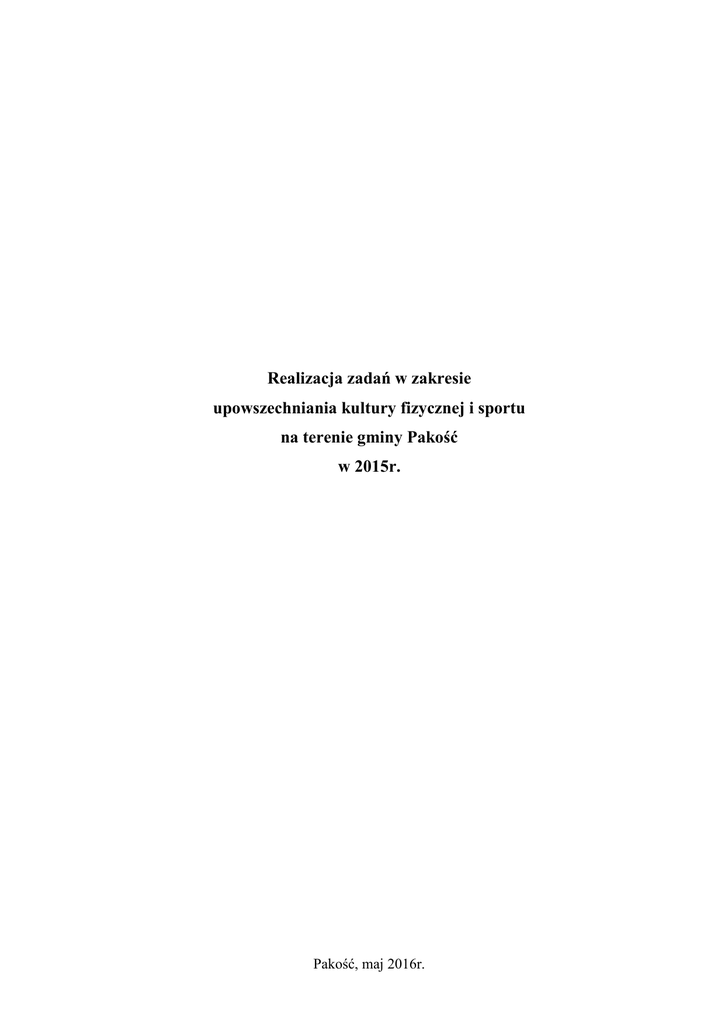 Realizacja zadań w zakresie upowszechniania kultury fizycznej i sportu na terenie gminy Pakość w 2015r. Pakość, maj 2016r. Wstęp Działalność pożytku publicznego prowadzona w Gminie Pakość w zakresie upowszechniania kultury fizycznej i sportu stanowi ważny element w sferze działań publicznych koncentrujących wokół siebie podmioty i ludzi aktywizujących społeczność lokalną. Podejmowana inicjatywa na rzecz wspólnoty samorządowej wpływa na poprawę poziomu sportowo- sprawnościowego, pozwala na samodoskonalenie, poszerzanie wiedzy oraz wymianę doświadczeń wśród dzieci, młodzieży a także dorosłych w różnorodnych dziedzinach sportu. Uczestnicy nabywają umiejętności pracy w zespole, poznają zasady bezpieczeństwa, realizują zainteresowania. Ponadto każde wspólne działanie w dziedzinie kultury fizycznej i sportu integruje społeczność, kształtuje pozytywne postawy, a także sposób postrzegania sportu i jego wpływ na zdrowy i aktywny styl życia. 1. Podmioty zajmujące się na terenie gminy Pakość w 2015r. realizacją zadań z zakresu upowszechniania kultury fizycznej i sportu a) b) c) d) e) f) Klub Sportowy Notecianka (KS ,,Notecianka”), Miejsko-Gminne Zrzeszenie Ludowe Zespoły Sportowe (M-GZ LZS), Międzyszkolny Uczniowski Klub Sportowy Sokół (MUKS ,,Sokół”), Ludowy Uczniowski Klub Sportowy ,,Kościelec” (LUKS), Yacht Klub Polska Inowrocław, Stowarzyszenie Rozwoju Sołectwa Wielowieś w Gminie Pakość. 2. Środki przeznaczone na realizację zadań w zakresie upowszechniania kultury fizycznej i sportu w 2015r. Największym beneficjentem środków na realizację ww. zadań w 2015r. jak i latach poprzednich był KS ,,Notecianka”. Udział Klubu w ogólnej puli pieniędzy rozdzielonych na poszczególne podmioty wyniósł 60,47%. Na kolejnych pozycjach znalazły się M-GZ LZS (23,26%) oraz MUKS „Sokół” (12,33%), Stowarzyszenie Rozwoju Sołectwa Wielowieś (2,33%), YKP Inowrocław (1,17%), LUKS Kościelec (0,47 %). Tab.1. Środki przeznaczone na upowszechnianie kultury fizycznej i sportu w l. 2012-2015 w tys. zł Podmiot 2012 2014 2013 2015 % tys. zł % tys. zł % KS „Notecianka” 129.000,00 60,4 130.000,00 60,5 130.000,00 61,32 130.000,00 60,47 M-GZ LZS 50.000,00 23,5 50.000,00 23,5 49.000,00 23,11 50.000,00 23,26 MUKS „Sokół” 31.000,00 14,5 31.000,00 14,5 30.000,00 14,15 26.500,00 12,33 YKP Inowrocław 2.000,00 1,0 2.000,00 1,0 2.000,00 0,94 2.500,00 1,17 Stowarzyszenie Rozwoju Sołectwa Wielowieś - - - - 1.000,00 0,48 5.000,00 2,33 LUKS Kościelec 1.000,00 0,6 1.000,00 0,6 1.000,00 0,47 1.000,00 0,47 Ogółem 214.000,00 100 214.000,00 100 212.000,00 100 215.000,00 100 tys. zł tys % Dominująca pozycja KS ,,Notecianka” w pozyskiwaniu środków przeznaczonych na realizację zadań w zakresie kultury fizycznej i sportu utrzymuje się od lat na stosunkowo wysokim poziomie tj. ok 60 % środków przeznaczonych na realizację zadań przez Gminę Pakość. Ryc. 1. Środki przeznaczone na kulturę fizyczną i sport w l. 2012-2015 w tys. zł. Dla pozostałych stowarzyszeń wysokość środków przeznaczonych na upowszechnianie kultury fizycznej i sportu w ostatnich latach utrzymuje się na stałym poziomie, jednakże należy zauważyć znaczny wzrost dotacji przekazanej z budżetu gminy dla Stowarzyszenia Rozwoju Sołectwa Wielowieś w Gminie Pakość. Analizując strukturę środków przeznaczanych na realizację zadań z zakresu kultury fizycznej i sportu w roku 2015 należy spojrzeć również na wydatkowanie środków w skali ponadlokalnej, co z jednej strony pokazuje podejście danej JST do tego typu działań, z drugiej zaś daje pełniejszy obraz sytuacji. W odniesieniu do udziału środków przeznaczanych na sport w ogólnej puli wydatków budżetowych, udział ten w przypadku gminy Pakość wynosił 0,69%. Dla porównania w gminach sąsiednich dla Barcina wskaźnik ten wynosił 0,58%, dla gminy Gniewkowo 0,38%, natomiast dla gminy Janikowo 0,79%. Tab. 2. Środki przeznaczone na kulturę fizyczną i sport przez wybrane JST Dochody w mln Wydatki w mln Dotacja w tys. zł Udział w wydatkach gm. Barcin 60.500.000,00 59.500.000,00 346.000,00 0,58 gm. Pakość 29.600.000,00 31.100.000,00 215.000,00 0,69 gm. Janikowo 46.700.000,00 44.000.000,00 350.000,00 0,79 gm. Gniewkowo 44.400.000,00 44.400.000,00 150.000,00 0,38 Gmina 3. Tryb udzielania dotacji na fizycznej realizacji zadania w zakresie upowszechniania kultury Sposób udzielenia dotacji reguluje w szczególności Program współpracy Gminy Pakość z organizacjami pozarządowymi. Wysokość środków finansowych przeznaczonych na realizację zadań zleconych wskazanych w „Programie” określa Rada Miejska w uchwale budżetowej. Podstawę prawną stanowi ustawa z dnia 8 marca 1990 r. o samorządzie gminnym (Dz.U. z 2016r., poz.446), oraz ustawa z dnia 24 kwietnia 2003 r. o działalności pożytku publicznego i wolontariacie (Dz.U. z 2016r. poz. 239). 3.1. Kontrola realizacji zadania Gmina Pakość sprawuje kontrolę prawidłowości wykonywania zadania publicznego przez podmiot, któremu udzielono dotacji oraz prawidłowości jej wydatkowania. Kontrola może być przeprowadzona w toku realizacji zadania publicznego oraz po jego zakończeniu. Ponadto Beneficjent zobowiązany jest do składania w terminie do 31 stycznia roku następującego po roku, w którym realizowano zlecone zadanie publiczne szczegółowe sprawozdanie z jego wykonania. 4. Działalność klubów i stowarzyszeń w zakresie upowszechniania kultury fizycznej 4.1. Działalność KS „NOTECIANKA” w 2015r. KS „Notecianka” jest jednosekcyjnym klubem sportowym uczestniczącym w rozgrywkach piłkarskich na poziomie województwa i Ligi Kujawsko-Pomorsko-Wielkopolskiej. Klub w 2015r. otrzymał dotację w wysokości 130.000,00 zł. W ramach realizacji zadania publicznego odbywały się spotkania instruktażowe, współuczestnictwo w rozgrywkach sportowych na różnych szczeblach: Drużyna Seniorów na 