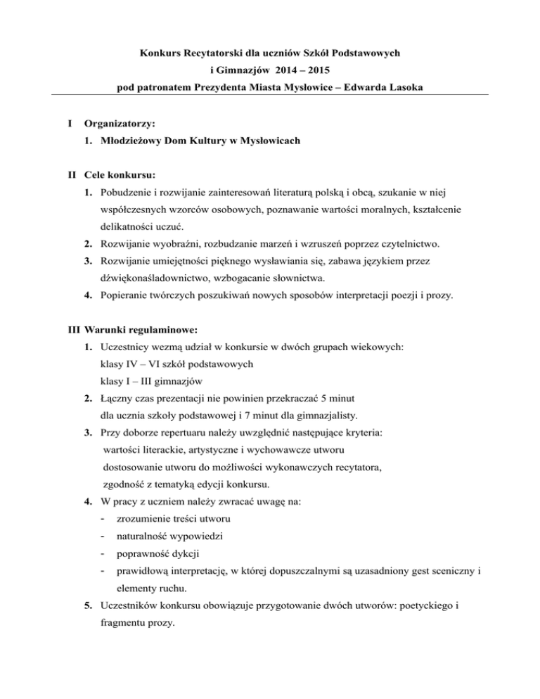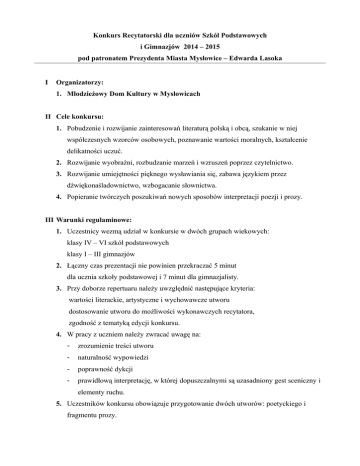 Konkurs Recytatorski dla uczniów Szkół Podstawowych i Gimnazjów 2014 – 2015 pod patronatem Prezydenta Miasta Mysłowice – Edwarda Lasoka I Organizatorzy: 1. Młodzieżowy Dom Kultury w Mysłowicach II Cele konkursu: 1. Pobudzenie i rozwijanie zainteresowań literaturą polską i obcą, szukanie w niej współczesnych wzorców osobowych, poznawanie wartości moralnych, kształcenie delikatności uczuć. 2. Rozwijanie wyobraźni, rozbudzanie marzeń i wzruszeń poprzez czytelnictwo. 3. Rozwijanie umiejętności pięknego wysławiania się, zabawa językiem przez dźwiękonaśladownictwo, wzbogacanie słownictwa. 4. Popieranie twórczych poszukiwań nowych sposobów interpretacji poezji i prozy. III Warunki regulaminowe: 1. Uczestnicy wezmą udział w konkursie w dwóch grupach wiekowych: klasy IV – VI szkół podstawowych klasy I – III gimnazjów 2. Łączny czas prezentacji nie powinien przekraczać 5 minut dla ucznia szkoły podstawowej i 7 minut dla gimnazjalisty. 3. Przy doborze repertuaru należy uwzględnić następujące kryteria: wartości literackie, artystyczne i wychowawcze utworu dostosowanie utworu do możliwości wykonawczych recytatora, zgodność z tematyką edycji konkursu. 4. W pracy z uczniem należy zwracać uwagę na: - zrozumienie treści utworu - naturalność wypowiedzi - poprawność dykcji - prawidłową interpretację, w której dopuszczalnymi są uzasadniony gest sceniczny i elementy ruchu. 5. Uczestników konkursu obowiązuje przygotowanie dwóch utworów: poetyckiego i fragmentu prozy. IV Tematyka Konkursu: GIMNAZJA POEZJA 1. W świecie słownych zabaw i rymów - ponadczasowe wiersze dla dzieci Konstantego Ildefonsa Gałczyńskiego w 110. rocznicę urodzin poety. 2. Miłość do ludzi i zwierząt w utworach Ks. Jana Twardowskiego w 100. rocznicę urodzin. PROZA 1. Problemy i moralne wybory bohaterów powieści Małgorzaty Musierowicz w 70. rocznicę urodzin pisarki 2. Pochwała aktywnego trybu życia w powieściach dla młodzieży Pawła Beręsewicza 3. Przyjaźń, miłość, samotność i cierpienie w poetyckiej baśni Antoine’a de SaintExupéry’ego Mały książę w 115. rocznicę urodzin pisarza. V SZKOŁY PODSTAWOWE POEZJA 1. Ironia, żart i dowcip w bajkach Ignacego Krasickiego. 2. Śmiesznostki i przywary bohaterów wierszy Jana Brzechwy -króla wyobraźni i ludzkich serc w 115 rocznicę urodzin poety. PROZA 1. Baśnie znane i kochane – fragmenty baśni Hansa Christiana Andersena z okazji 210. rocznicy urodzin i 140. rocznicy śmierci pisarza. 2. Przygody drewnianego pajacyka o imieniu Pinokio – wybrane fragmenty utworu Carlo Collodiego Pinokio 3. Znamy utwory Hanny Januszewskiej – autorki wielu baśni i bajek dla dzieci, VI Kryteria ocen: komisje oceniać będą prezentacje według następujących kryteriów: - dobór repertuaru, - kultura słowa, - interpretacja utworu, - ogólny wyraz artystyczny - obowiązuje pięciostopniowa skala ocen od 1 do 5, a maksymalna ilość punktów przyznana przez jurora może wynosić 20. VII Sprawy organizacyjne: 1. Zgłoszenia uczestników dokonuje się w terminie do 24 kwietnia 2015 poprzez rejestrację na stronie www.mdk.edu.pl lub bezpośrednio (wg załącznika) na adres: Młodzieżowy Dom Kultury ul. Powstańców 6 41-400 Mysłowice tel/fax: 32 222-25-45 2. Przesłuchania konkursowe odbędą się: 18,19 maja 2015 r. w Młodzieżowym Domu Kultury w Mysłowicach. O dokładnym terminie występu (data, godzina) uczestnicy zostaną powiadomieni po zamknięciu listy zgłoszeń. 3. „Kartę zgłoszenia i oceny recytatora” należy wypełnić dla każdego uczestnika i przesłać w terminie do 24.04.2015 r. (nie dotyczy zgłoszeń przesyłanych elektronicznie). Szkołę mogą reprezentować najwyżej 2 osoby w każdej z grup wiekowych. W załączeniu: Karta zgłoszenia i oceny recytatora. KARTA ZGŁOSZENIA I OCENY RECYTATORA 1. Imię i nazwisko recytatora …………...................………………………………………................ klasa ……...……… placówka ……………................………………………………………………. telefon do szkoły ……………………………………...................…………………………………... 2. Imię i nazwisko nauczyciela, który przygotował recytatora (telefon kontaktowy) …..................... …………………………………………………………………………………………....................... REPERTUAR Lp. Autor Tytuł Czas OCENA Lp. 1. 2. 3. 4. Kryteria oceny Dobór repertuaru Kultura słowa, dykcja, czystość głosu Interpretacja Ogólny wyraz artystyczny Podsumowanie punktacji Punktacja poezji Punktacja prozy Uwagi końcowe